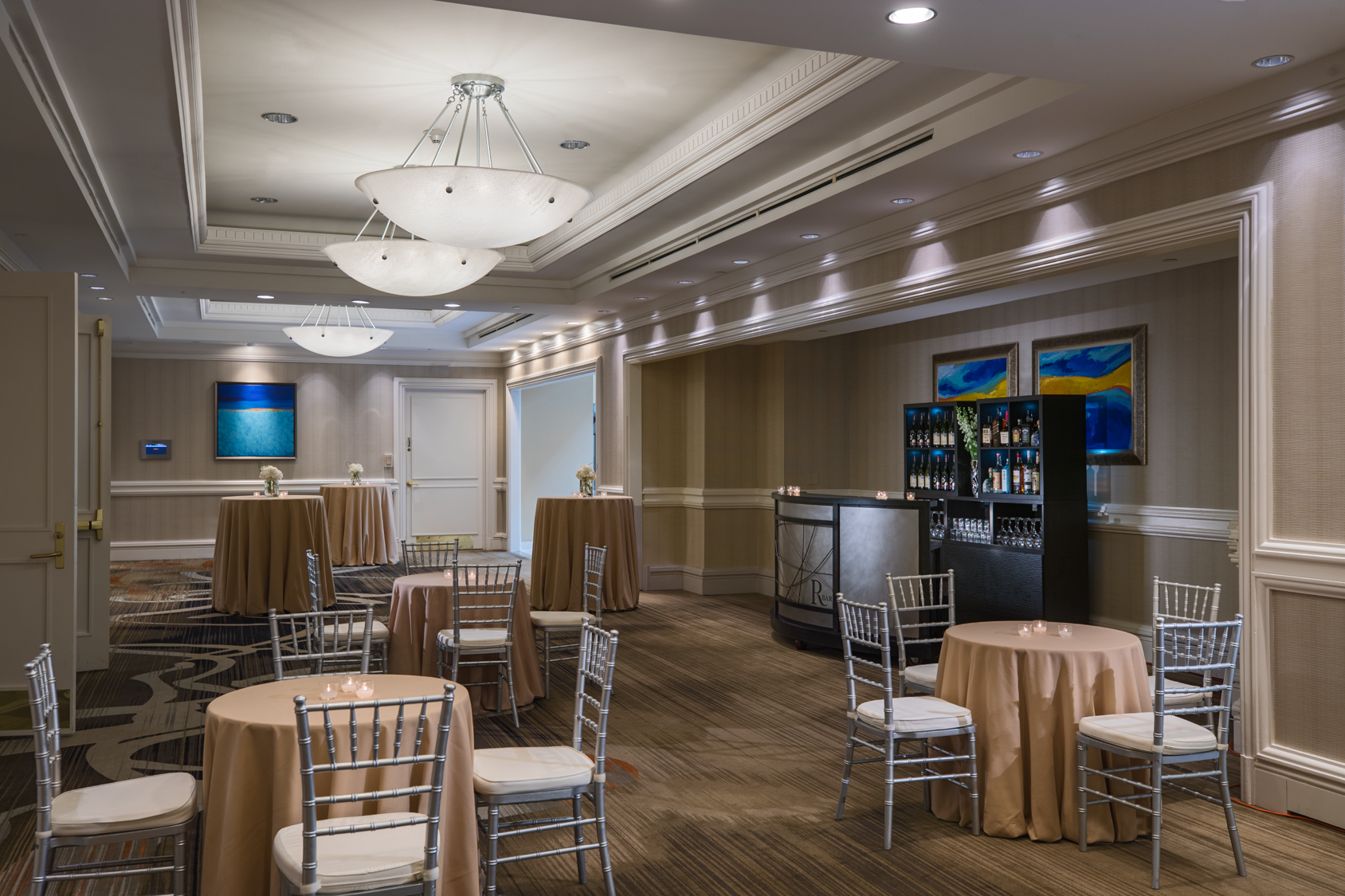 The Crystal Ballroom is adjacent to the Atrium Lobby and is divisible into 5 individual spaces, with 18 ft. ceilings, over 2,000 sq. ft. of pre-function space, convenient to Hotel elevators, meeting planner office and secure registration desk located adjacent to the ballroom foyer, upholstered and sound-secure air wall systems for maximum sound protection, multiple rigging points throughout and convenient to Hotel loading docks and on-site FedEx services.