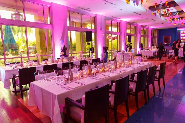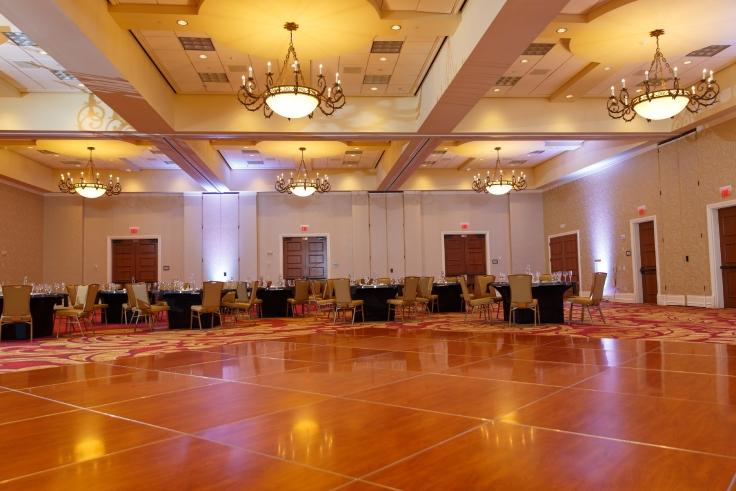 7,920 square feet, accommodating up to 530 guests for seated banquets. Smaller sections available for more intimate receptions. Enhanced by bold Mediterranean colors and Italian crystal chandeliers