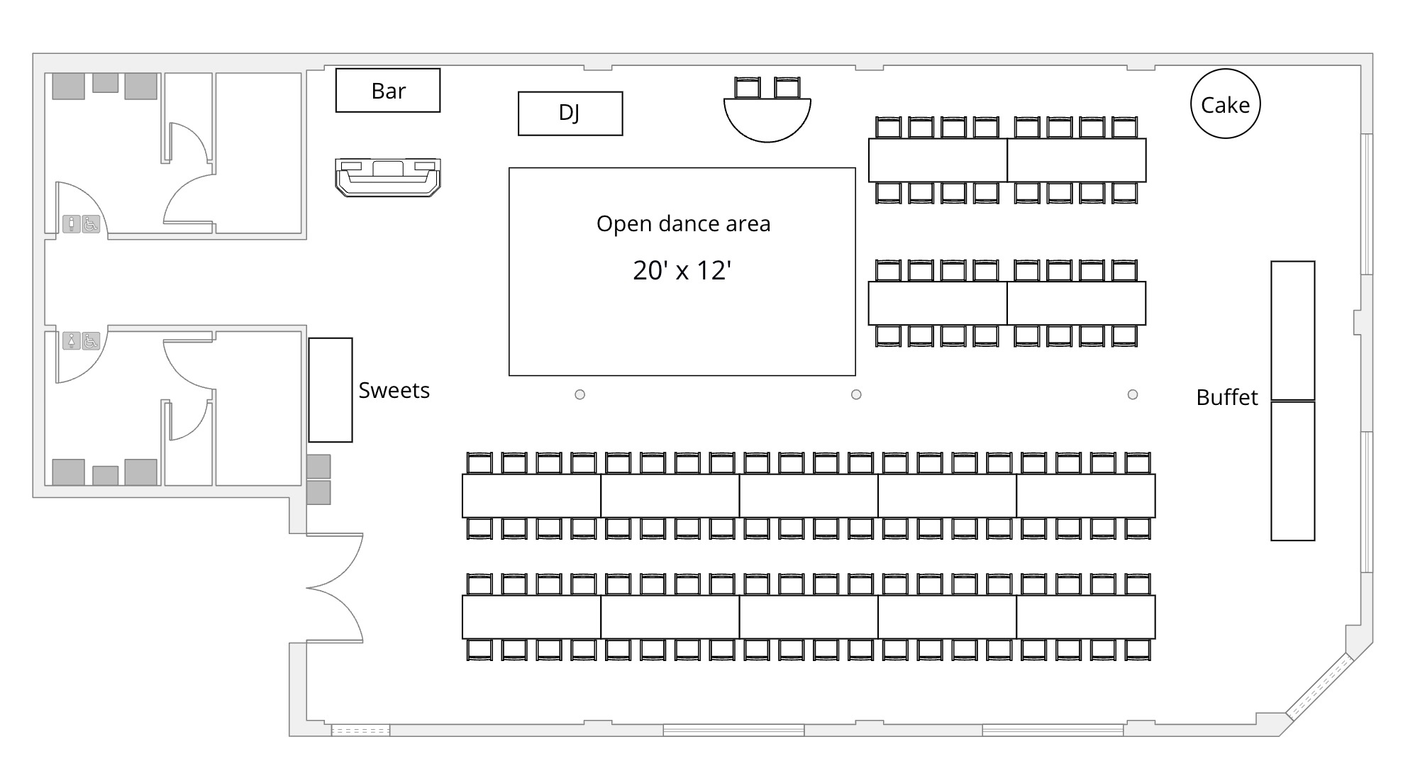 The Essentials: Insurance Cashless Bar Tables + Chairs Choice of table linens Floor plan setup of tables & chairs Audio/Visual: • Two wireless handheld mics • Two ceiling-mounted Epson projectors • Bose L1 Pro16 Line Array Bluetooth speaker • Two wall-mounted projector screens Amenities: • A/C • WIFI • Water fountain with bottle filler • Outdoor patio with string lights • Professional Art Gallery Hanging System • Catering prep room with 3-compartment/hand sink, fridge, warmer, ice maker