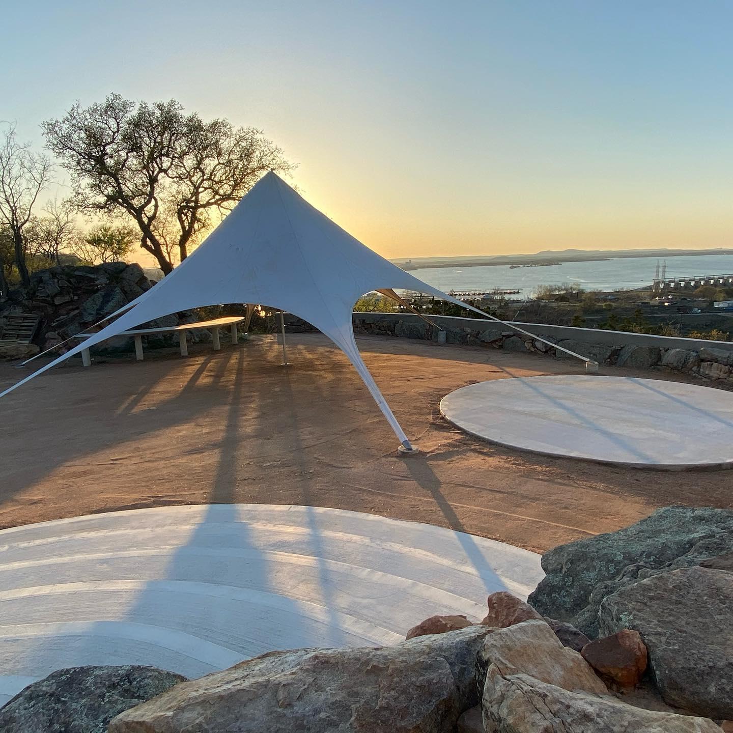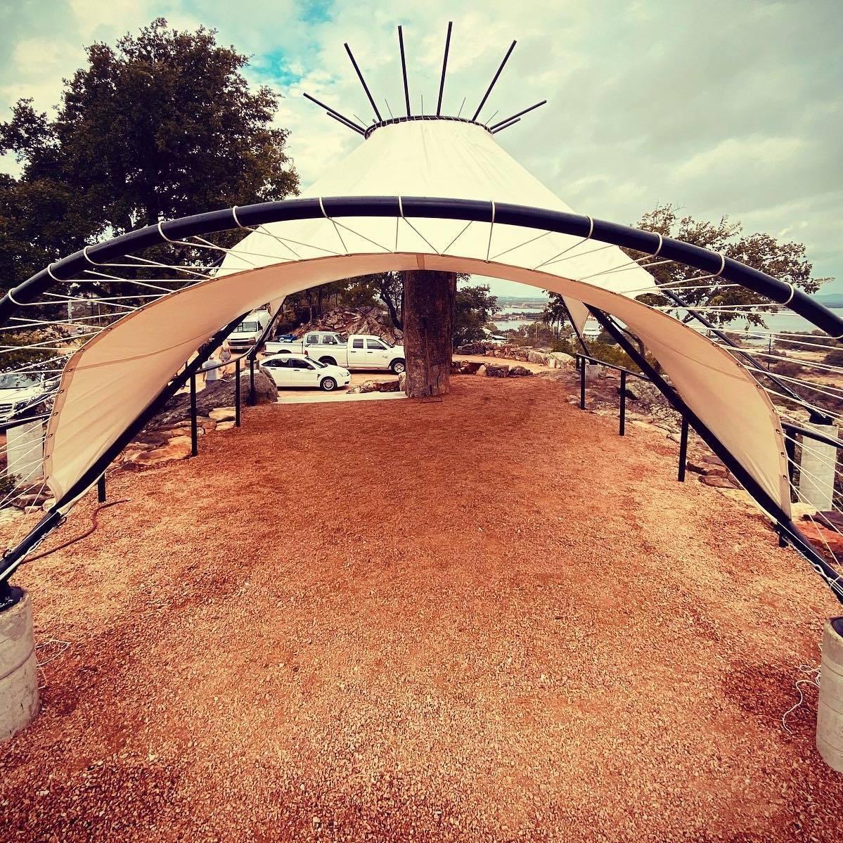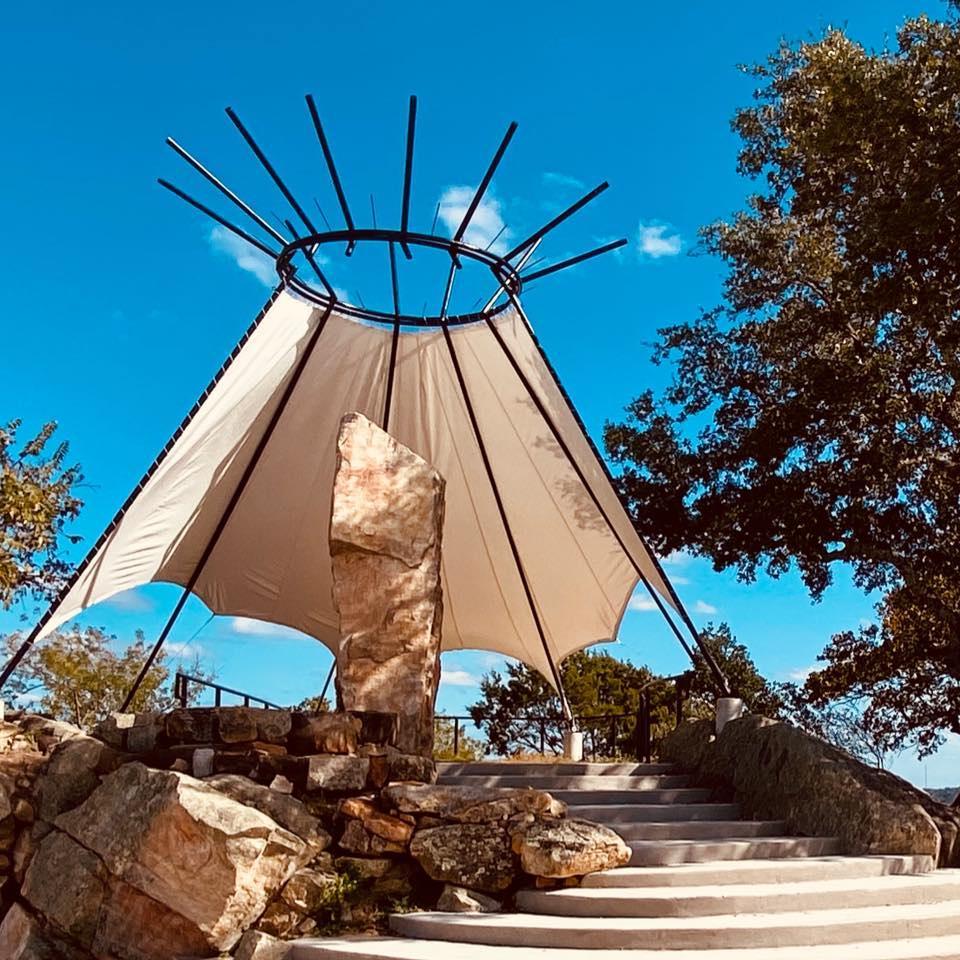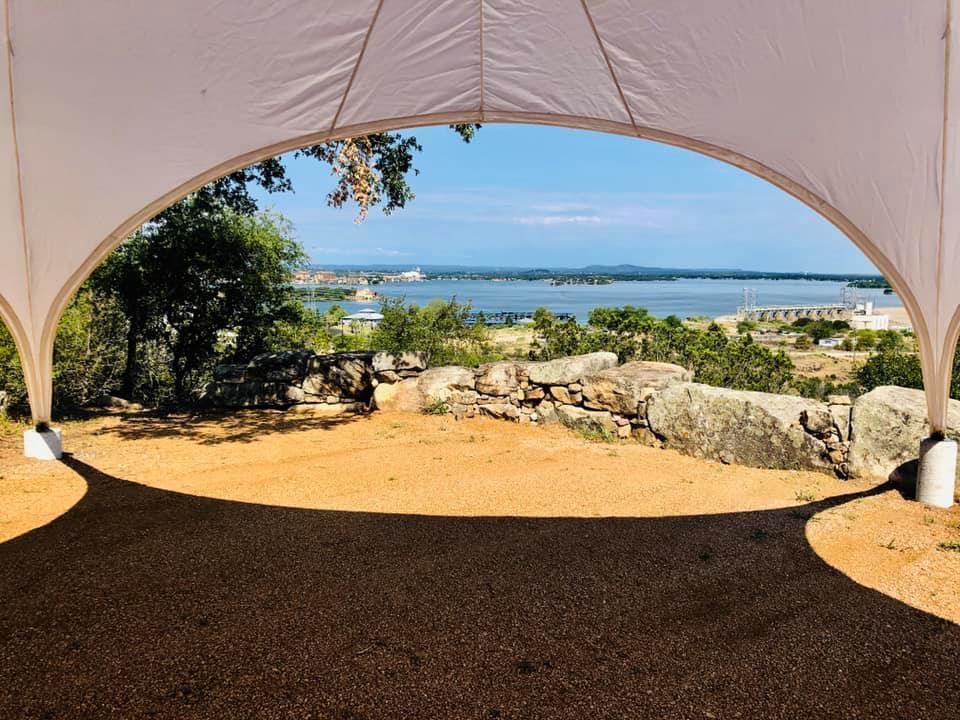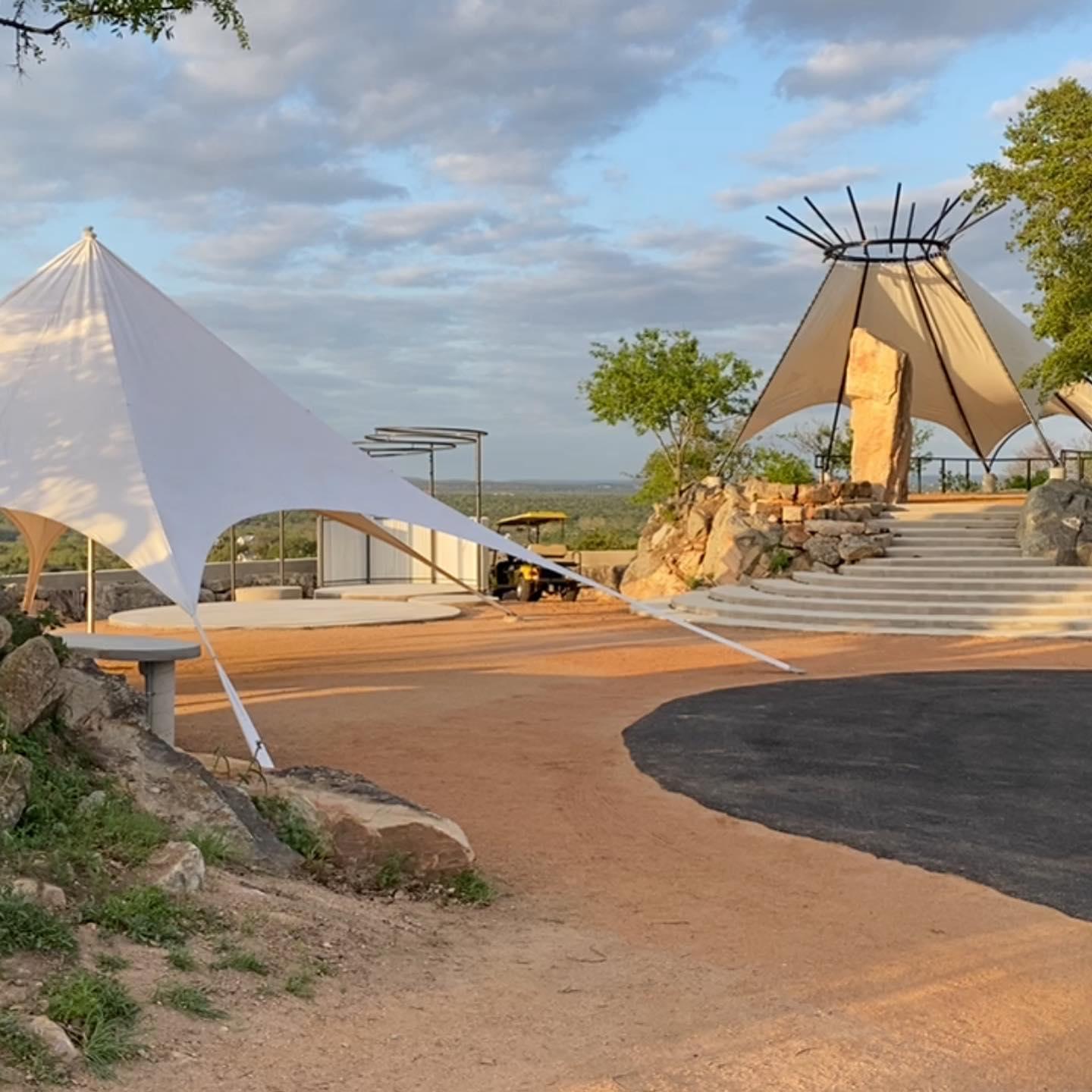 Located in Marble Falls, Texas, Hozhoni on the Hill is a park and outdoor wedding venue. Offering premier glamping opportunities in the Texas Hill Country, this destination in a desirable retreat. Complete with stunning and awe-inspiring views, Hozhoni on the Hill can be an ideal celebration location. Hozhoni on the Hill has a chapel where couples can hold their memorable and precious ceremony. At this spot, couples and their guests will encounter a large standing stone and a sun-sheltered tipi-like structure. Blended into the landscape, a set of stairs leads up to the chapel's location. Amplifying the beauty of the area, foliage and trees offer shades of green, reminding all present of the nature that surrounds them. Following the exchange of vows, couples will have the option to host an on-site reception. The area where this takes place is perched high upon a hilltop, surrounded by vistas of Texas hill country and lakes LBJ and Marble Falls.