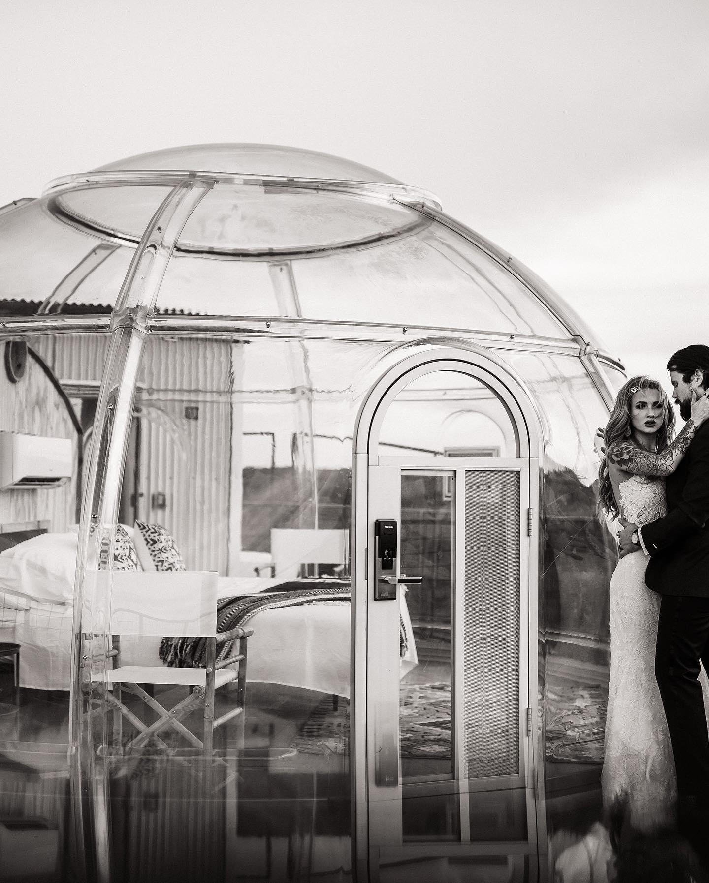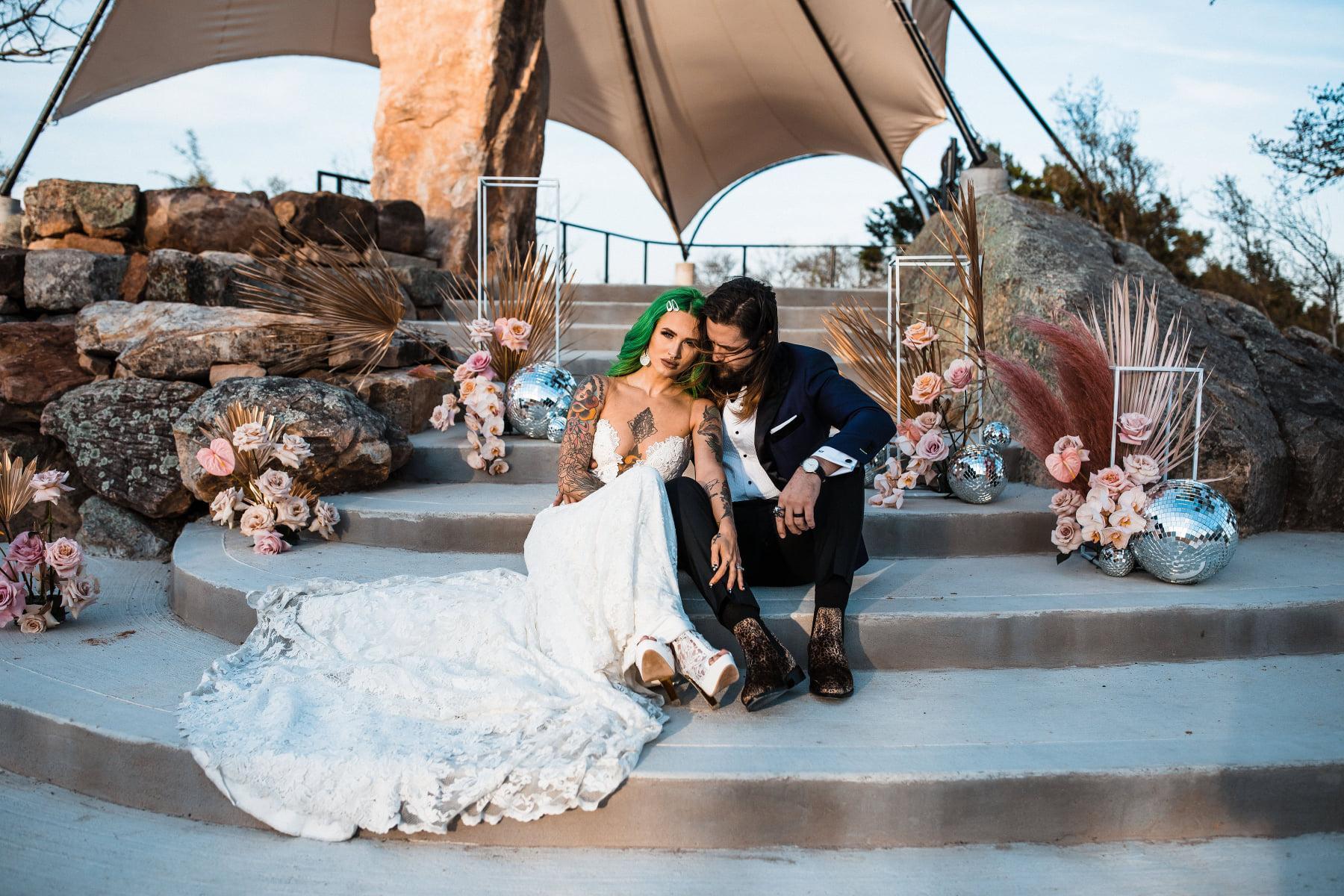 Chapel Hozhoni. Capping the summit perches a steel and fabric tepee. The structure hovers over a giant stone monolith; The Rock of Faith. The chapel arches open to an uncompromising full circle view of water, rock and sky. The couple captured in the Space Between sparks the Fire of Hope. Promises are shared facing East into endless advancing tomorrows. Waving concrete steps rise in hope as lovers swing from a huge steel ring and together tie the *not*