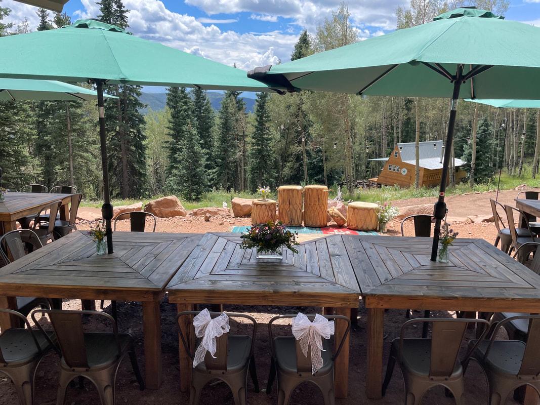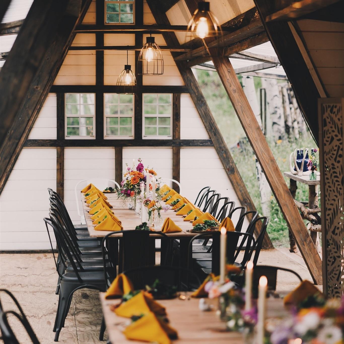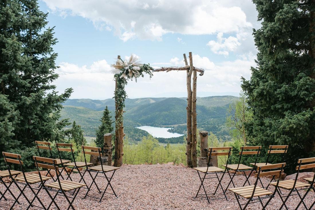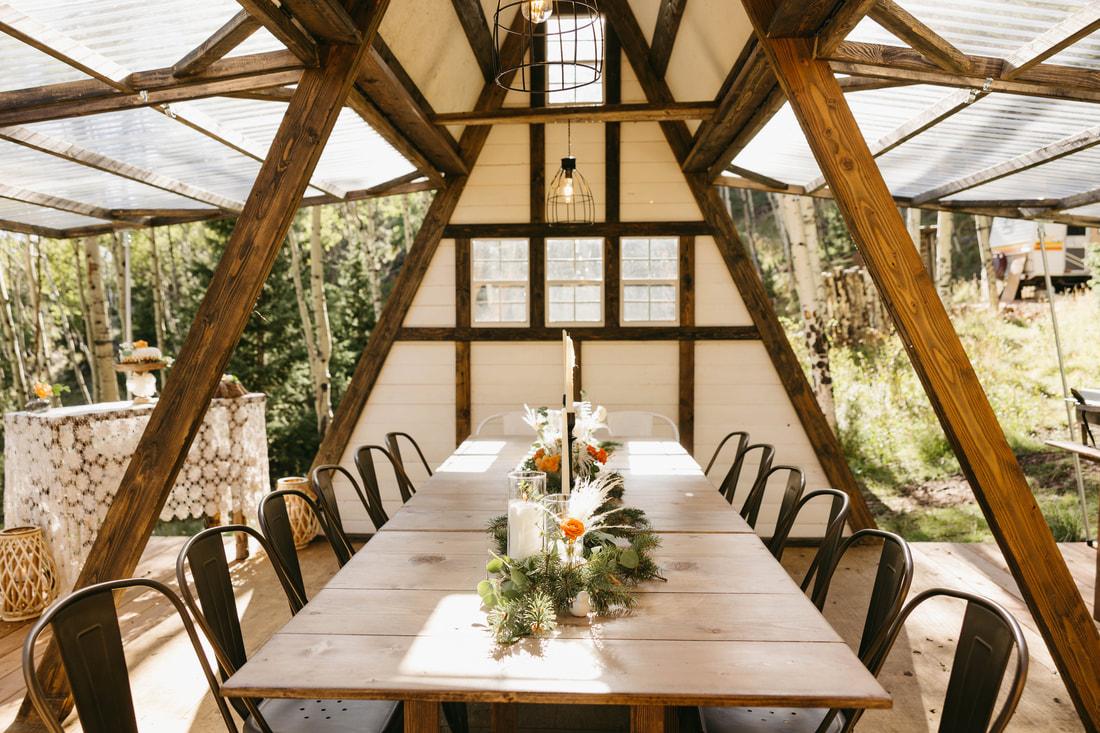 The Eagles Nest wedding deck includes our custom aspen wedding arch, changing area for the bride and bridesmaids in the Eagle's nest A-frame with cozy wood burning stove, leather chairs and sofa where you can relax, laugh and get ready for the ceremony. Groom and groomsmen get ready in the nearby groom/groomsmen hangout camper with kitchen, bathroom, bed, dining table and benches. Your guests will have an awe inspiring view, a relaxing atmosphere and staff including a wedding coordinator to make sure you and those you love have a memorable day in all the best ways!!