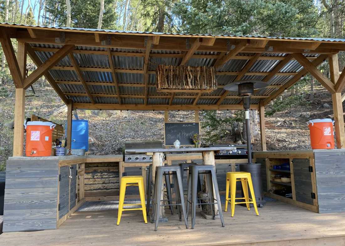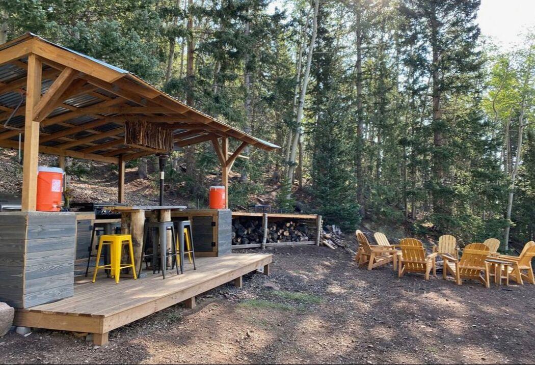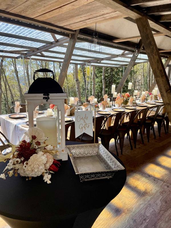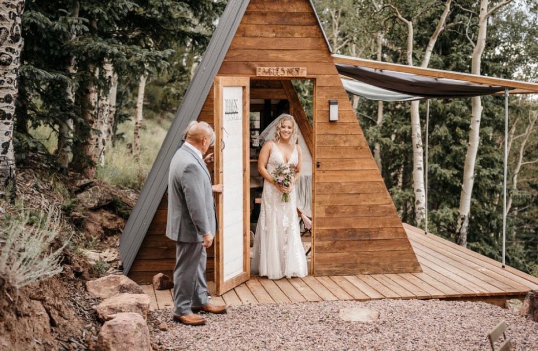 The Eagles Nest wedding deck includes our custom aspen wedding arch, changing area for the bride and bridesmaids in the Eagle's nest A-frame with cozy wood burning stove, leather chairs and sofa where you can relax, laugh and get ready for the ceremony. Groom and groomsmen get ready in the nearby groom/groomsmen hangout camper with kitchen, bathroom, bed, dining table and benches. Your guests will have an awe inspiring view, a relaxing atmosphere and staff including a wedding coordinator to make sure you and those you love have a memorable day in all the best ways!!