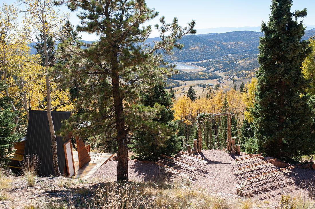 The Goldbug Rock Ledge offers an intimate setting for elopements or intimate ceremonies for up to 10 guests. It is secluded with amazing views and has an A-frame for cover in case of inclement weather or for guests to be seated inside if preferred. This space has a beautiful bridal path leading to the magnificent rock ledge ceremony and photo site. Goldbug has a wood burning stove and is cozy with views of Pring Reservoir and the Sangre de Cristo Mountain range.
