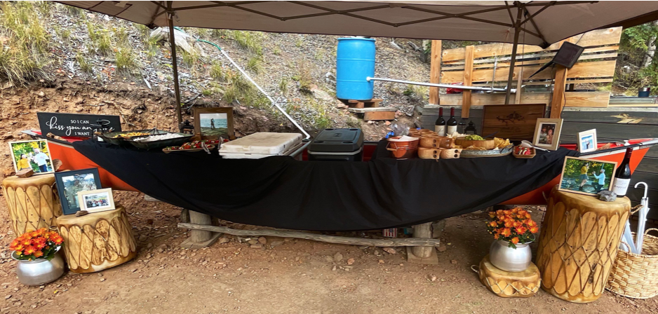The Ridge is a perfect spot for your outdoor reception or more casual camp wedding for a larger group. It can easily accommodate up to 40 guests. The outdoor kitchen is completely stocked, with a grill, a griddle, sink, running water, single and double camp stoves everything we need to prepare amazing meals and snacks. The canoe cantina (yes, it's a real canoe!) has 2 cooler inserts for drinks and while you are taking pictures after the ceremony, we serve yummy hors-d'oeuvres for your guests to enjoy until you arrive. Relax and enjoy the custom Adirondack chairs around our large 12 seat fire pit. There is corn hole, axe throwing, darts, tiki toss, bocci ball and a hammock hangout in the trees for guests to use during their visit at RHIZE.