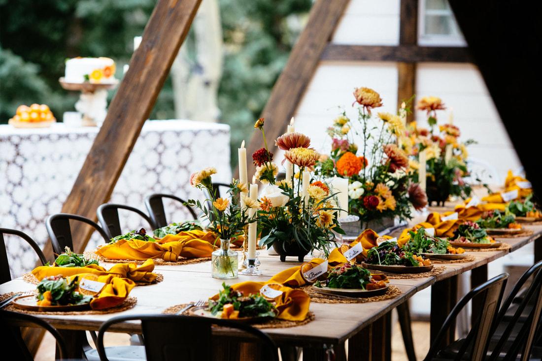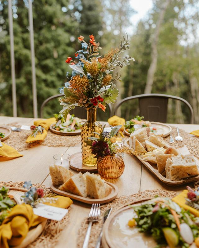 The Hummingbird Barn is perfect for an indoor/outdoor reception that can serve up to 40 seated guests for dinner or for stand up cocktails and hors-d'oeuvres. Fully stocked kitchen with all tableware. At RHIZE, we cherish our environment so we use wood salad plates, compostable bamboo products and cups as well as cloth napkins. The barn comes equipped with stove top, oven, sink, running water and a restroom. Classic, simple decor is a signature of RHIZE. We have a selection of table landscapes for you to choose from or allow us to take that off your hands and create a setting that is romantic, rustic and refined.