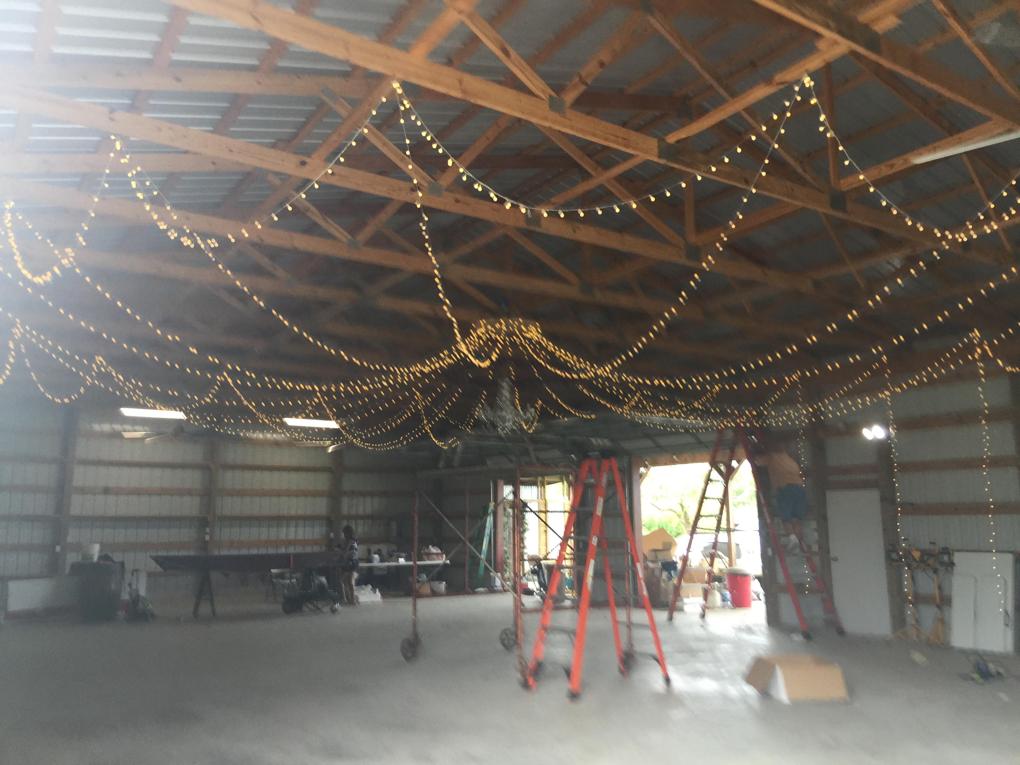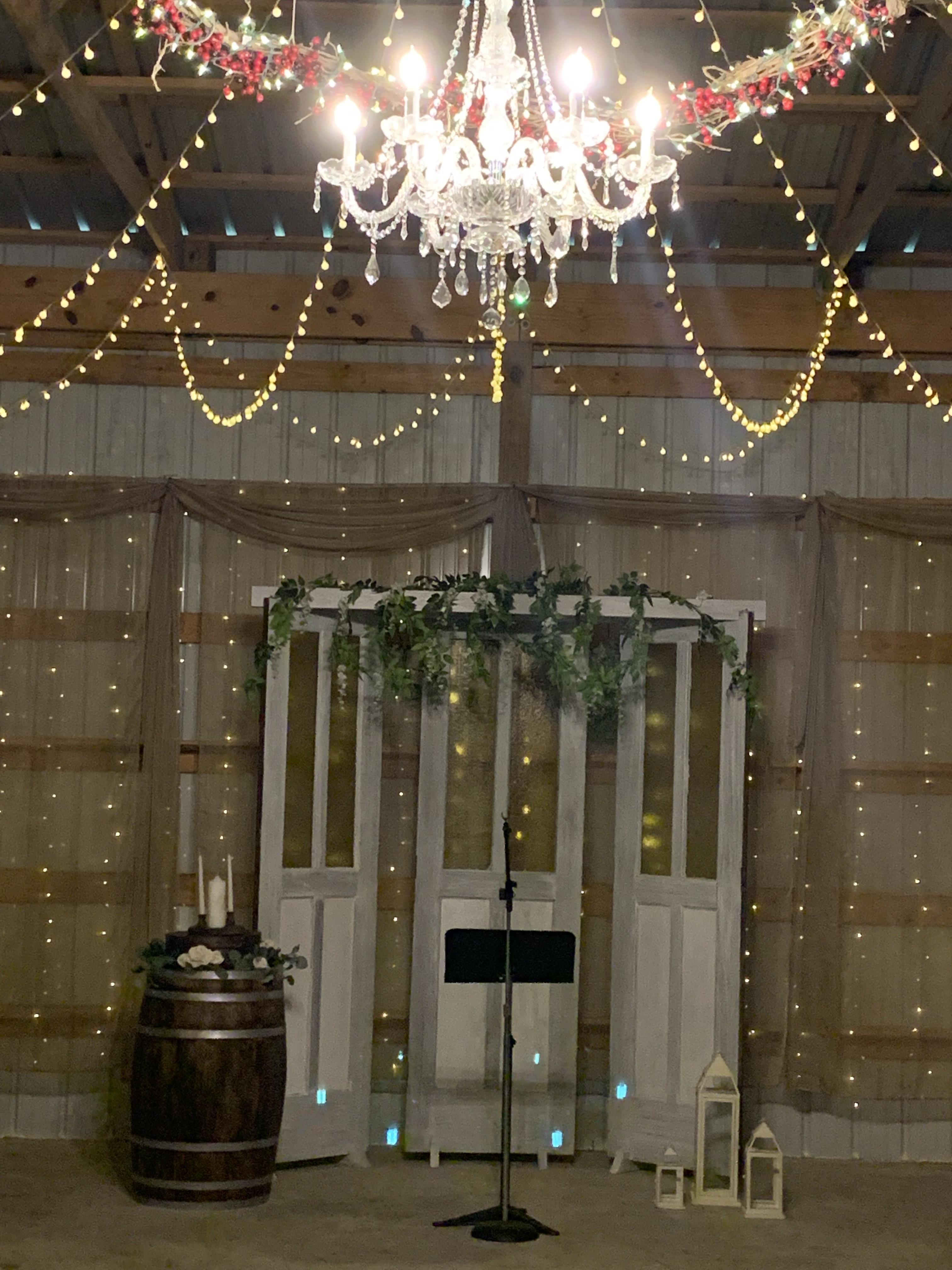 This space feature exposed beams with twinkle light and a crystal chandlier.