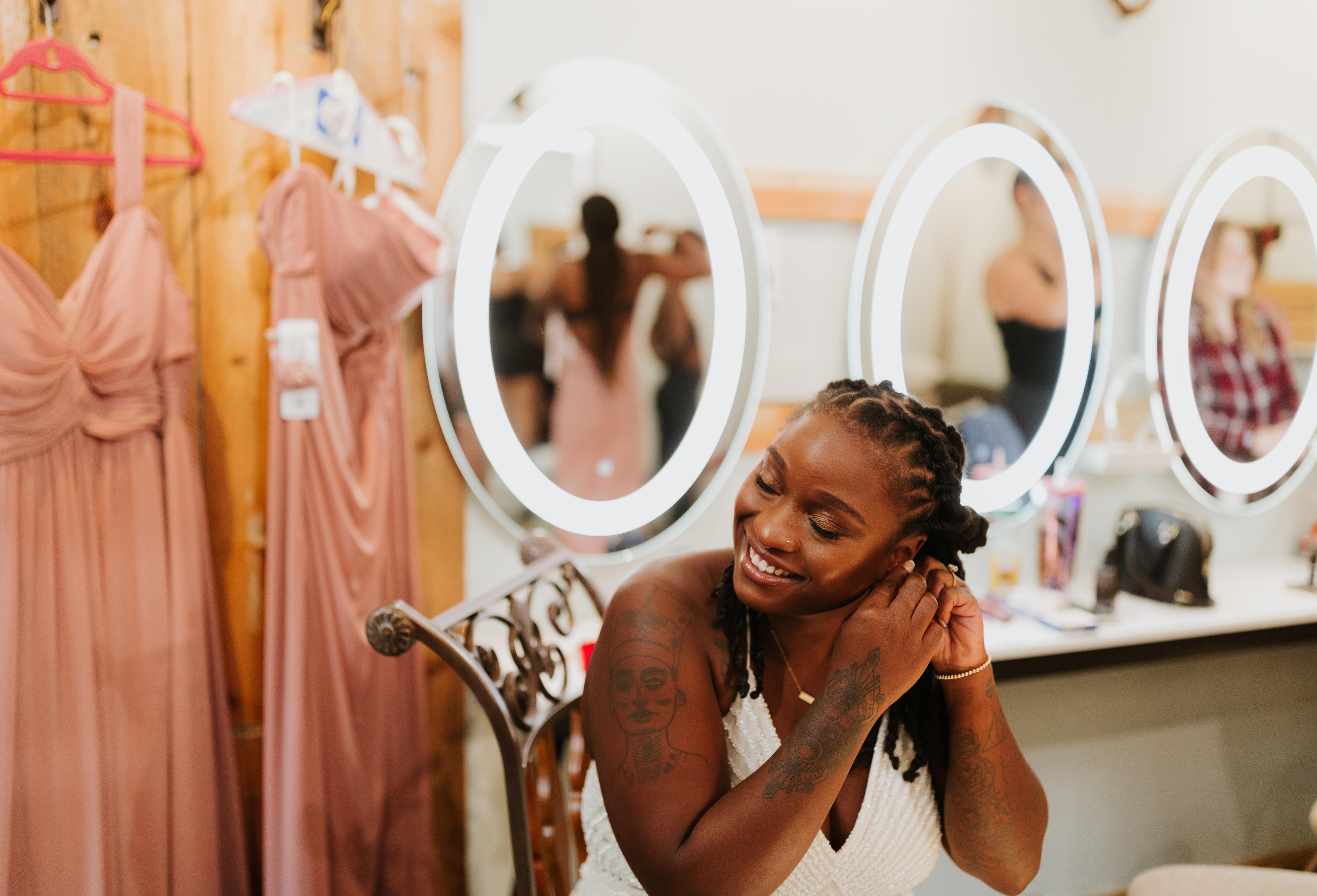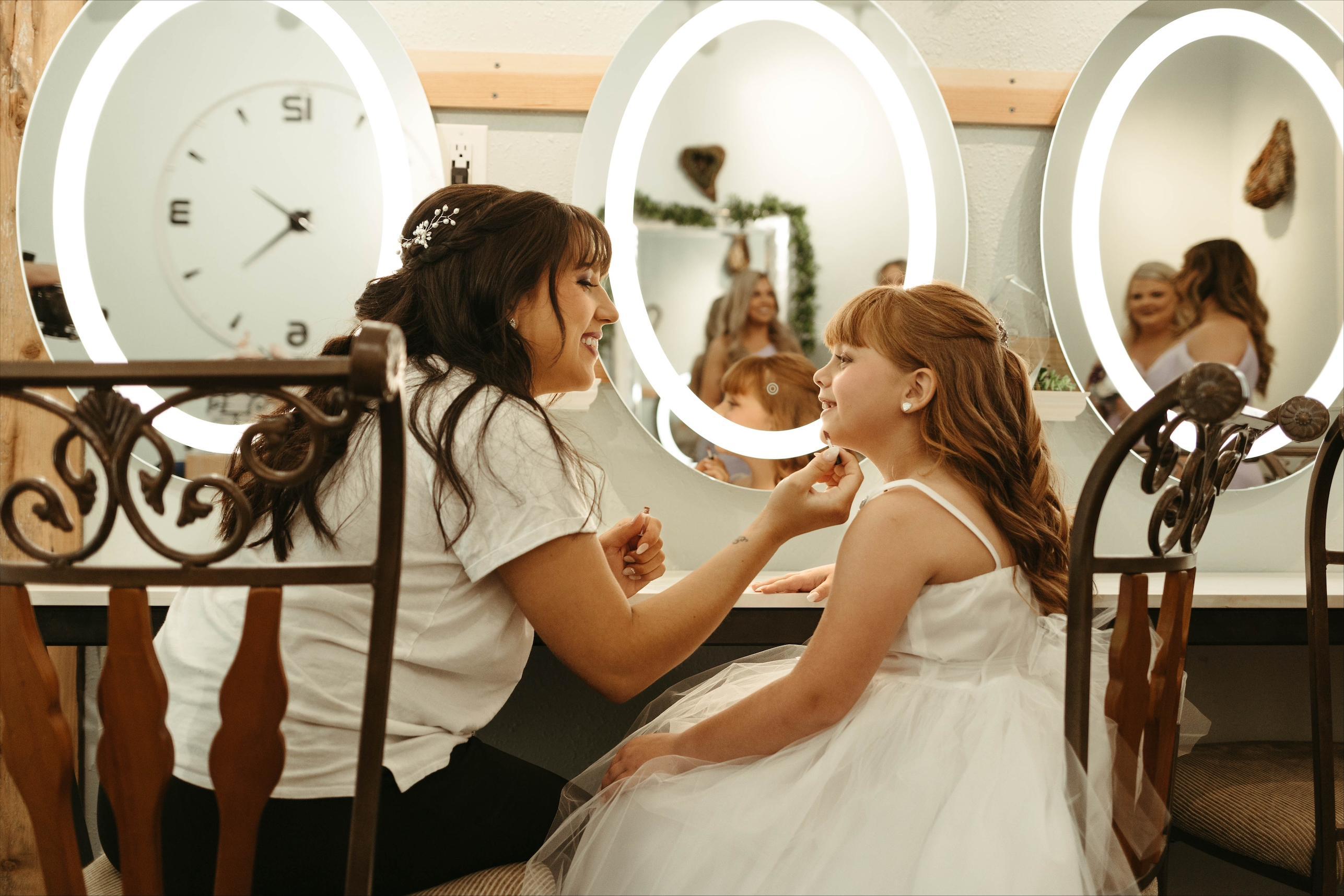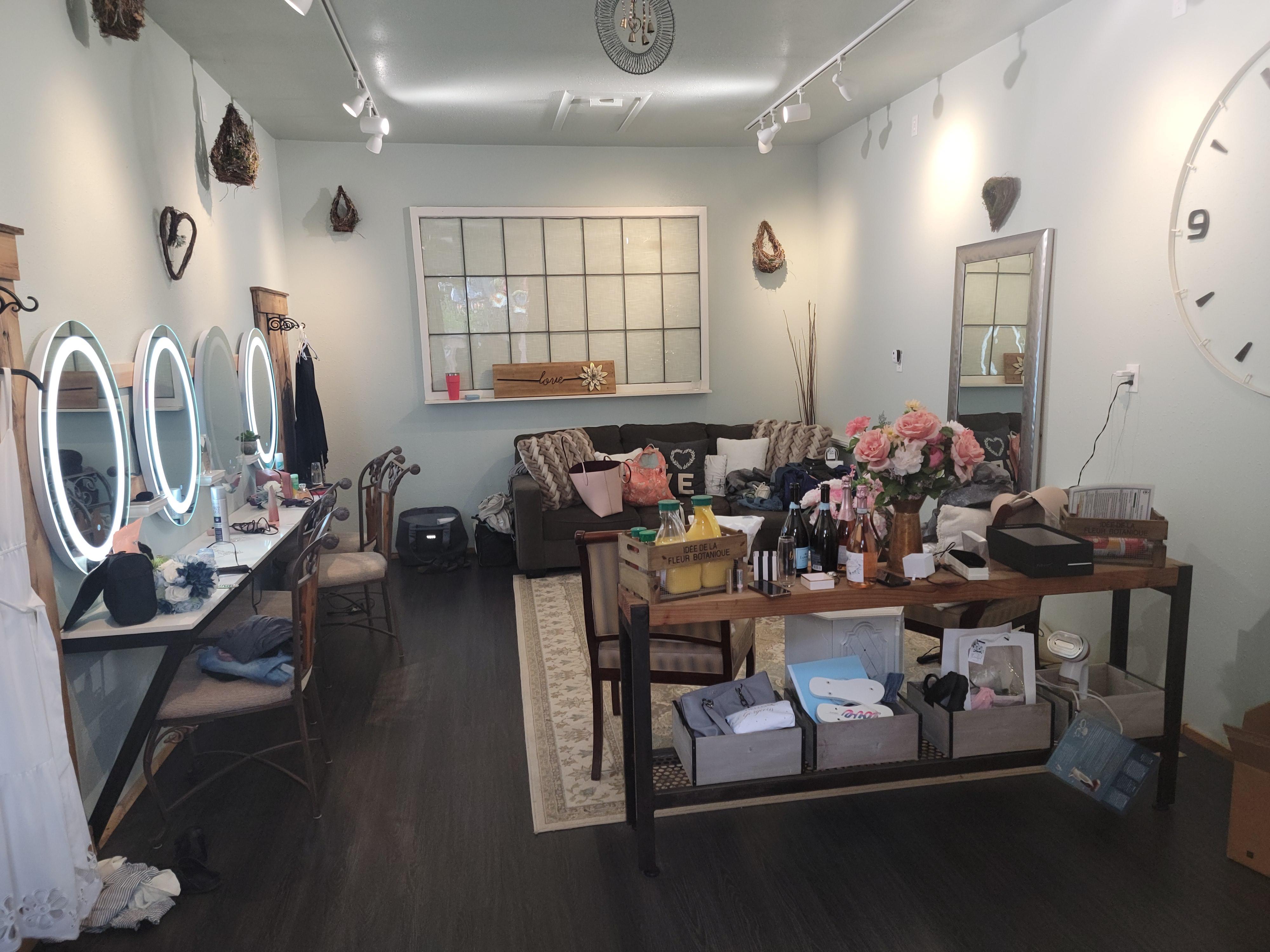Featuring four make-up stations with lighted mirrors, two floor-length mirrors, plenty of seating and lighting, and a private outdoor courtyard with seating