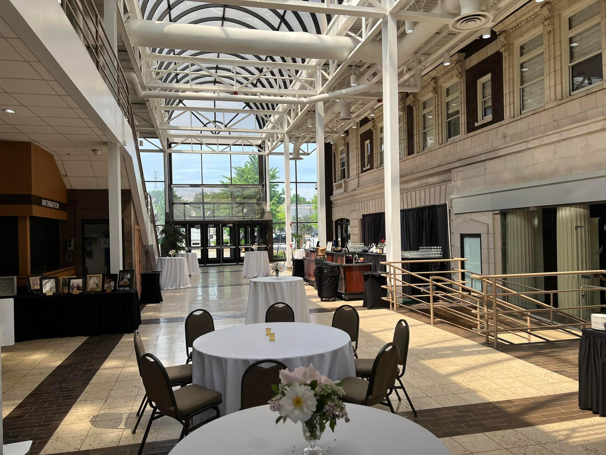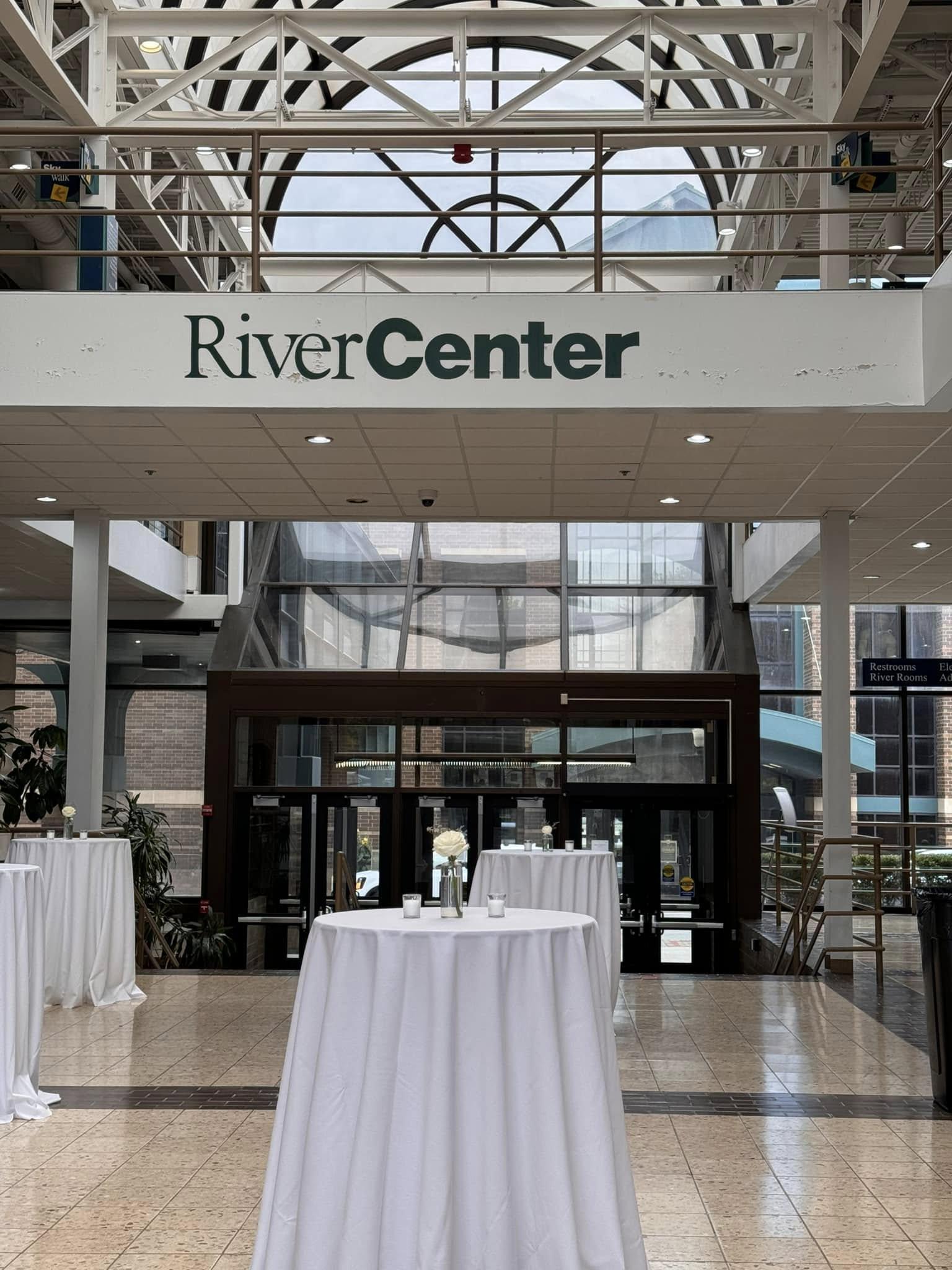 Flooded with natural light and framed by soaring glass ceilings and historic architectural details, the Atrium at the RiverCenter offers a truly unique setting. The space beautifully blends old-world charm with modern design, featuring exposed brick, grand windows, and a bright, airy ambiance. Its seamless connection to other RiverCenter spaces also makes it ideal for multi-part events.