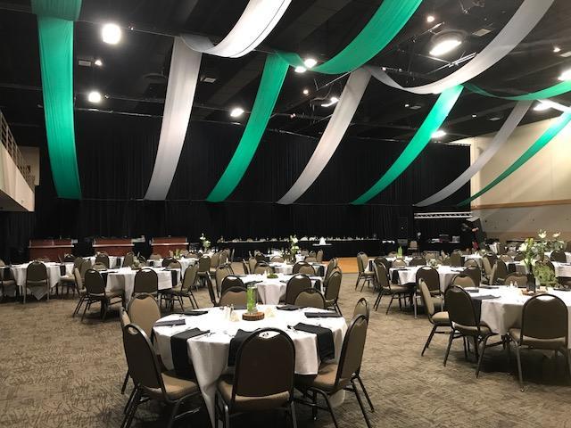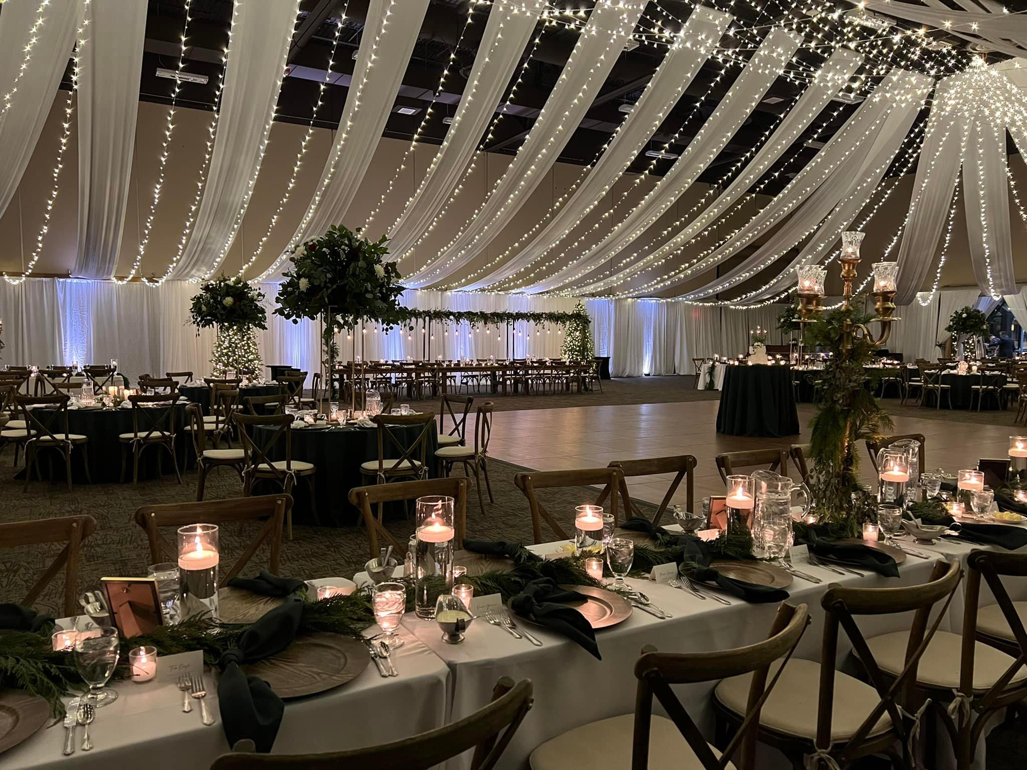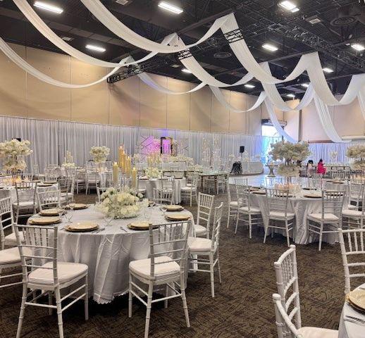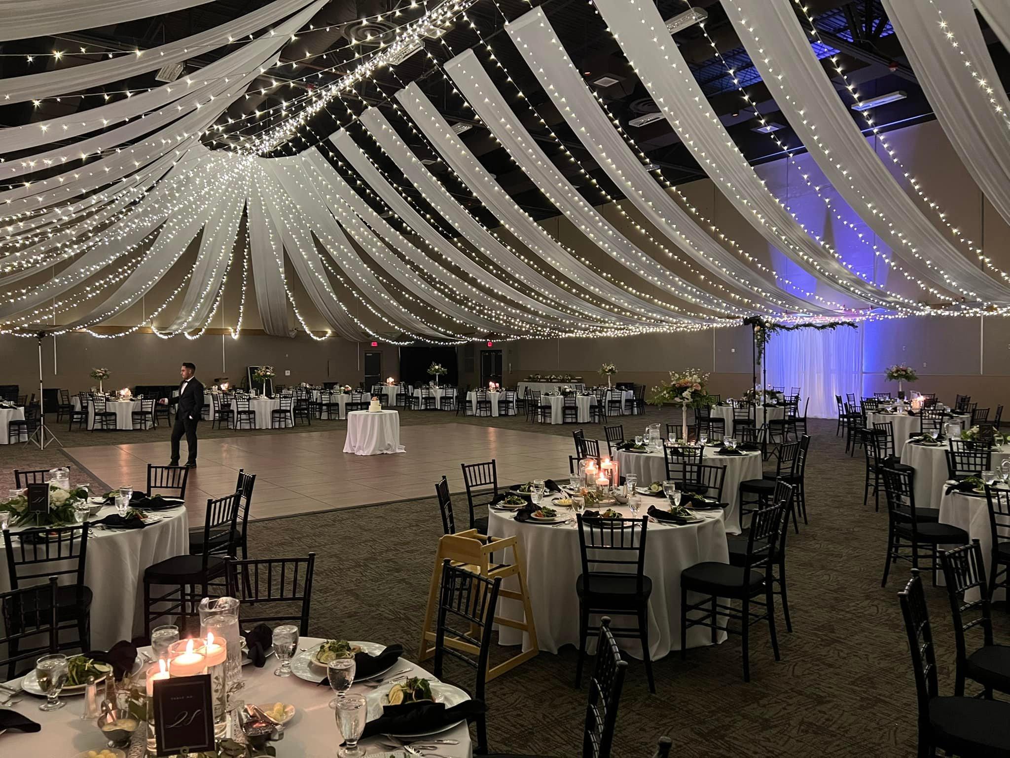 Step into the breathtaking beauty of Mississippi Hall, one of the RiverCenter’s most stunning and adaptable event spaces. Designed with timeless elegance in mind, this spacious hall features soaring ceilings adorned with flowing drapery and sparkling string lights, creating a romantic ambiance that’s perfect for weddings, banquets, and formal celebrations. Customizable layouts, high-end lighting options, and elegant finishes allow you to personalize the space to match your vision.