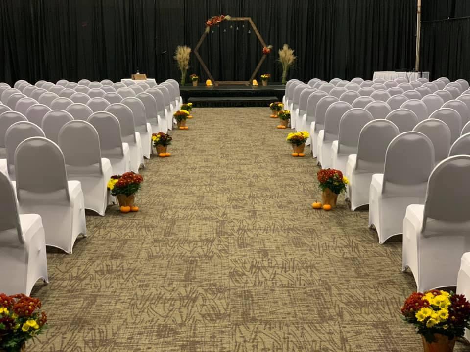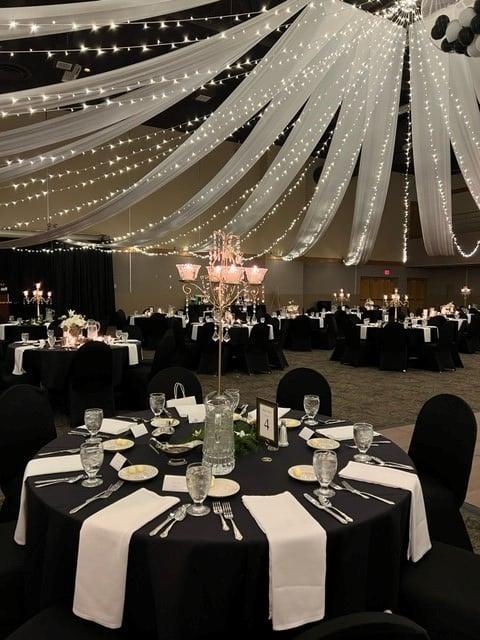 - 72” Round Tables (seats 8-10 people) - 6ft Tables - Chairs - Dance Floor - Head Table on riser - Table Linens in Black or White - Linen Napkins in Black or White
