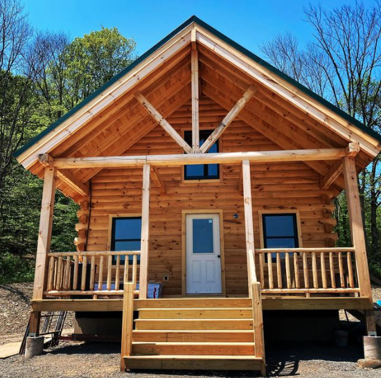 A fully furnished cabin that can be used as a groomsman suite or getting ready space. It includes an outdoor screened in porch, one bedroom, a loft, and a full kitchen.