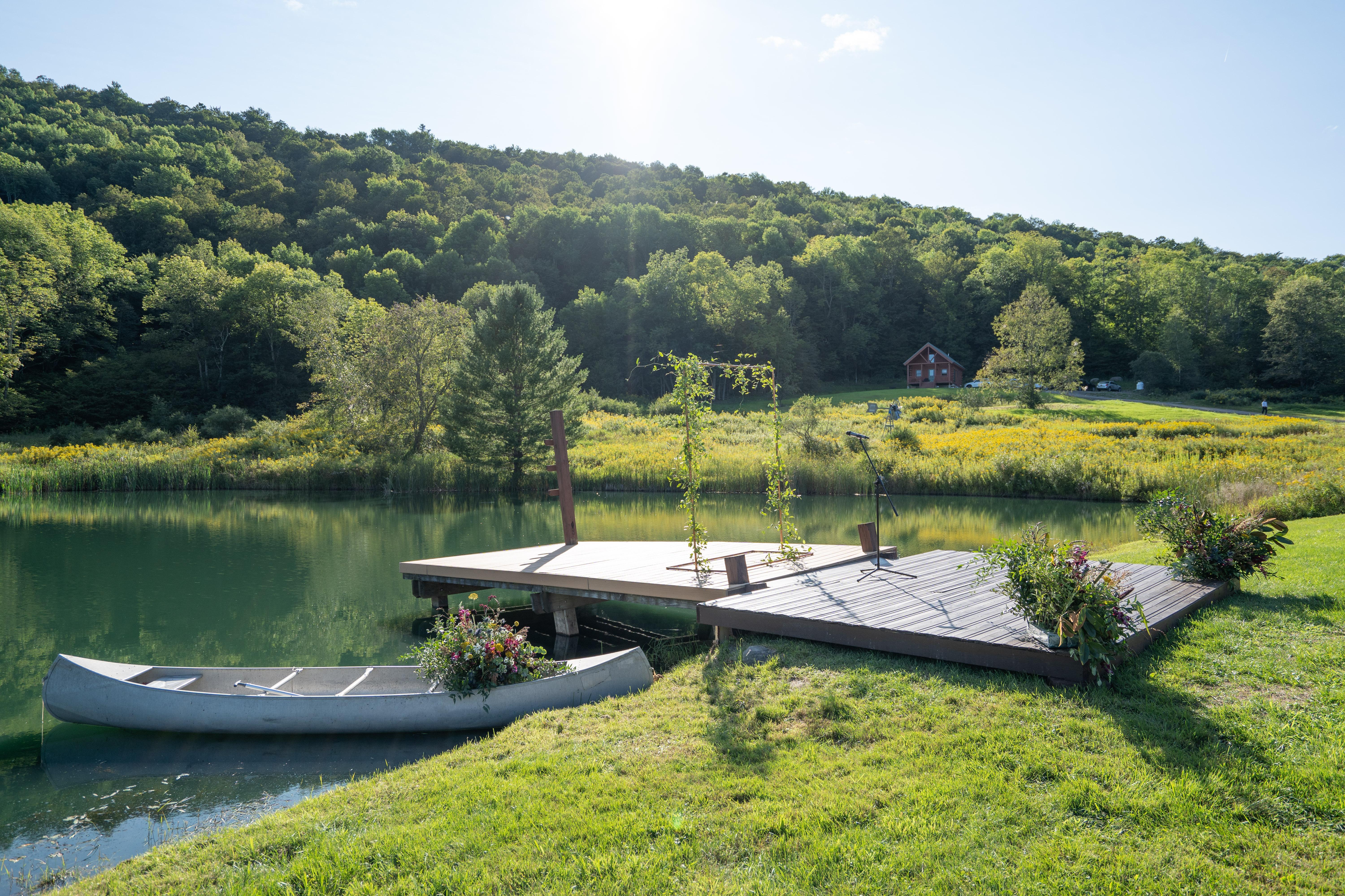 A beautiful natural landscape for an outdoor ceremony area that includes a dock, canoe, and wildflowers. Wooden benches available.
