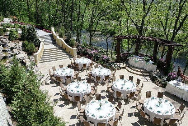 Guests gather around on a spacious outdoor patio, basking in the beauty of the outdoors and savoring a tree-filled backdrop. Your vows are echoed only by the sounds of nature as a tree-shaded mountain stream murmurs softly and a waterfall babbles in the background. Our outdoor wedding patio is the perfect place to host a memorable ceremony, reception or other function.