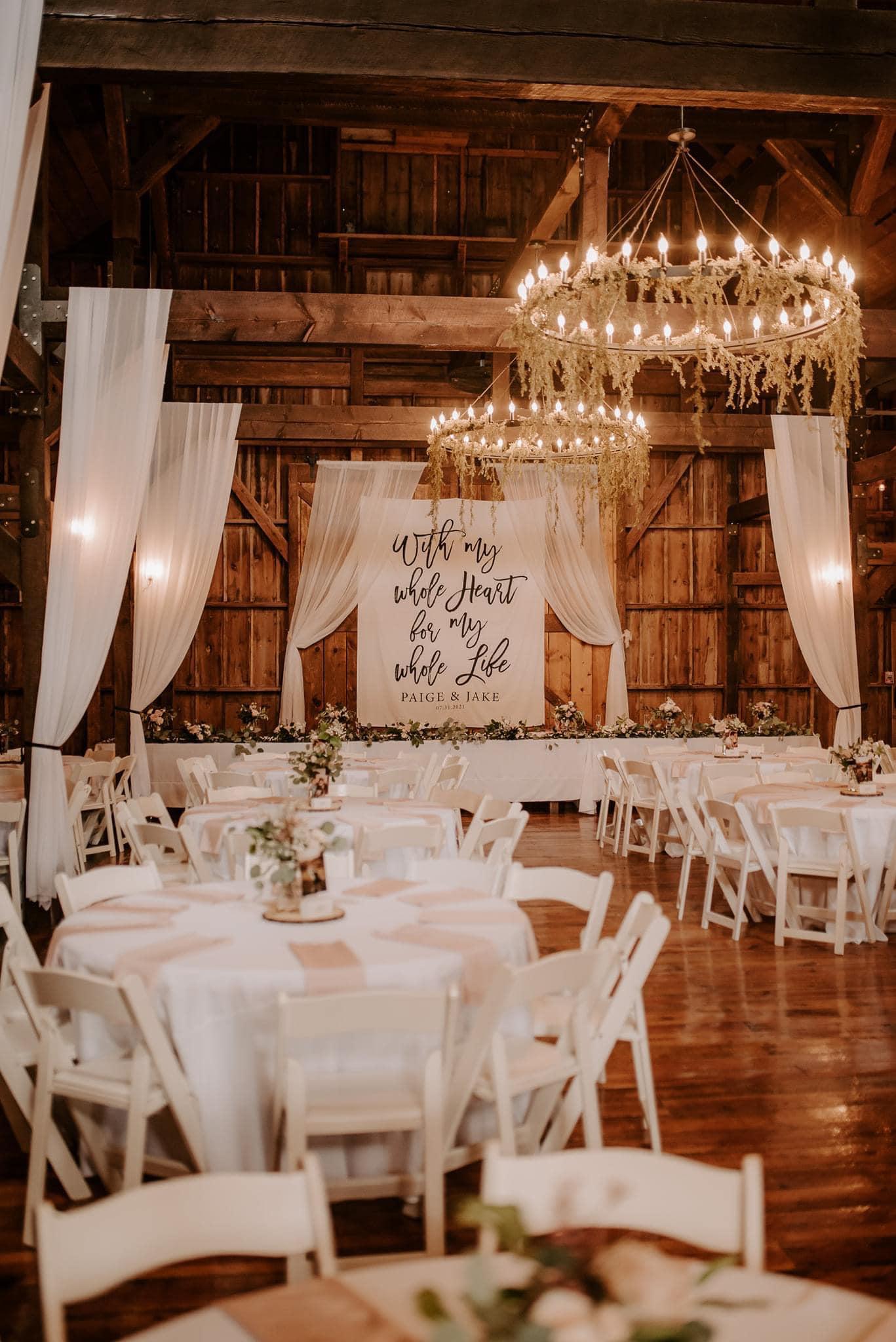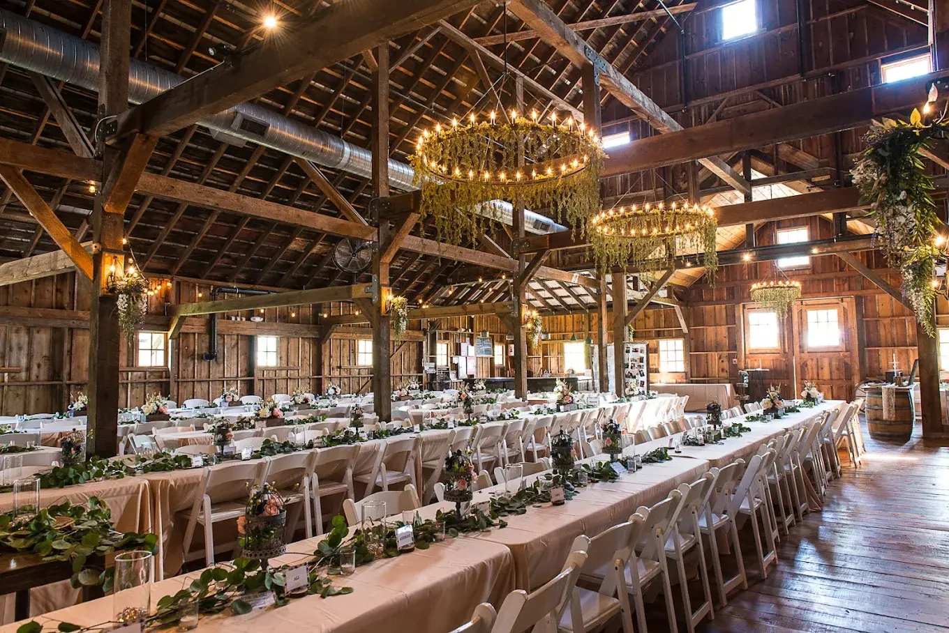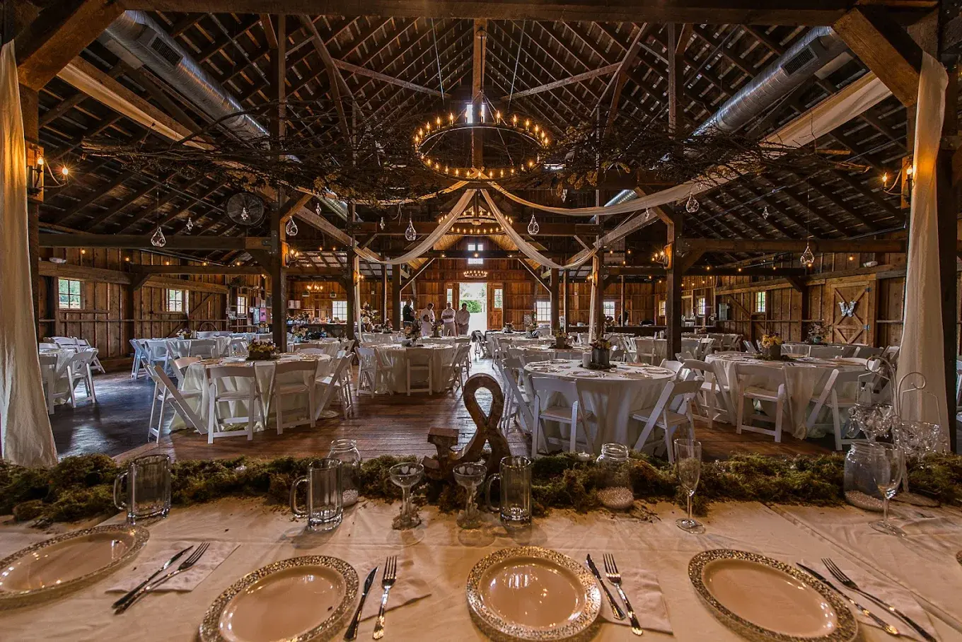 The weathered barn wood walls and hand-carved Amish doors is just the start of the rustic elegance. Chandeliers, vintage lanterns, and cafe lights brighten the space. The former dirt floor has been replaced with wood – perfect for line dances, sock hops, electric slides, and chicken dances. A large bar near the entrance is the ideal spot for guests to wet their whistles. French doors lead to an additional 3,100 square feet deck that overlooks Salt Creek. Here, among the towering oaks and picturesque farmland, guests can enjoy campfire pits while youngsters play on nearby structures.