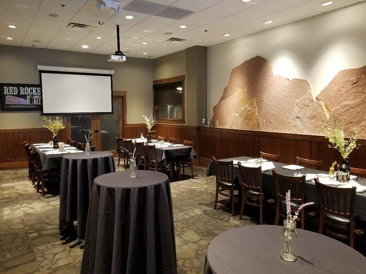 The Red Rocks Room comfortably accommodates up to 45 guests, whether seated or in a reception-style setup. It features a projector, large projection screen, and flat-screen TV, all available at no additional charge. With flexible seating arrangements, it’s an ideal space for plated dinners, buffets, or cocktail receptions.