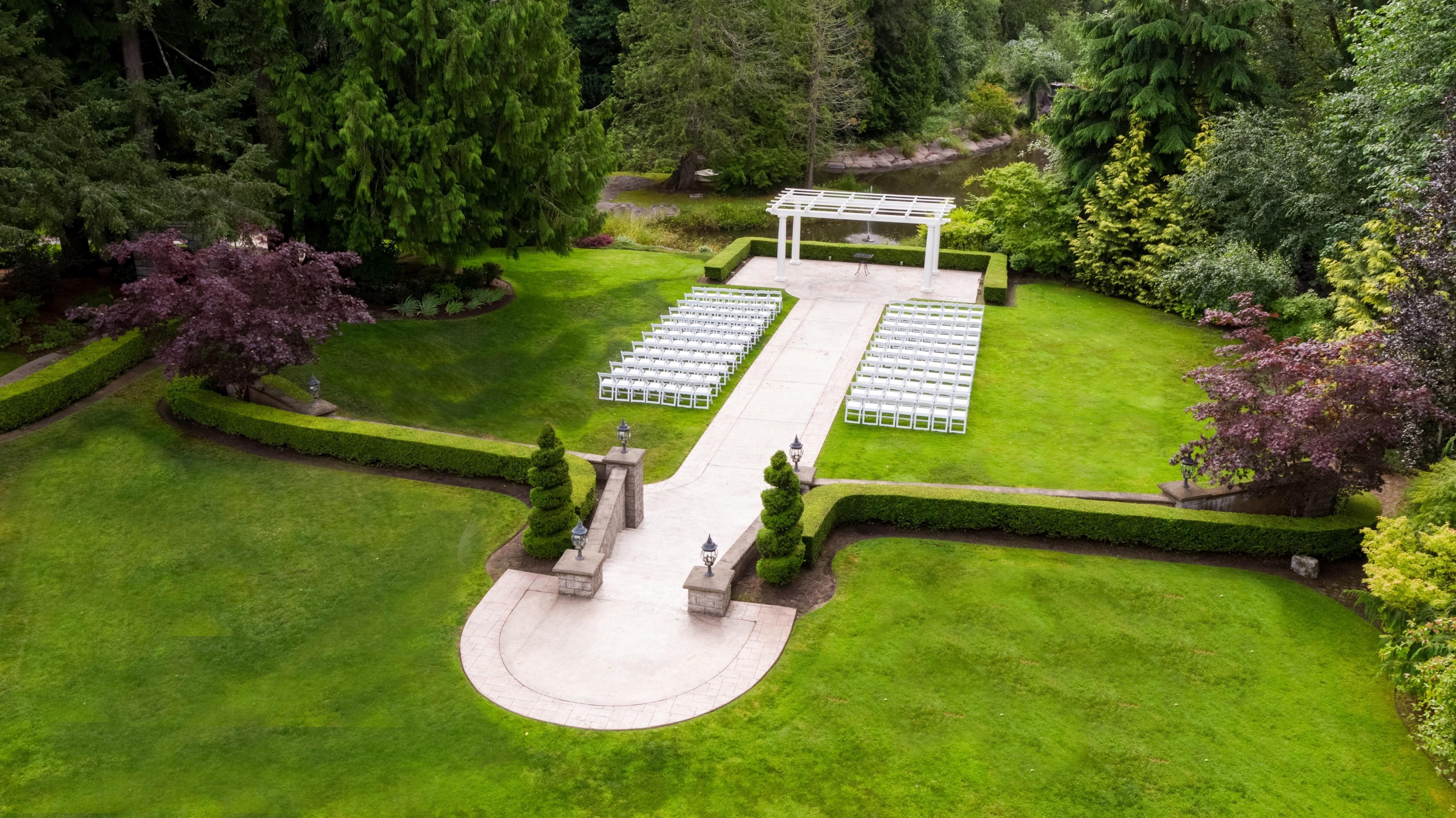 The Gardens was designed to enhance the natural flow of already existing landscapes, from large rocks to the pond, and to preserve the trees that have stood for so long. Views of Mt. Rainier, 100-year-old cedar trees, and stone pathways throughout the Gardens invites guests to explore the beauty of the PNW. In 2008, Rock Creek Gardens hosted its first official wedding and now has thousands of guests from all over the world visit each year.