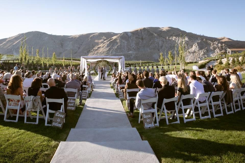 Welcome and thank you for considering The Pond at Rocky Pond for your Wedding Day. At The Pond, our vision is to work with you to transform your dream wedding into a romantic reality with memories that last a lifetime! Located just a short drive from Chelan, we offer one of the most picturesque settings for your wedding day. The Pond at the vineyards of the Rocky Pond Estate Winery easily accommodates a broad range of wedding sizes at our expansive lawns, vineyards, fragrant gardens, and brand new indoor pavilion with floor-to-ceiling windows and wrap-around porch. A variety of local catering and floral referrals are available by request with our venue team.
