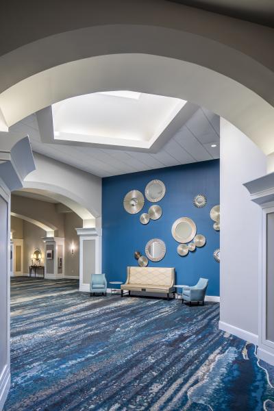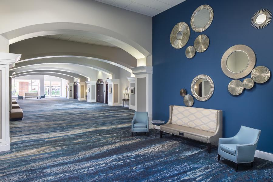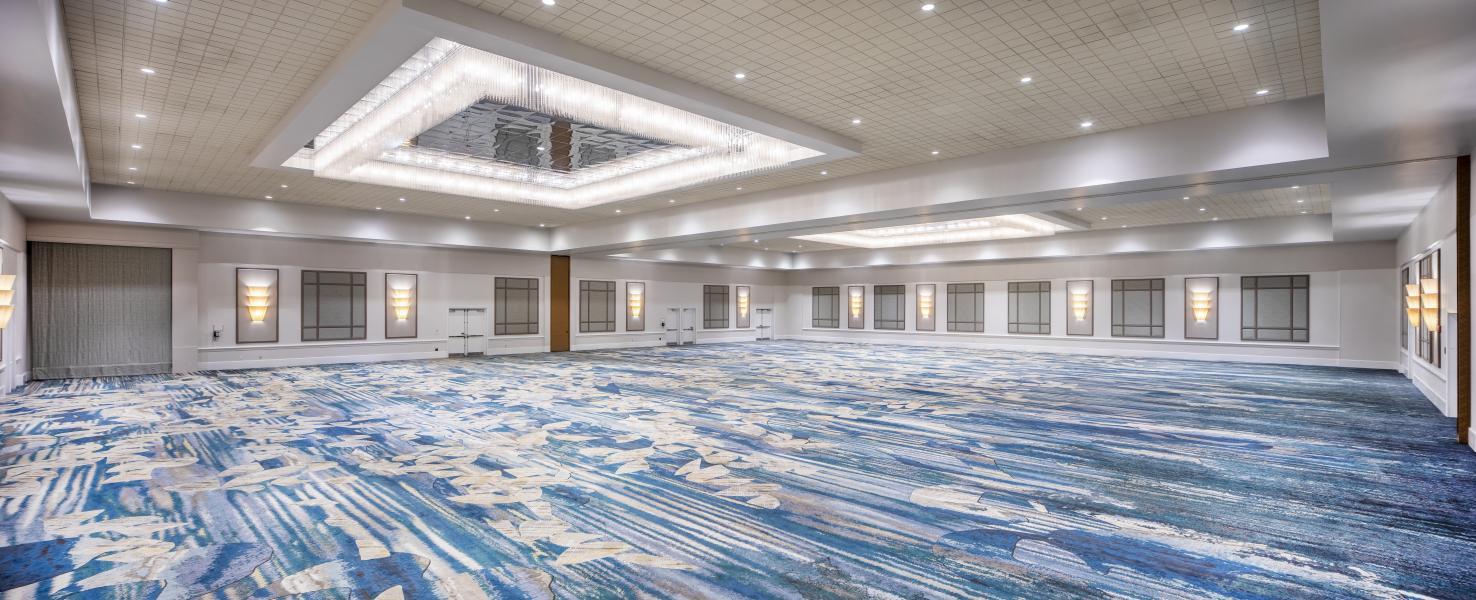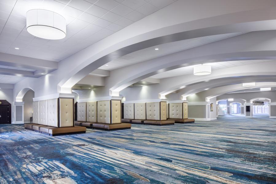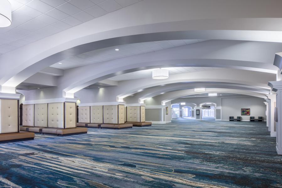 The 14,448 sq. ft. Junior Ballroom provides another major venue. A retractable air wall divides the room in half should a smaller section be more suitable for your event. Ceiling height rises to 22 ft., and capacity in the Junior Ballroom is 1,500 with theater-style seating. The prefunction area outside this ballroom expands to more than 9,000 sq. ft.