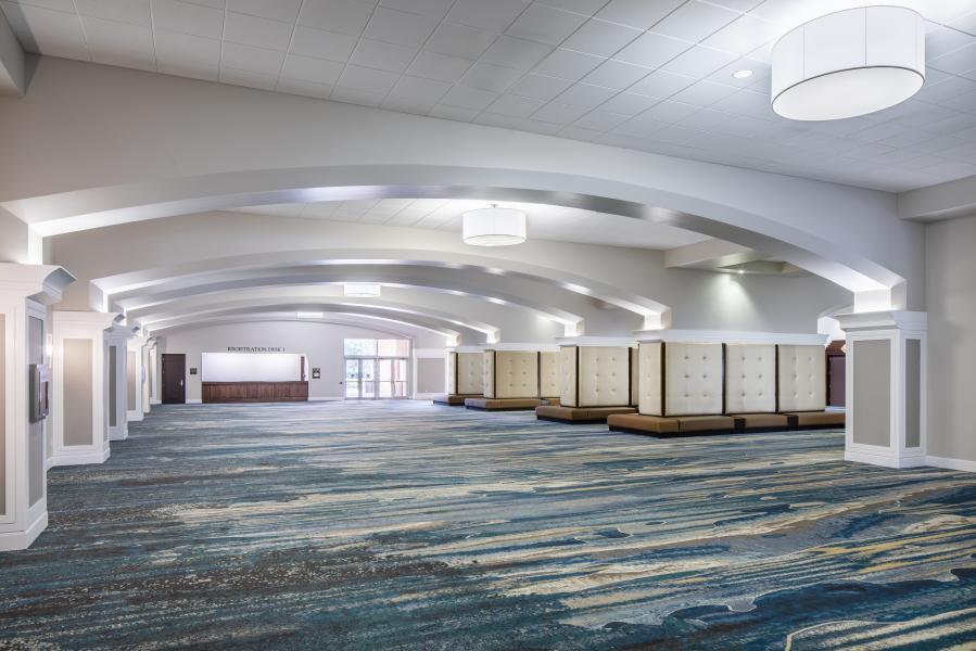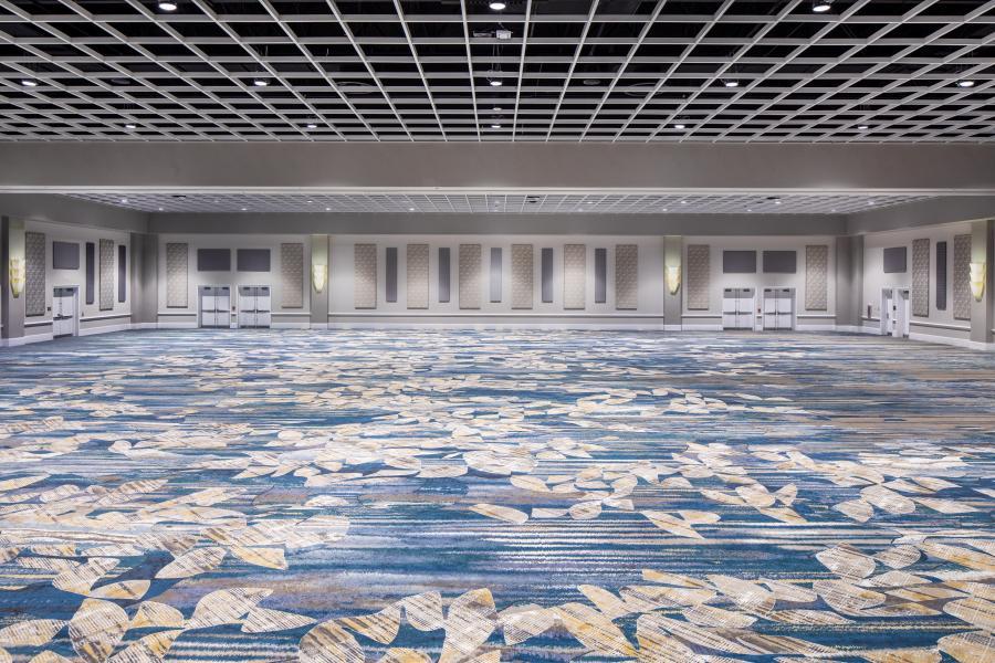 This impressive 17,974 sq. ft. carpeted ballroom with flexible air walls offers three distinct layouts. Ceiling heights rise 22 ft. and can comfortably hold up to 1,888 with theater-style seating. The prefunction area outside this ballroom is a breezy 5,436 sq. ft.