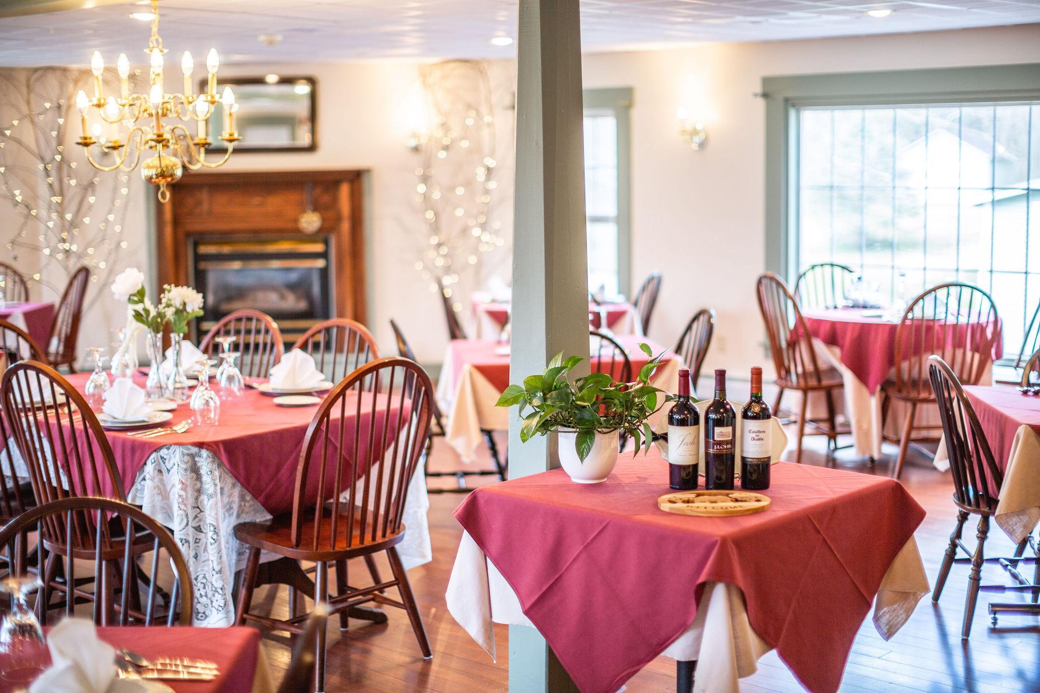 Our dining room has windows on three sides to see the beauty of the New Hampshire mountains. You might be lucky enough to see fox, bobcats, turkey, deer, black bear, or a rare moose while dining on our chef's extraordinary creations.