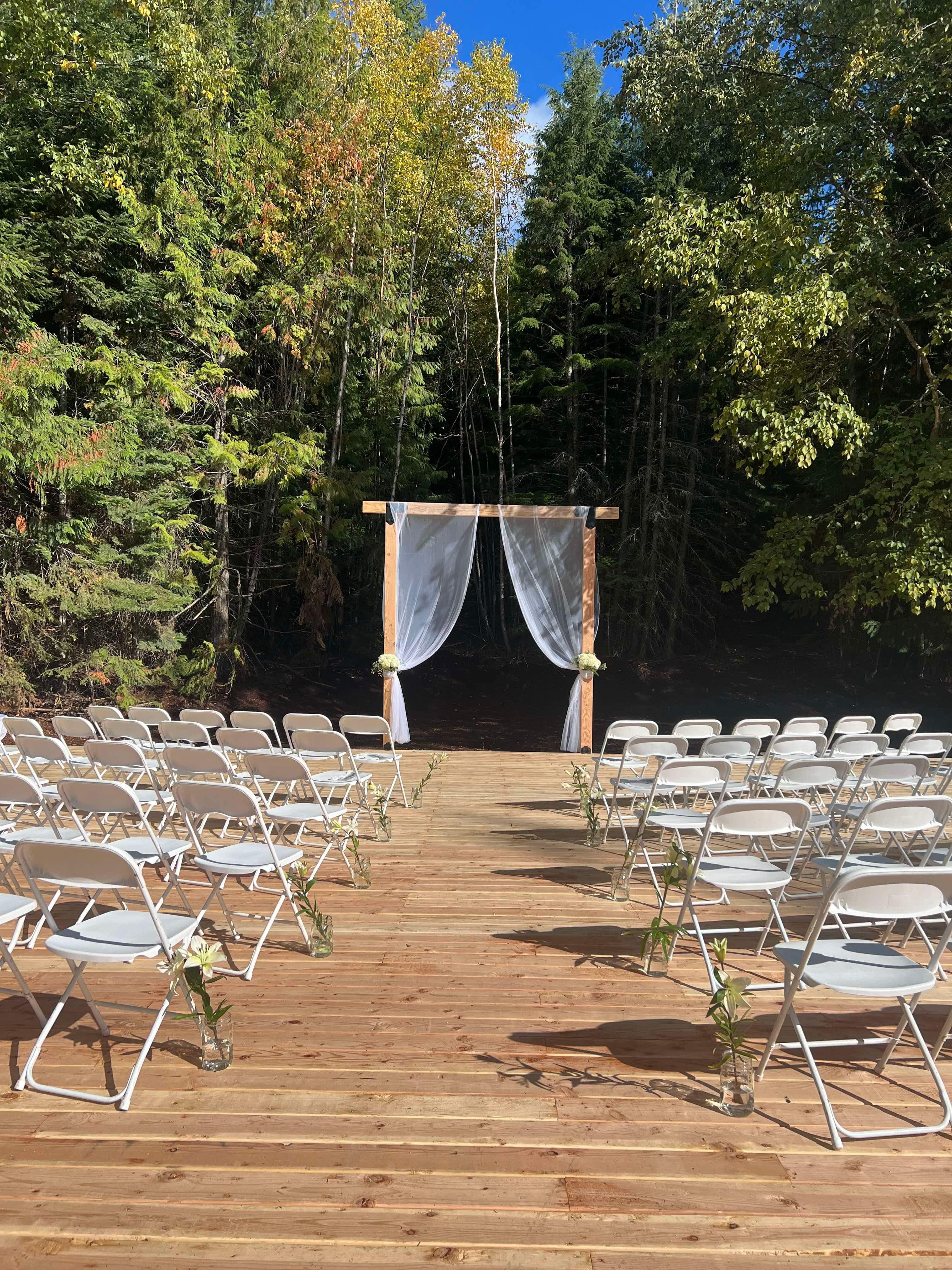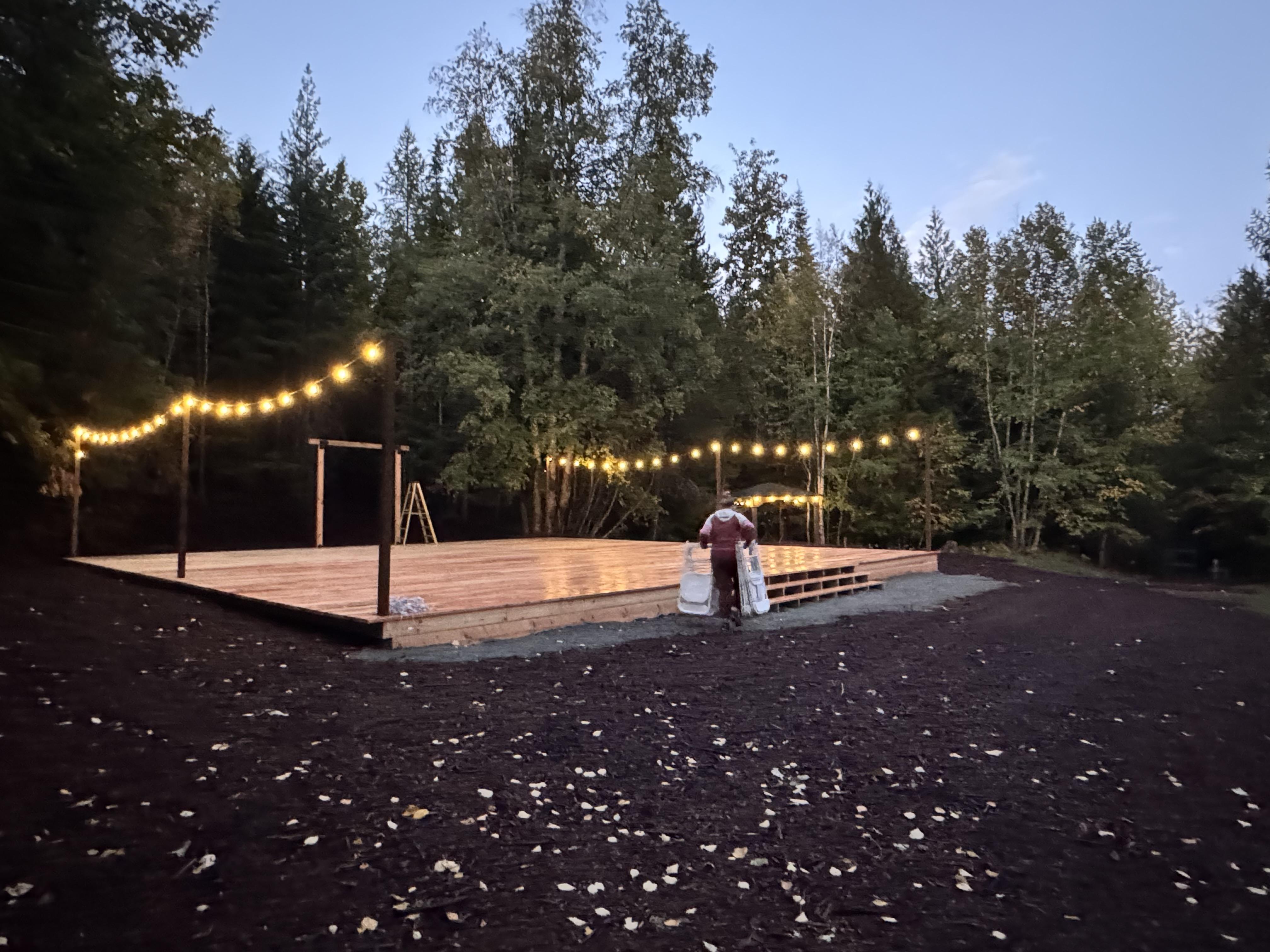 This space is outdoor, but can also be covered. It is surrounded by 360 degrees of beautiful hanging lights. The deck is made from cedar and breaktaking year round.
