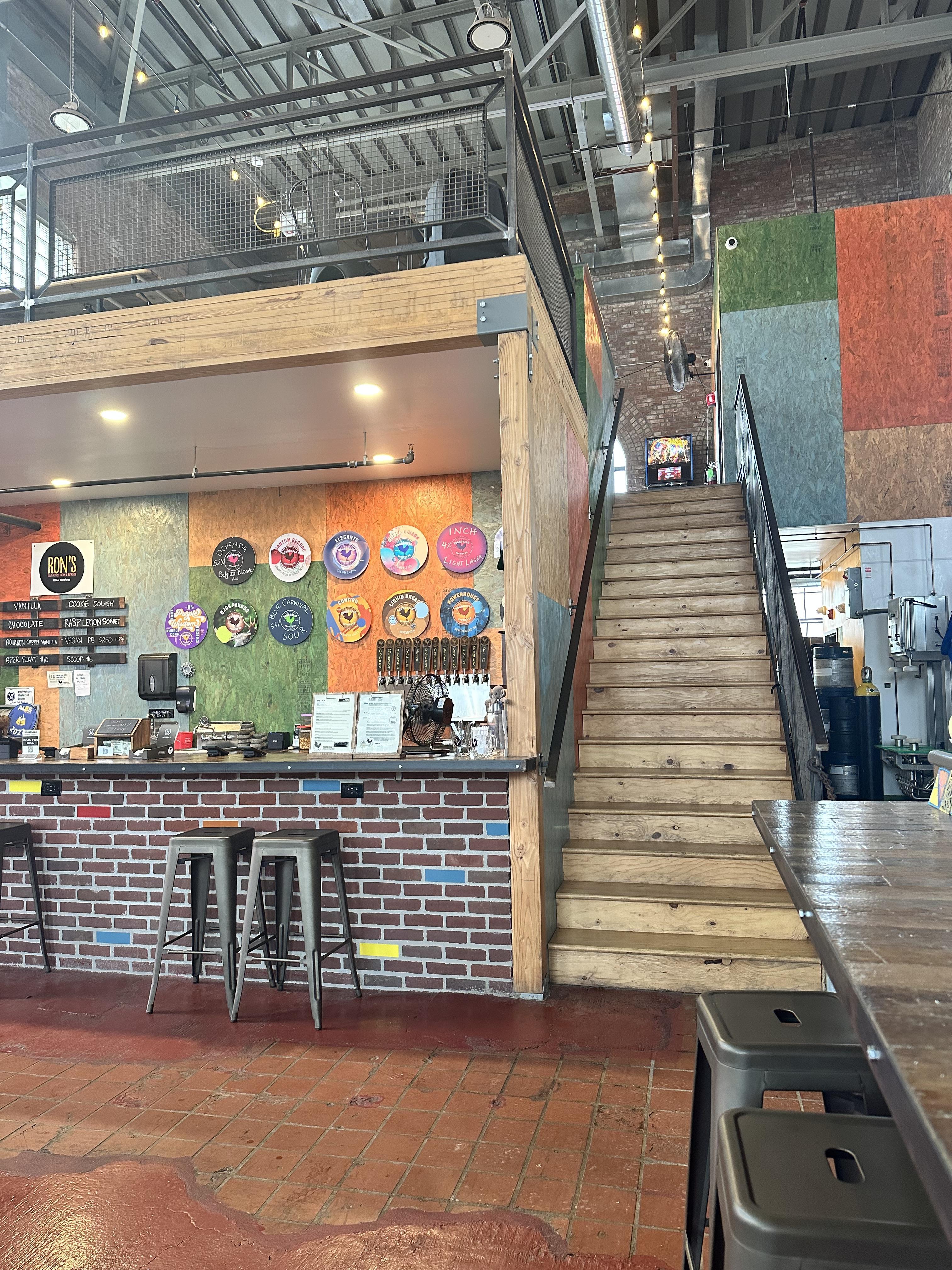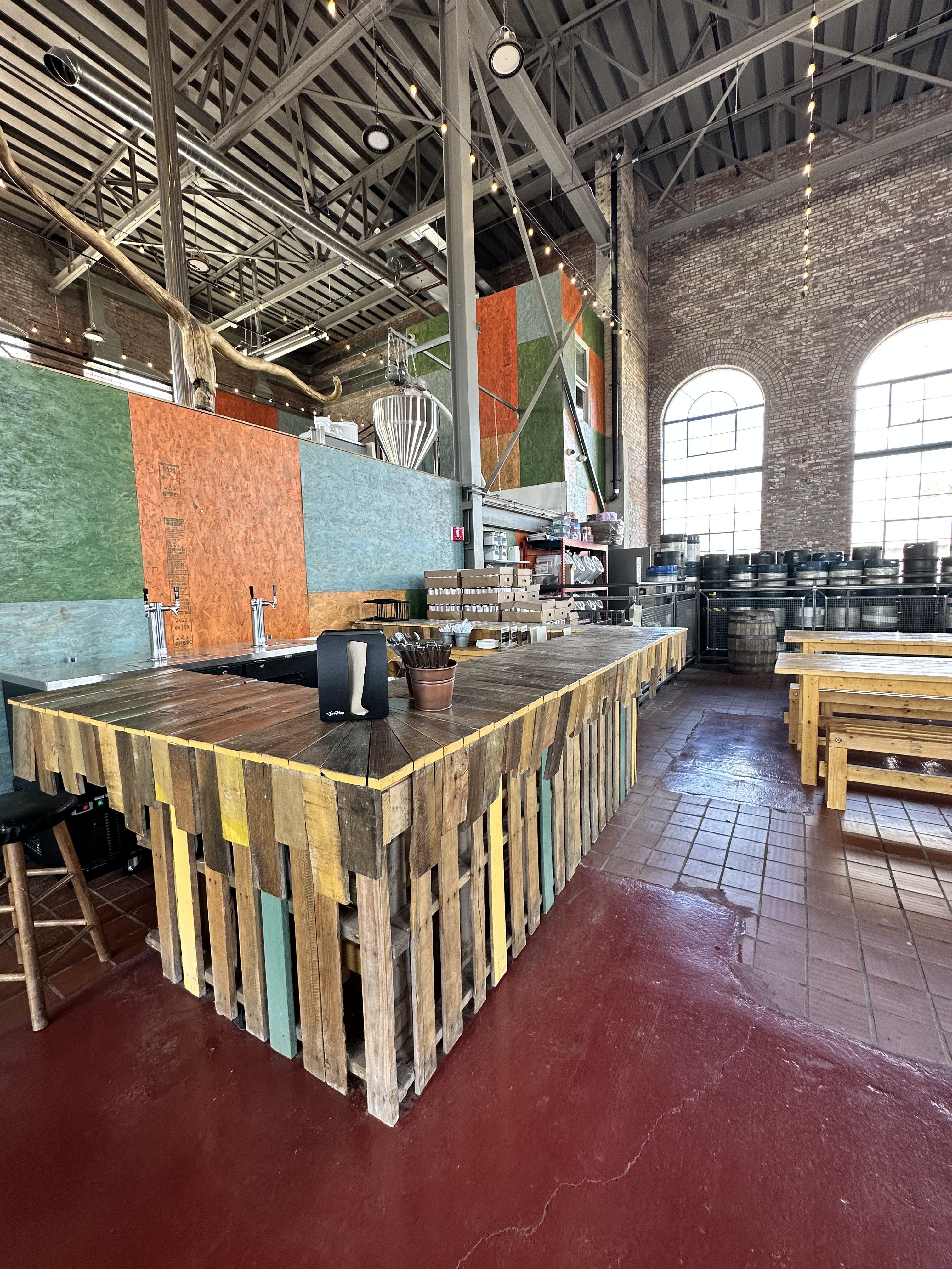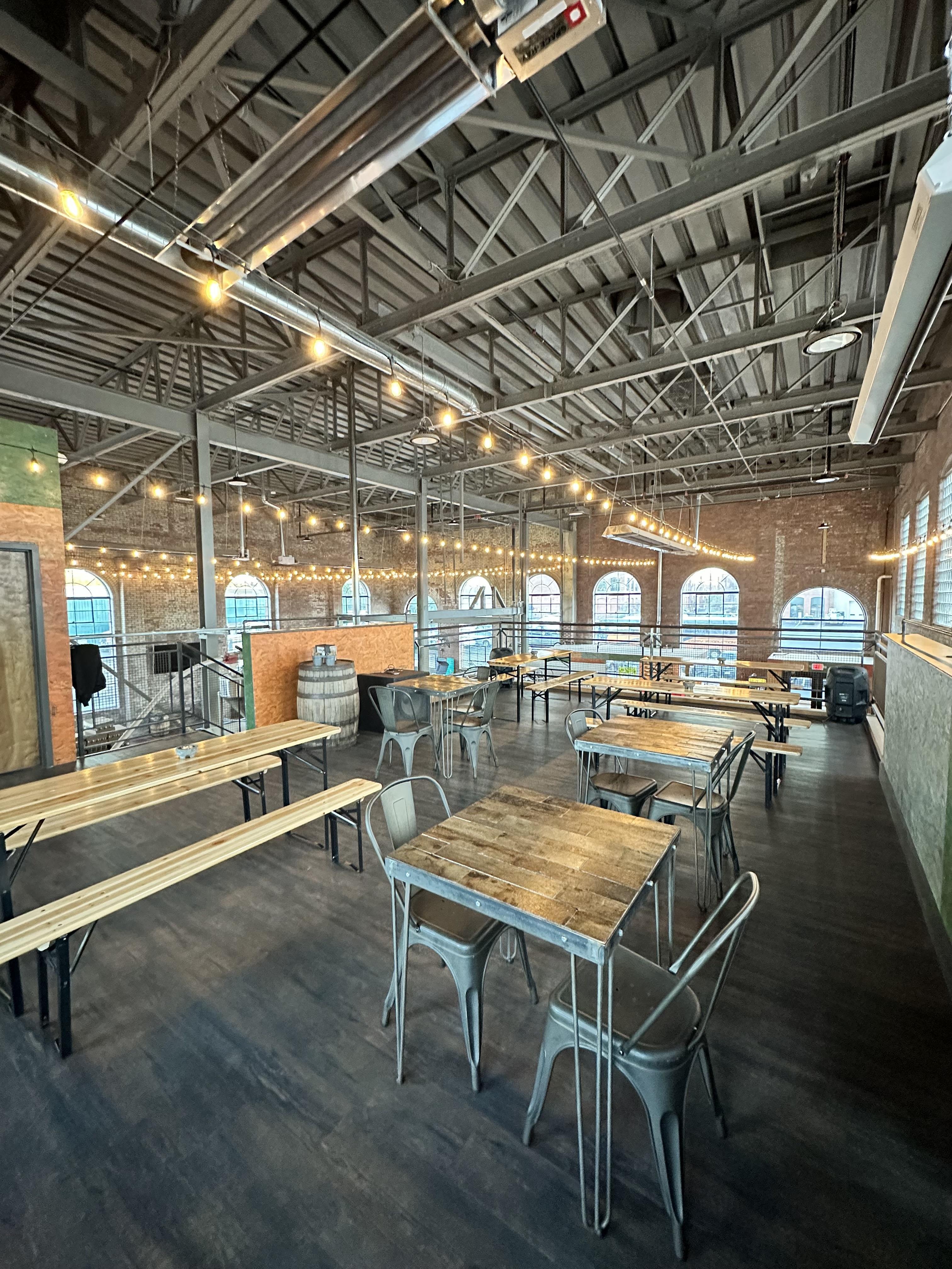 The upstairs Mezzanine offers table and picnic bench seating for 32-40 people. Guests order drinks from the taproom bar (private beertender available as a service add-on).