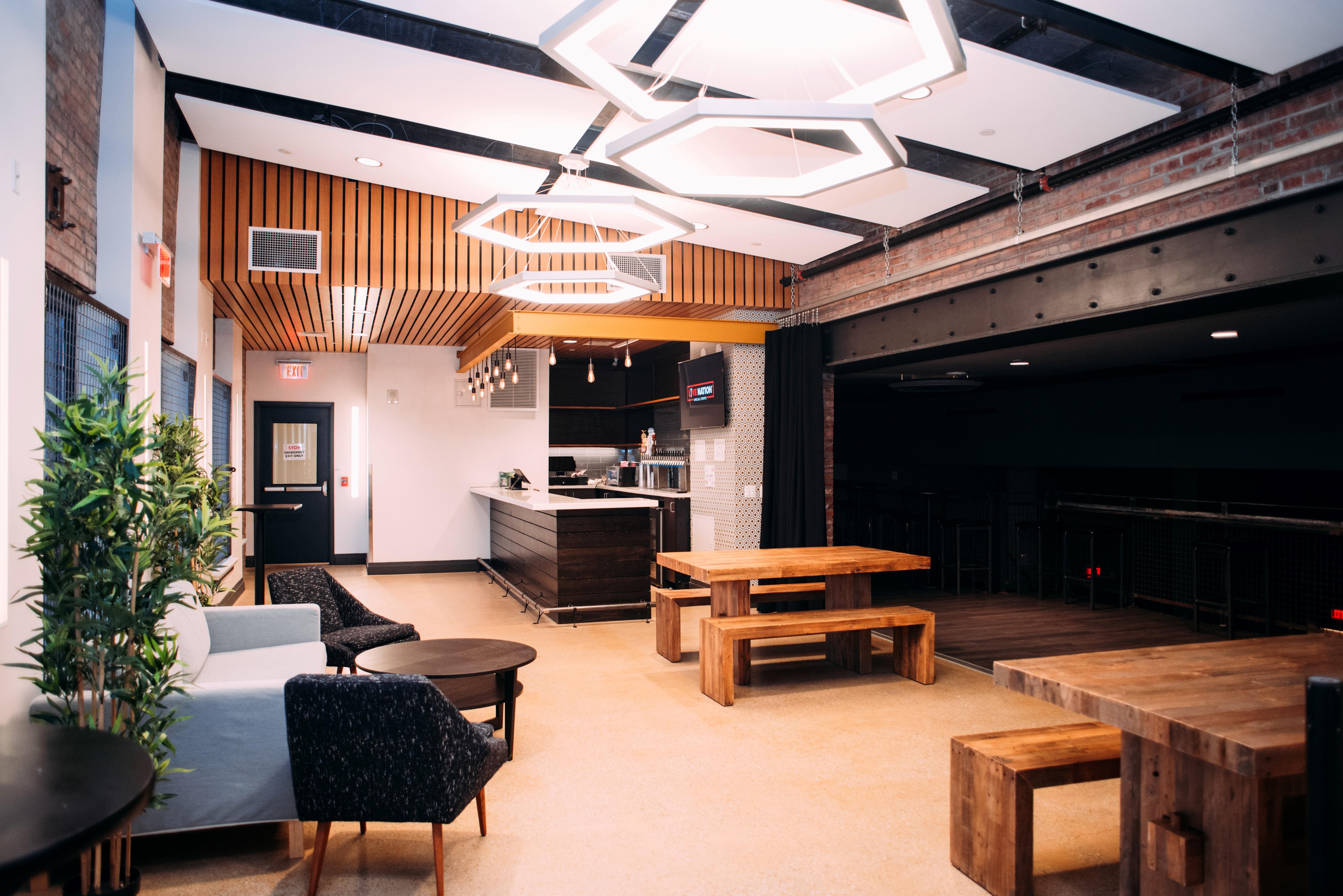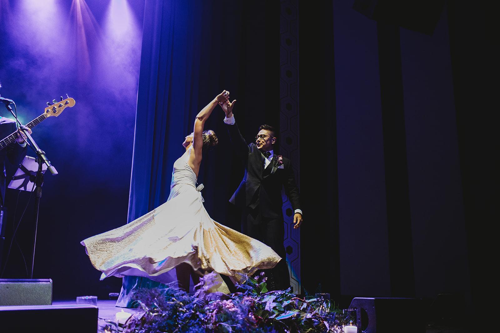 This space is the perfect location to host your cocktail hour. Your ceremony takes place on the stage, guests then cocktail hour up in the VIP Sky Box, and then head downstairs to the main floor for dinner and dancing!