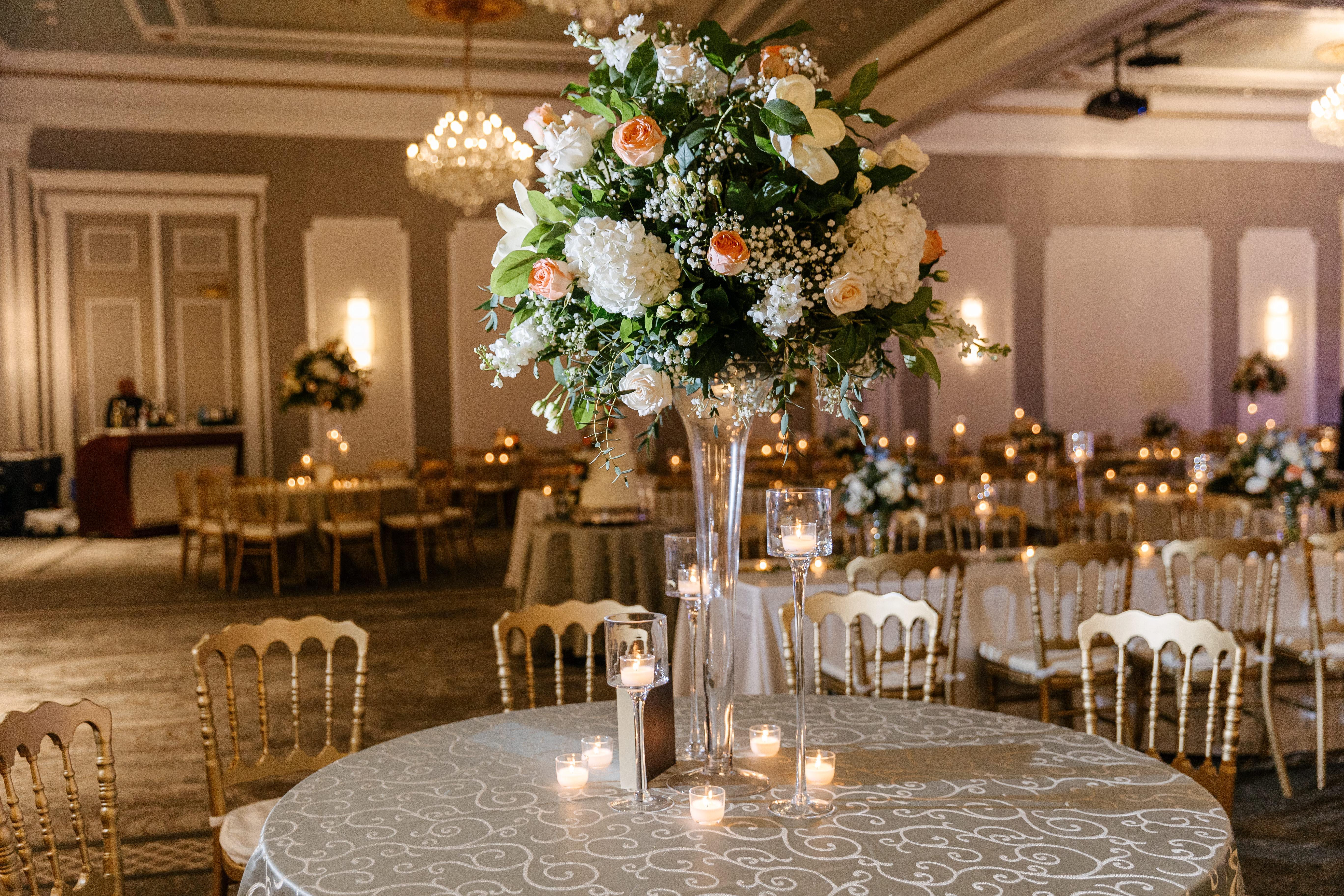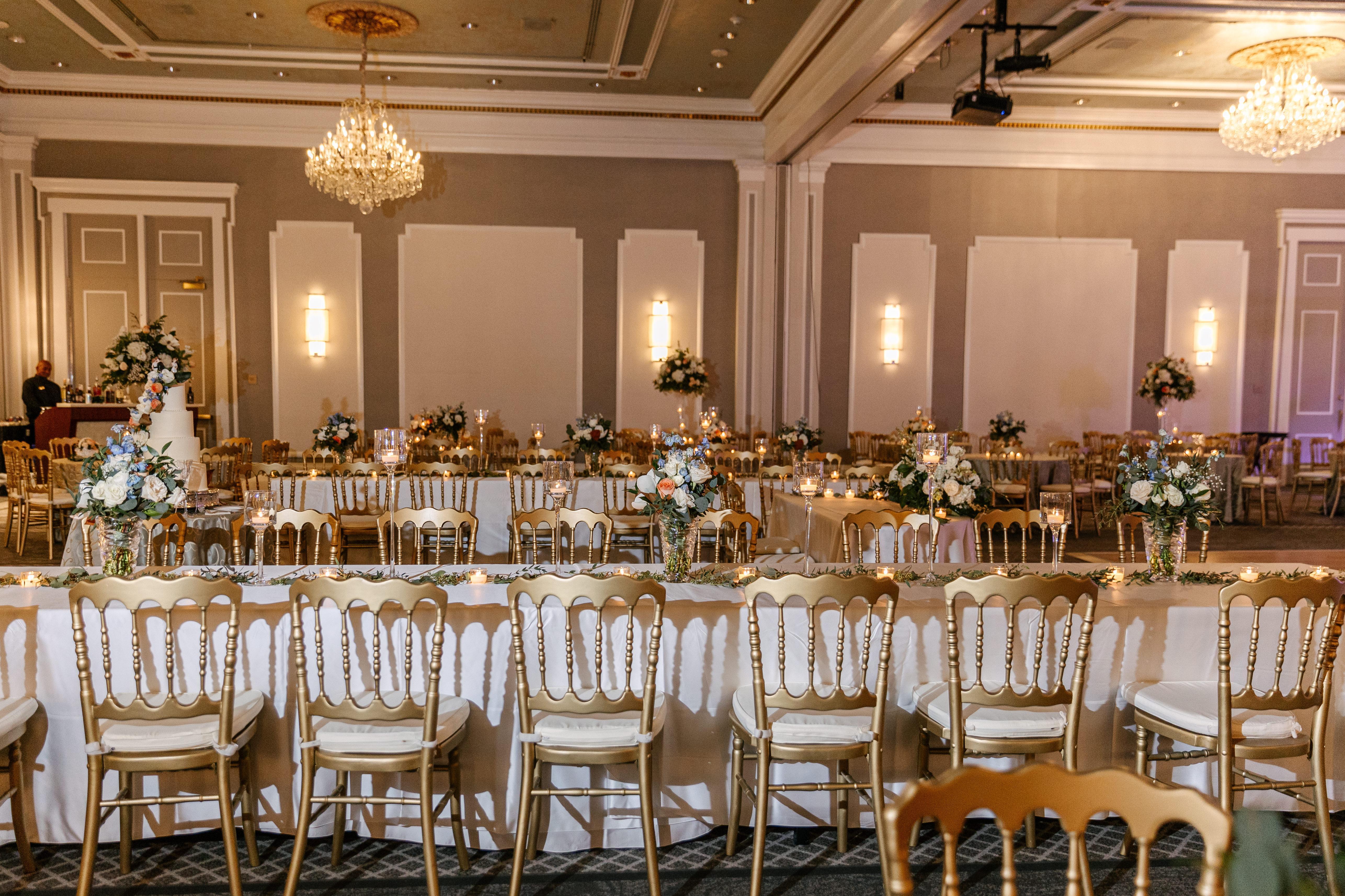 Crystal chandeliers and neutral palette for versatile décor Hotel provided stage and parquet dance floor Banquet tables, chairs, and linens included Space for up to 300 guests On-site catering and dedicated event staff