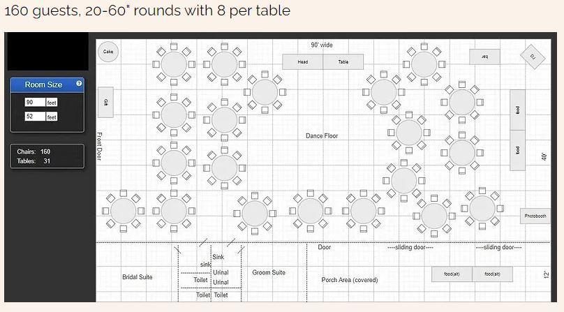 Venue rental Covered patio, 8ft farm tables, 60" round tables (with linens) 6' rectangular tables (with linens) Rolling cake table Chafing dishes, 225 chairs (with covers), pondside ceremony site with wedding arbor, Bridal cabin (overnight capable), Groom's suite Ceremony sound system Reception sound system DJ/MC (reception & ceremony) String lighting Dance floor lighting Beautiful Uplighting, center floor and head table spotlights and plenty of parking for your guests Cleanup is included.