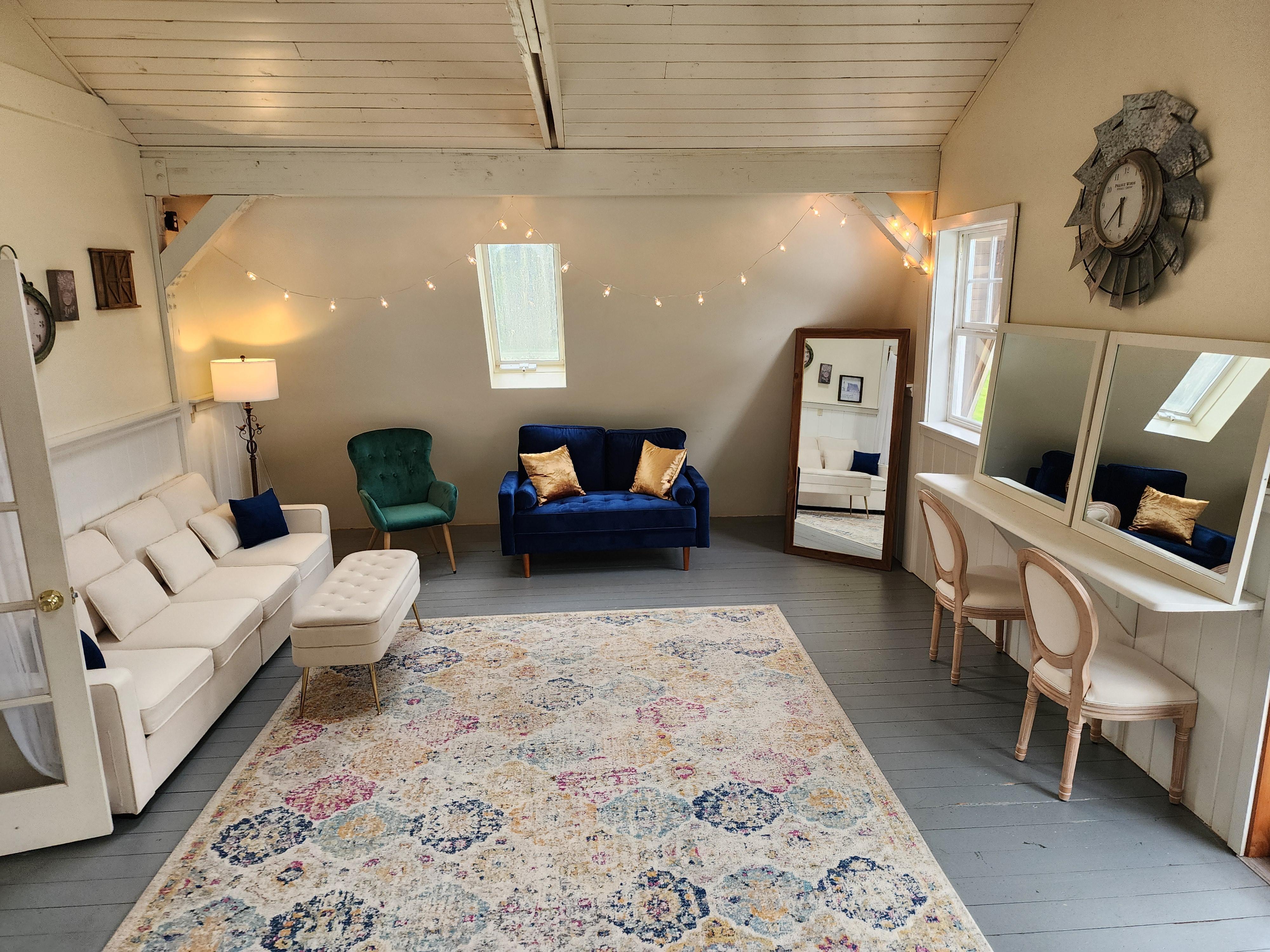 Beautiful Bridal Suite with private restroom. This Suite was recently redone to include lots of color, lighting, mirrors & seating!