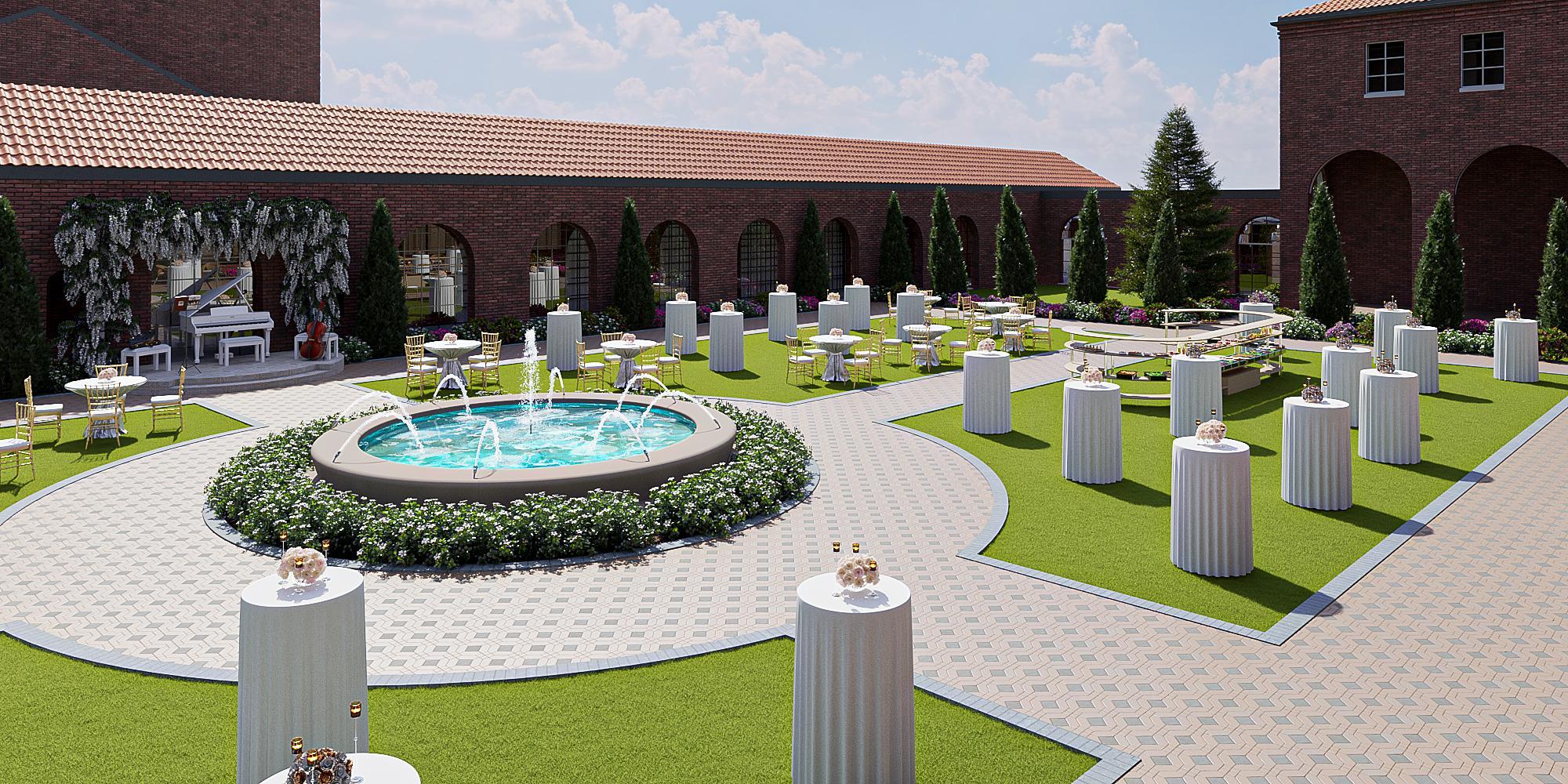 - 24000 square feet (17,00 indoor + 7,00 outdoor) - Stunning courtyard with fountain - Beautiful bridal suite - Three floors of additional event space - Nana-Walls - Nine Crystal chandeliers - Skylights