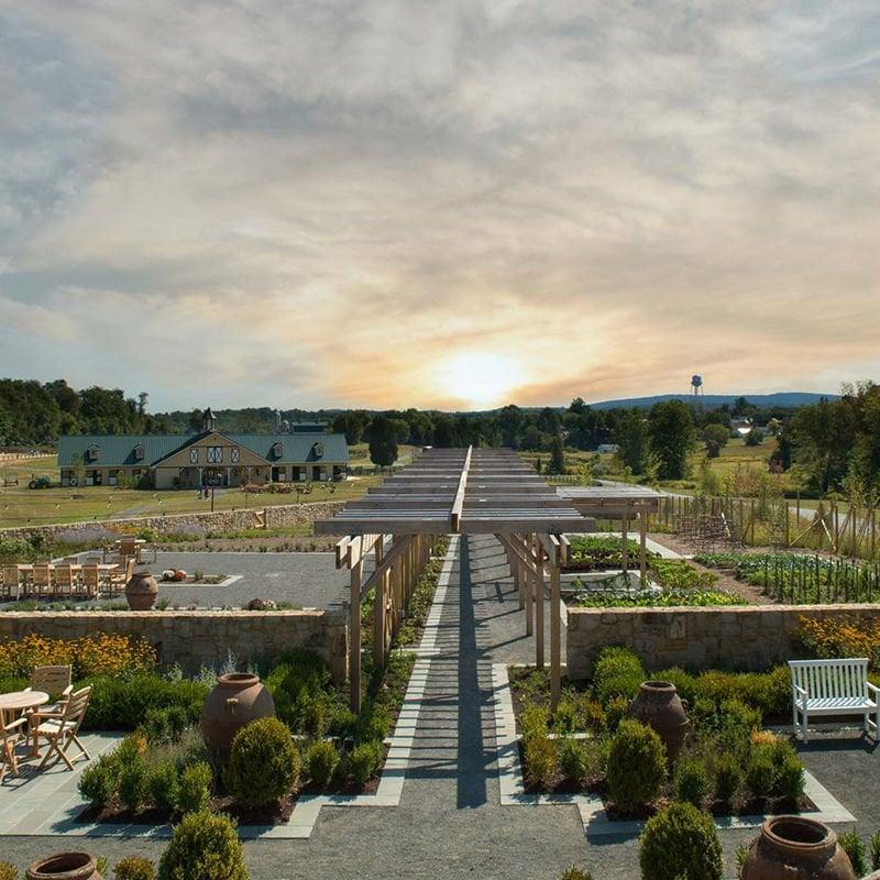 Trellised gardens overlooking the Equestrian Center and foothills of the Blue Ridge Mountains, this is a truly unique and refreshing setting for any gathering. Dine in the garden where we grow fresh herbs and vegetables and have a true 'garden-to-table' experience. Accommodates up to 120 guests for dinner and up to 175 guests for a reception.