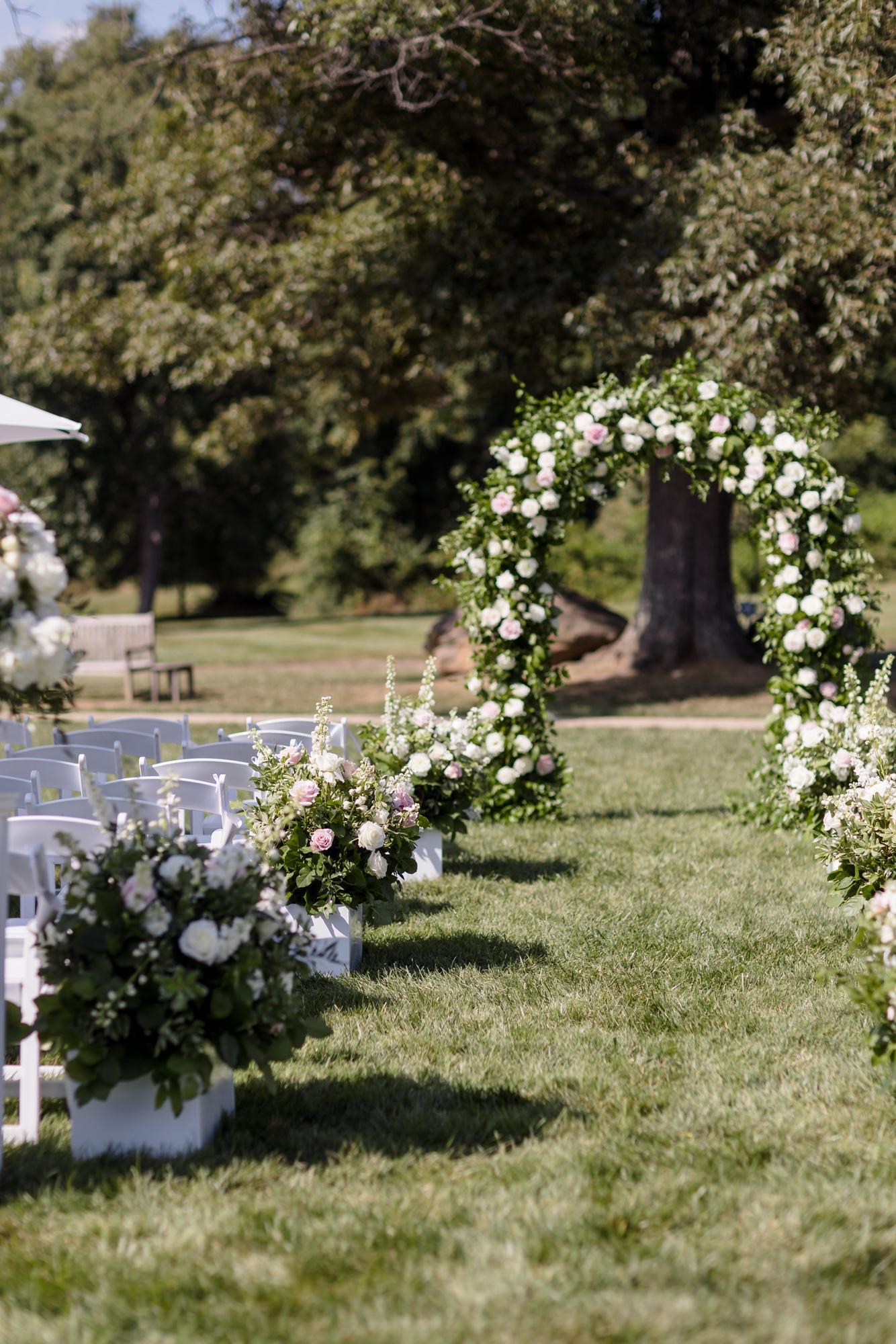 Lush green lawn with walking paths overlooking the trails and woods of the nature conservatory area. This Virginia space is ideal for receptions and features a large stone fire pit, a perfect gathering place for your guests to enjoy cocktails. Accommodates 1,000+ guests.