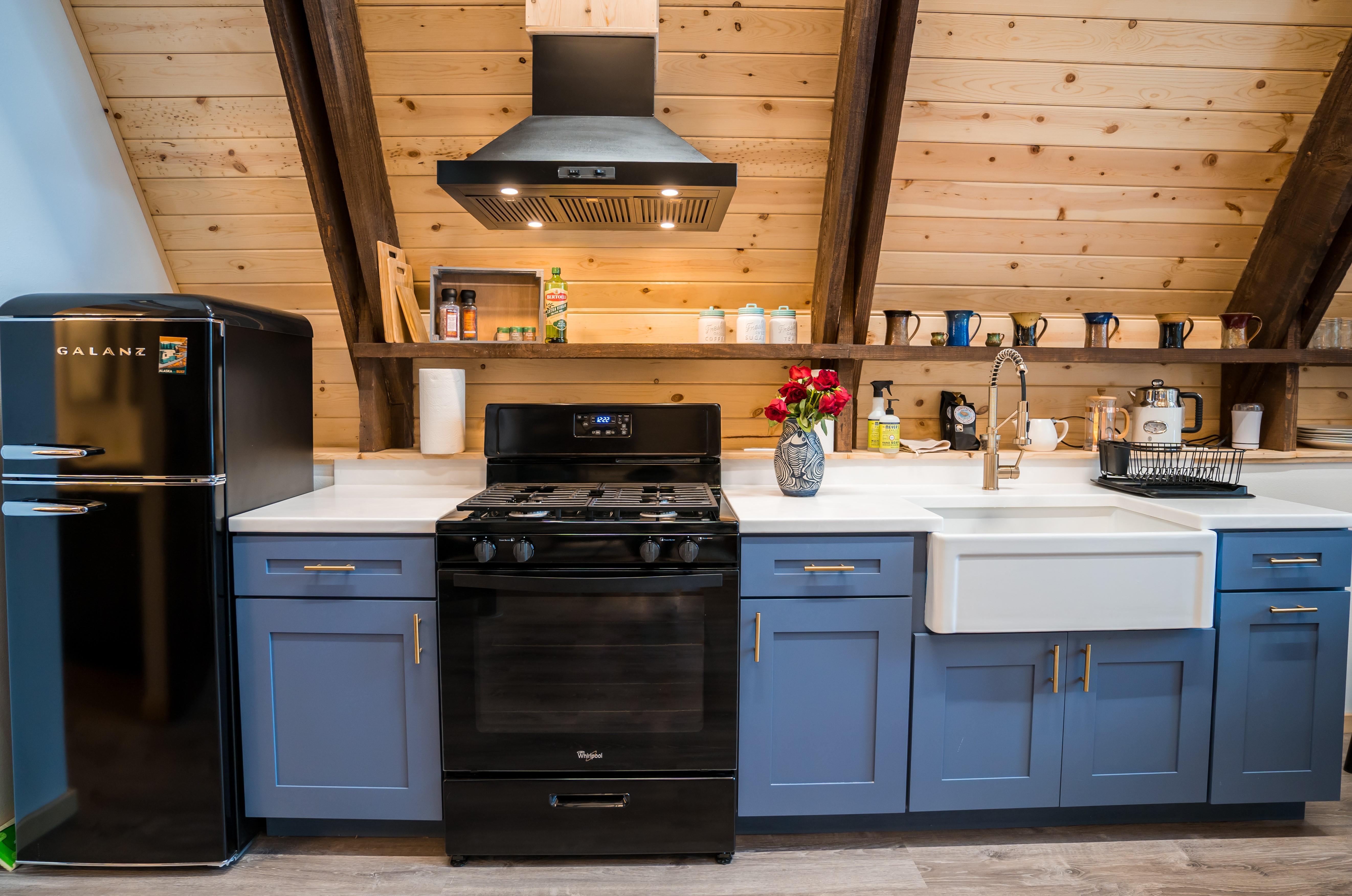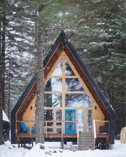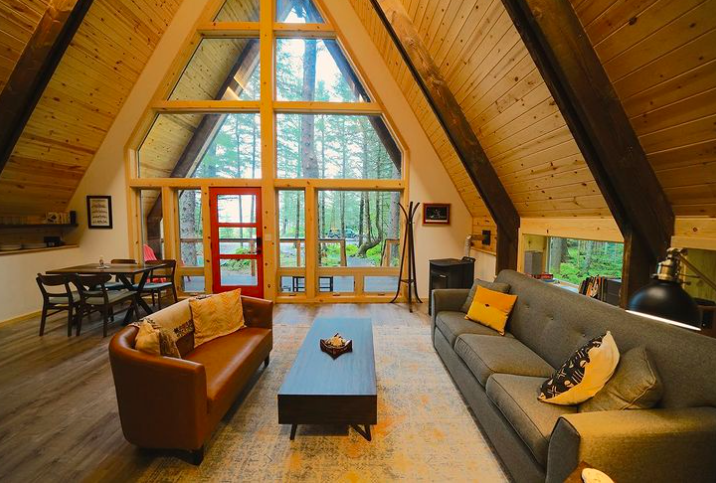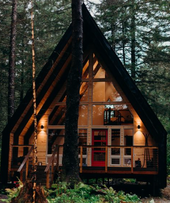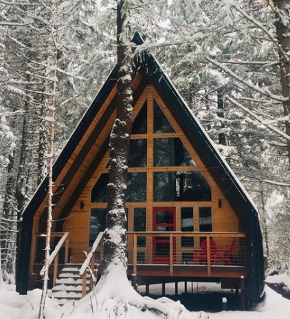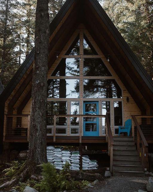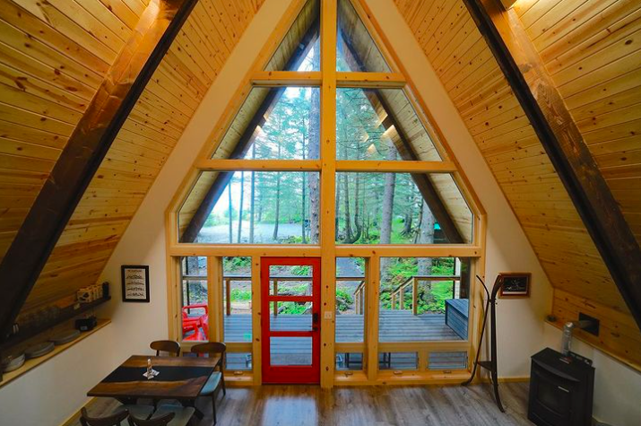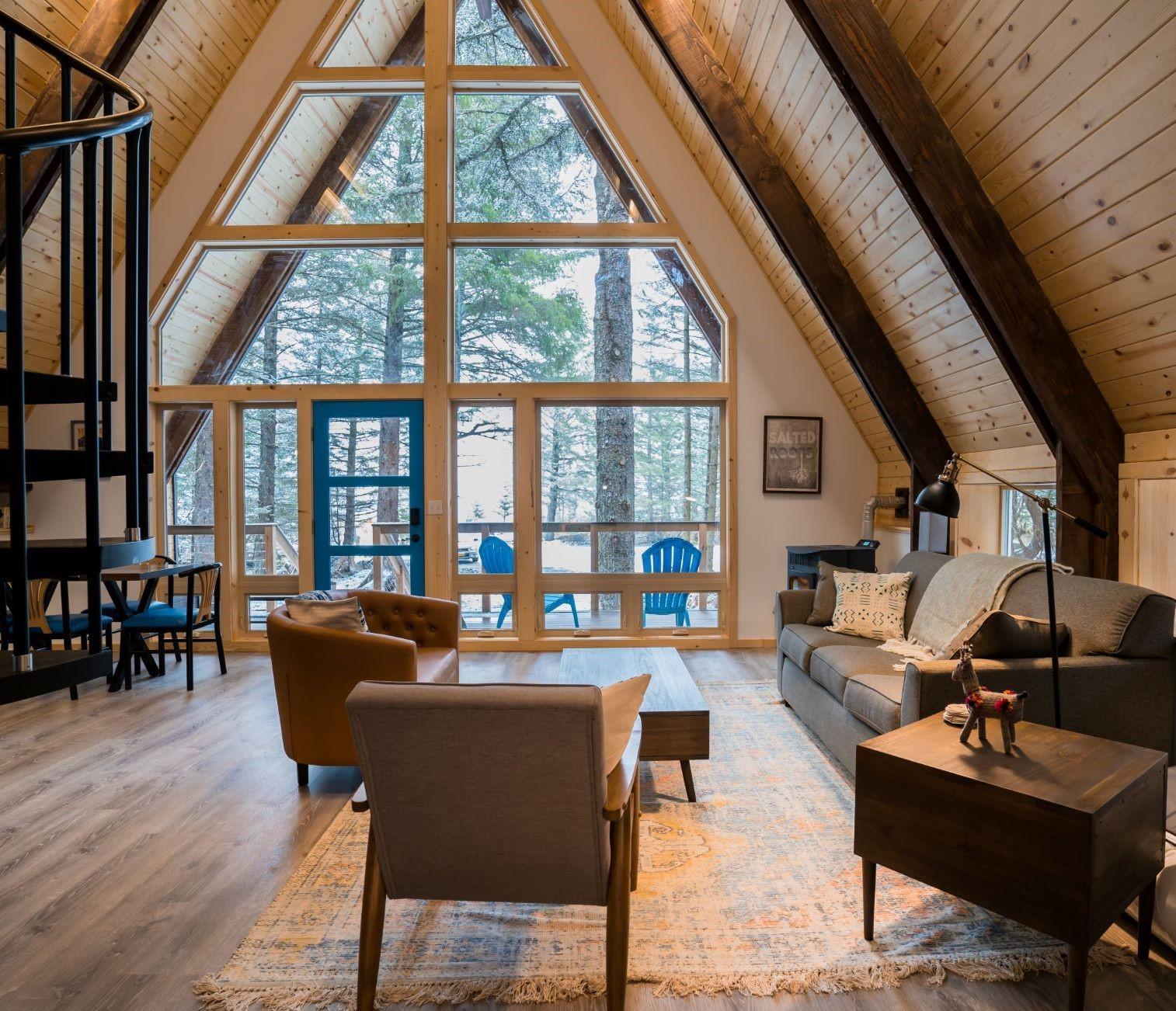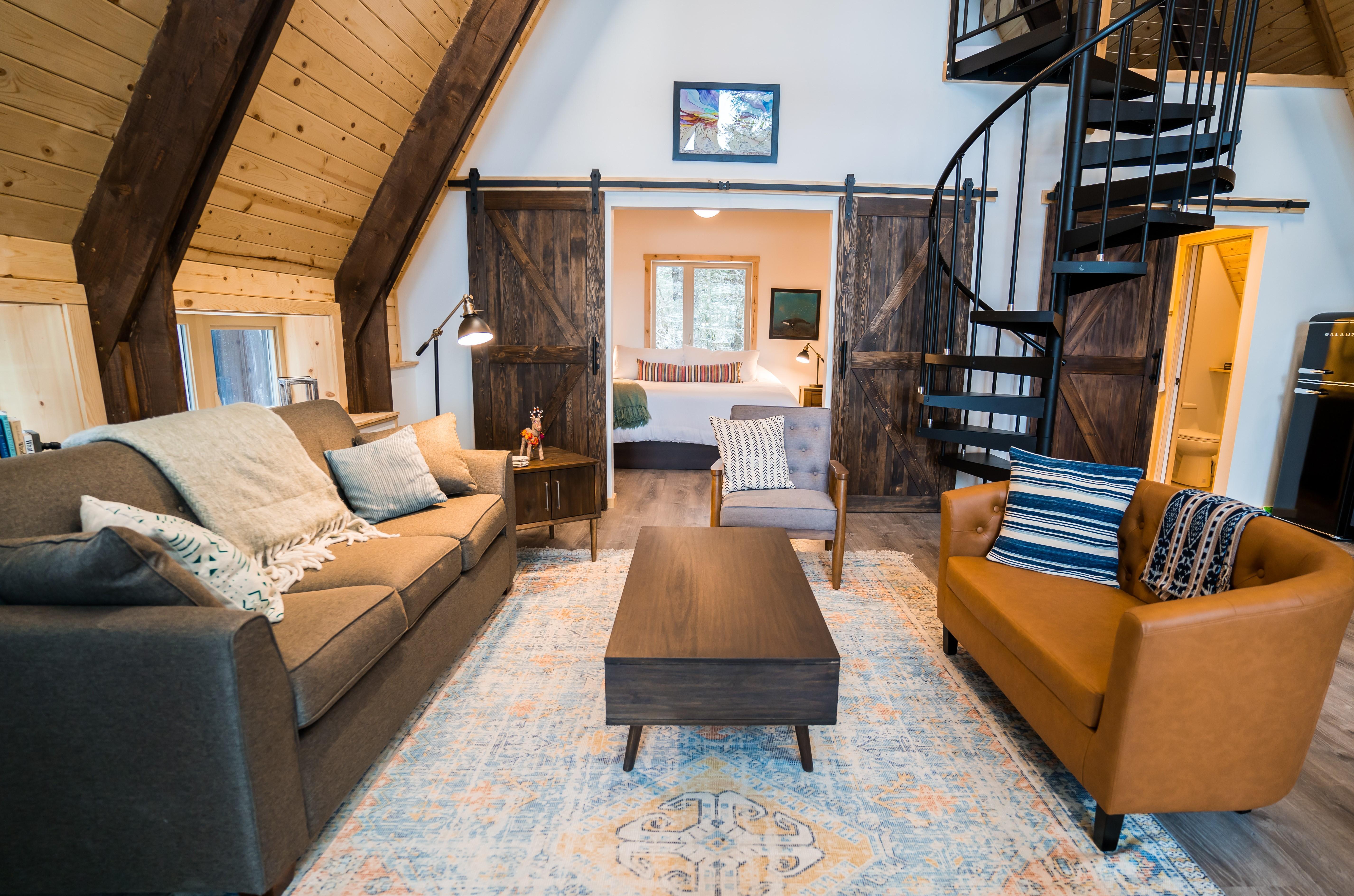 Surrounded by spruce forest, the entire glass-front floods the living space of the A-frame with natural light. A simultaneously inviting yet secluded cabin with a private bedroom downstairs and open loft upstairs. The cabin includes a master bedroom downstairs, a loft bedroom upstairs, and a sofa couch for a comfortable overnight-max of 6 people. The unit also includes a beautiful wet room, clawfoot tub, wood pellet stove, kitchenette, and private deck.