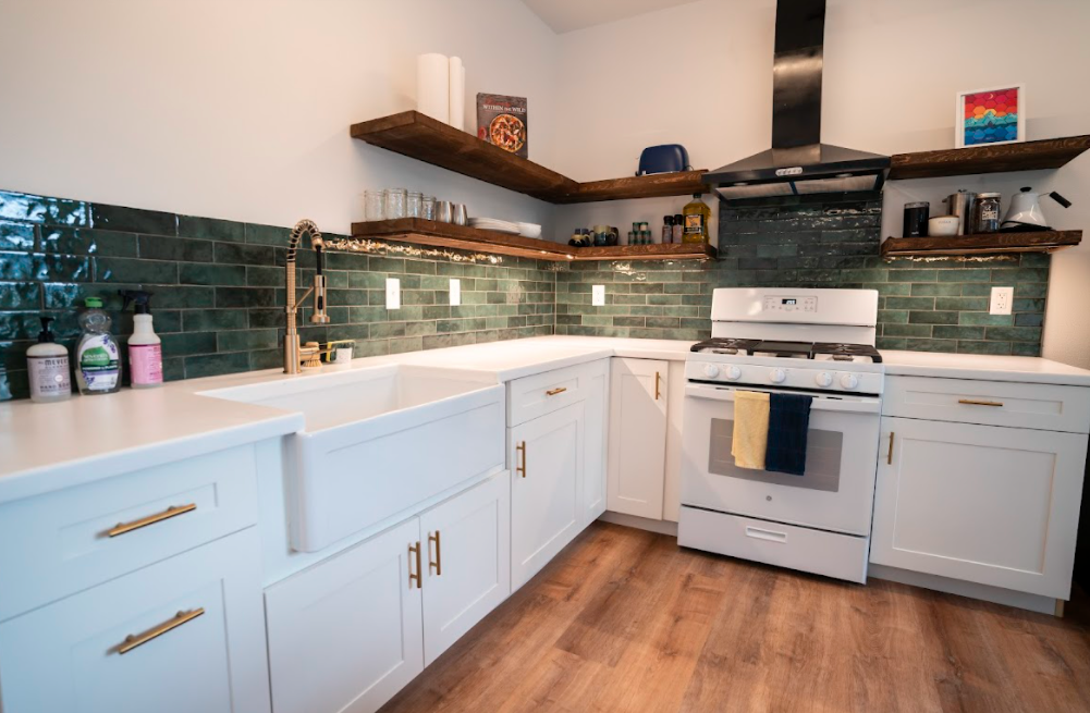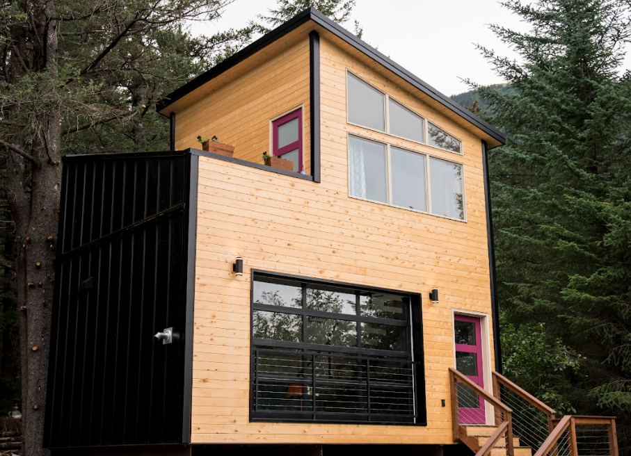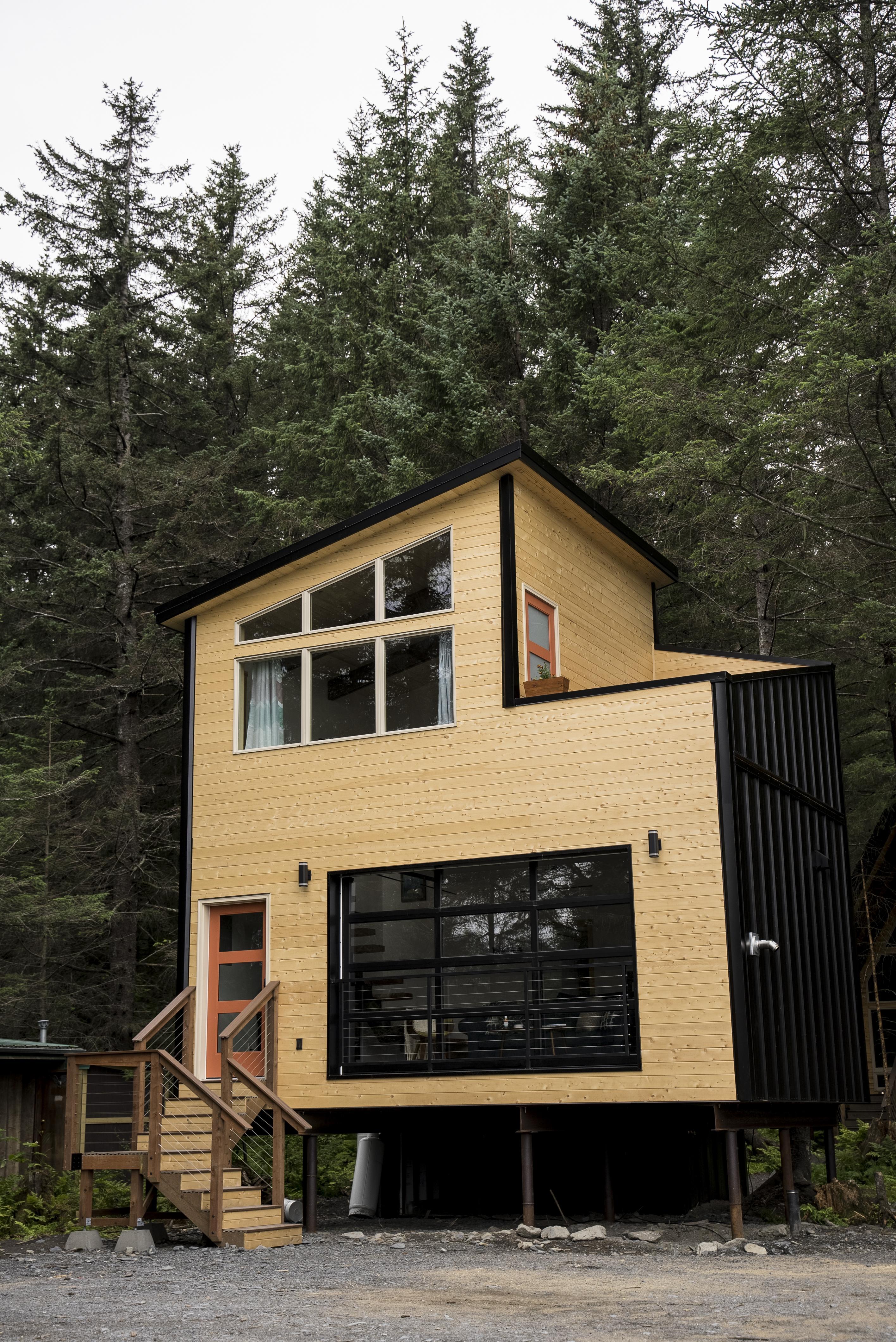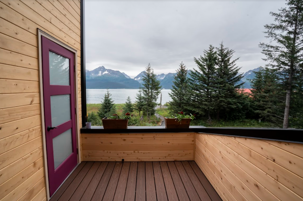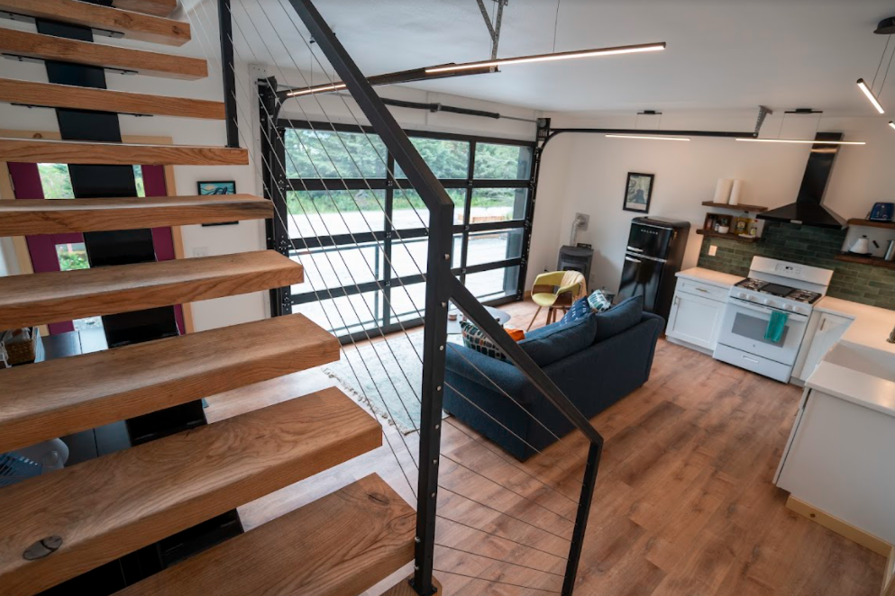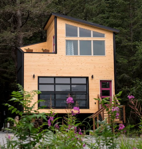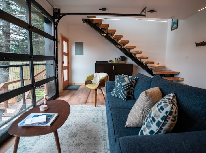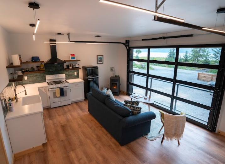 Salted Roots' newest accommodation, completed in August 2021. Our cottages are hip and quaint, including two floors, a floating staircase, and a manual garage door feature. Open up your living room for the perfect summer afternoon lounge. The glass-front second story master bedroom connects to a deck overlooking Resurrection Bay. With a cocktail or coffee in hand, enjoy the privacy above it all. Downstairs includes a luxurious bathroom, a cabinet queen murphy sleeper, and a kitchen for creating.