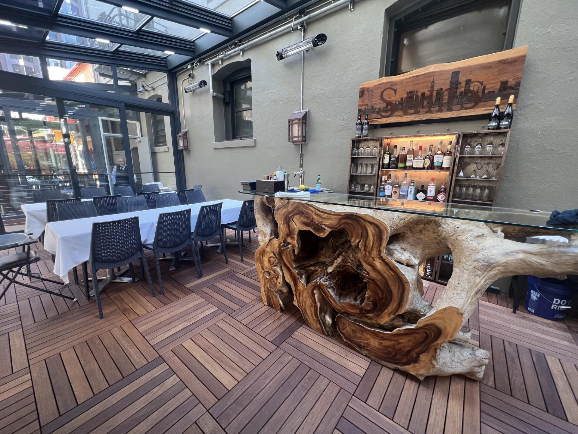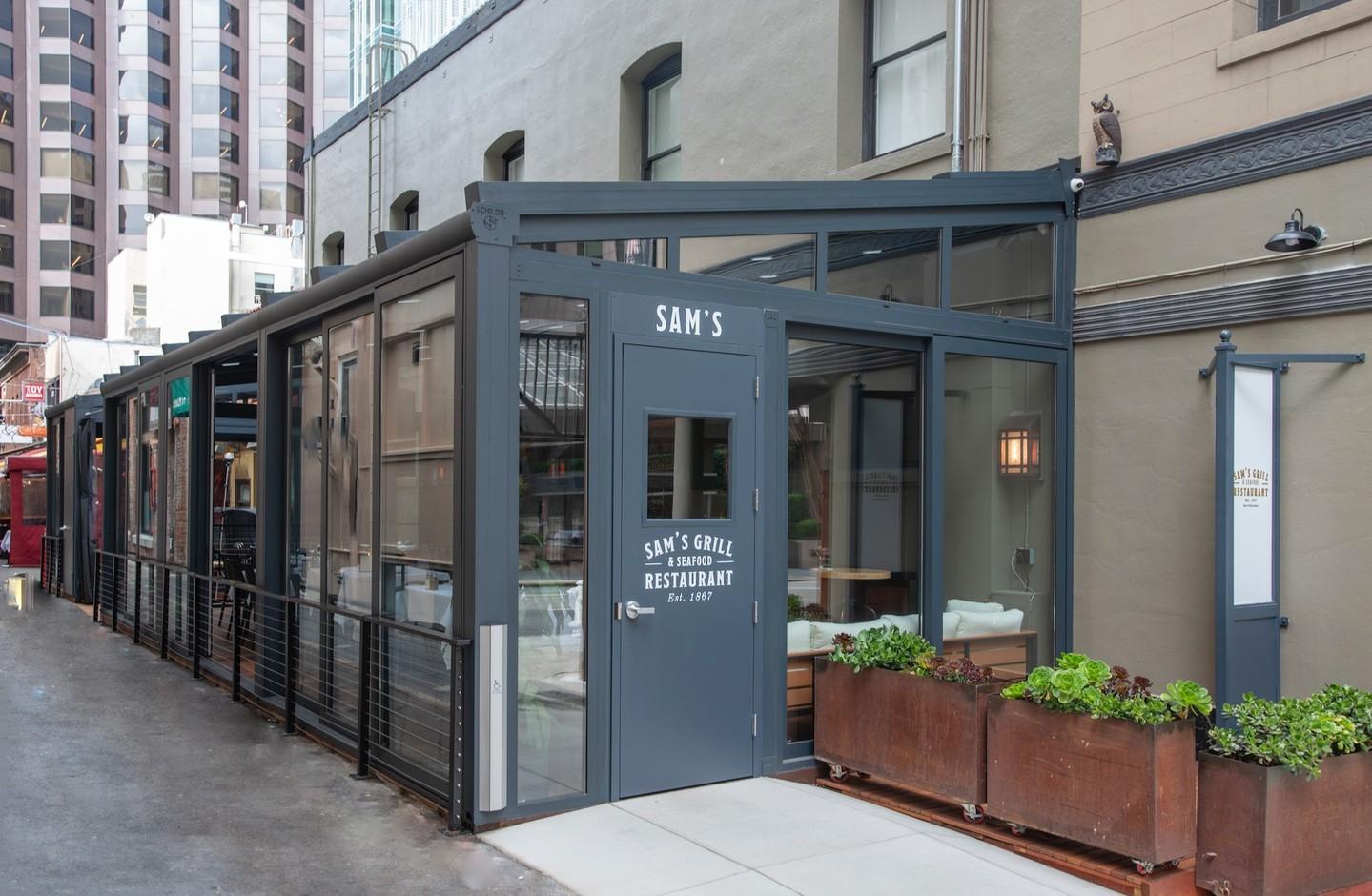 Sam’s private party space is a glass covered patio with sliding doors and retractable roof. It is adjacent to the classic Sam’s Grill and opens onto a European Style walk street lined with Cafes and (personal information protected by Zola) is a warm and light environment that allows for modern extension of the 5th oldest restaurant in the country.