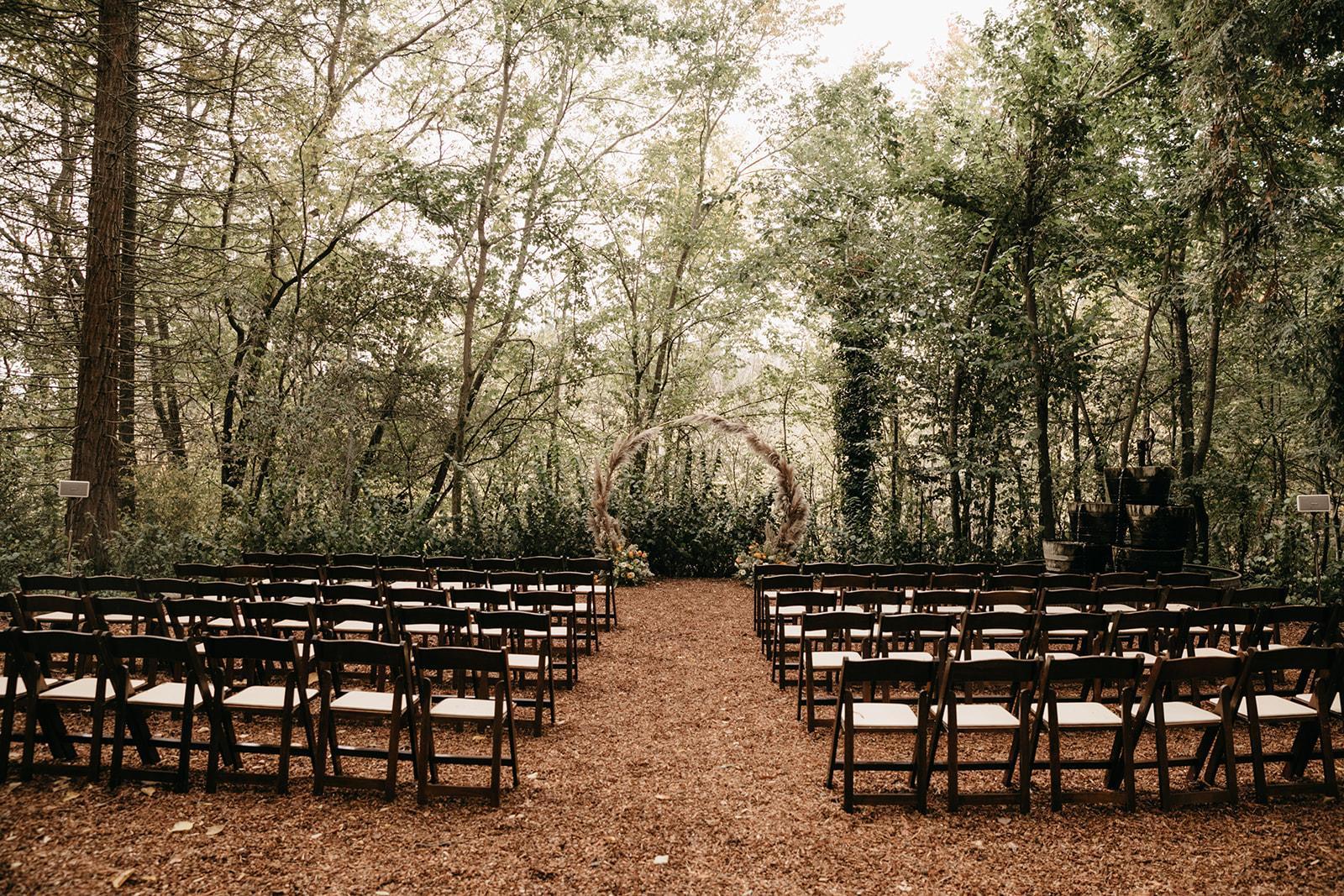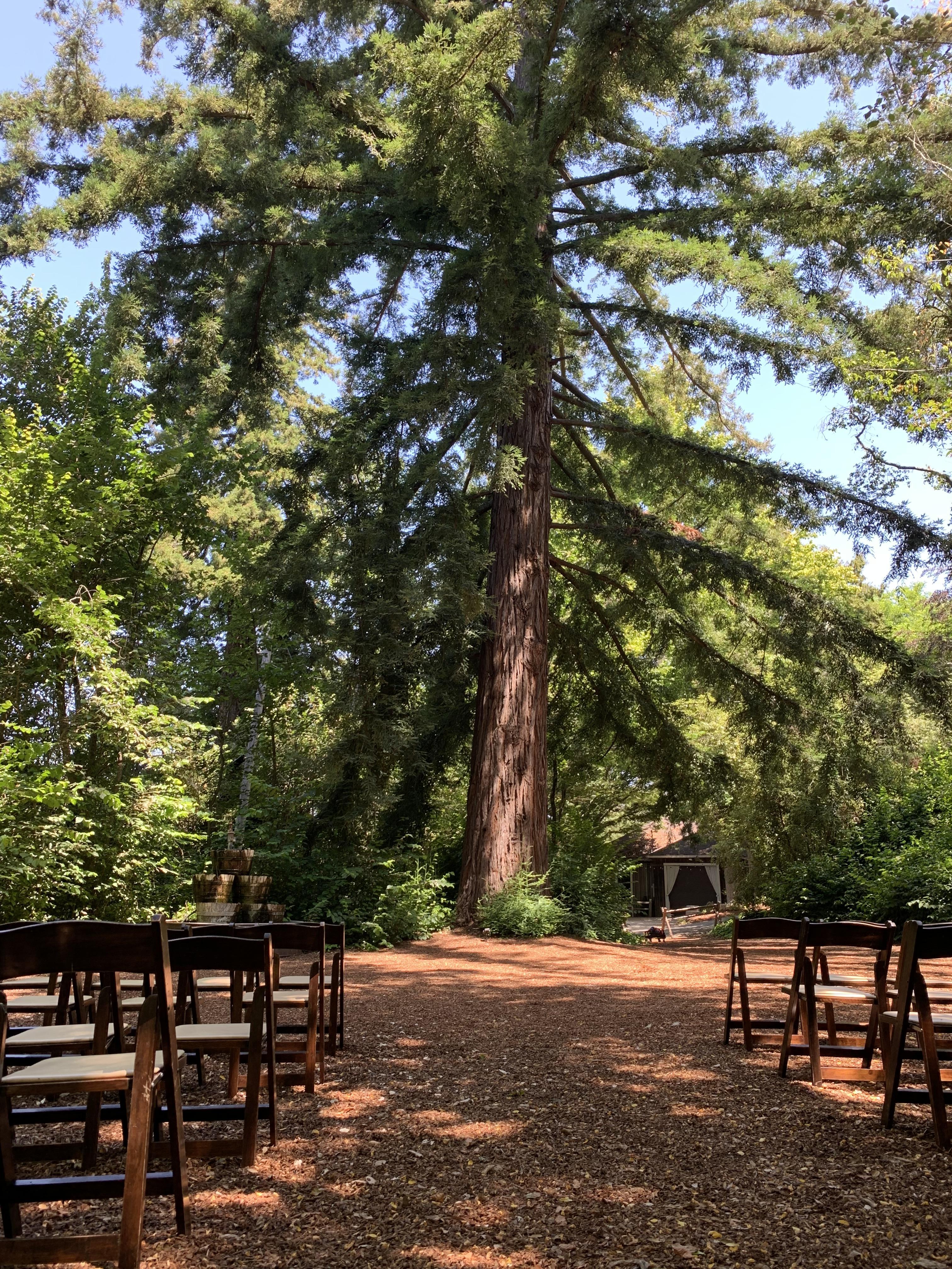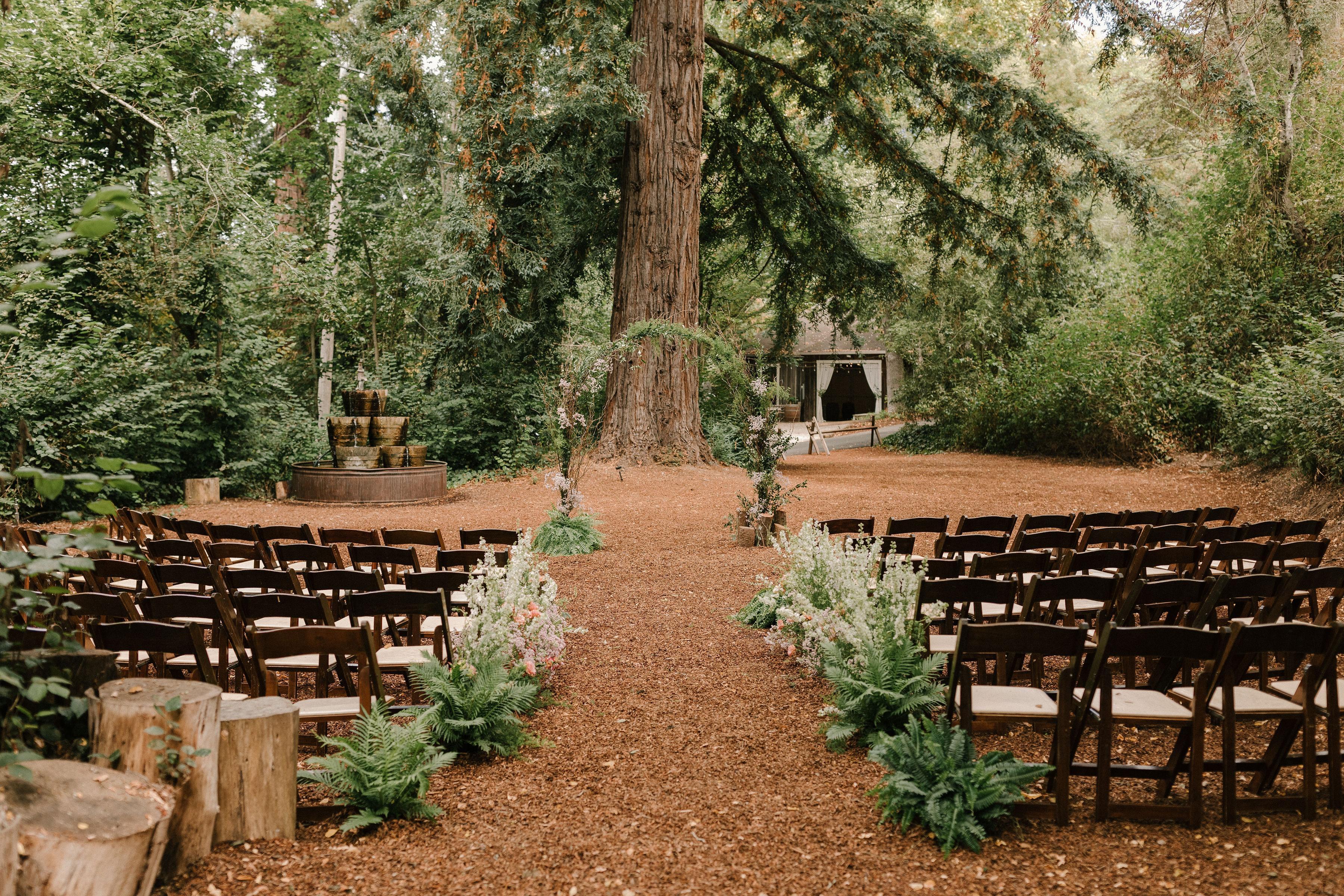 This space is surrounded by green and features a wine barrel fountain and a giant redwood tree. The redwood wood chip path makes for a gorgeous, outdoor aisle for the bride.
