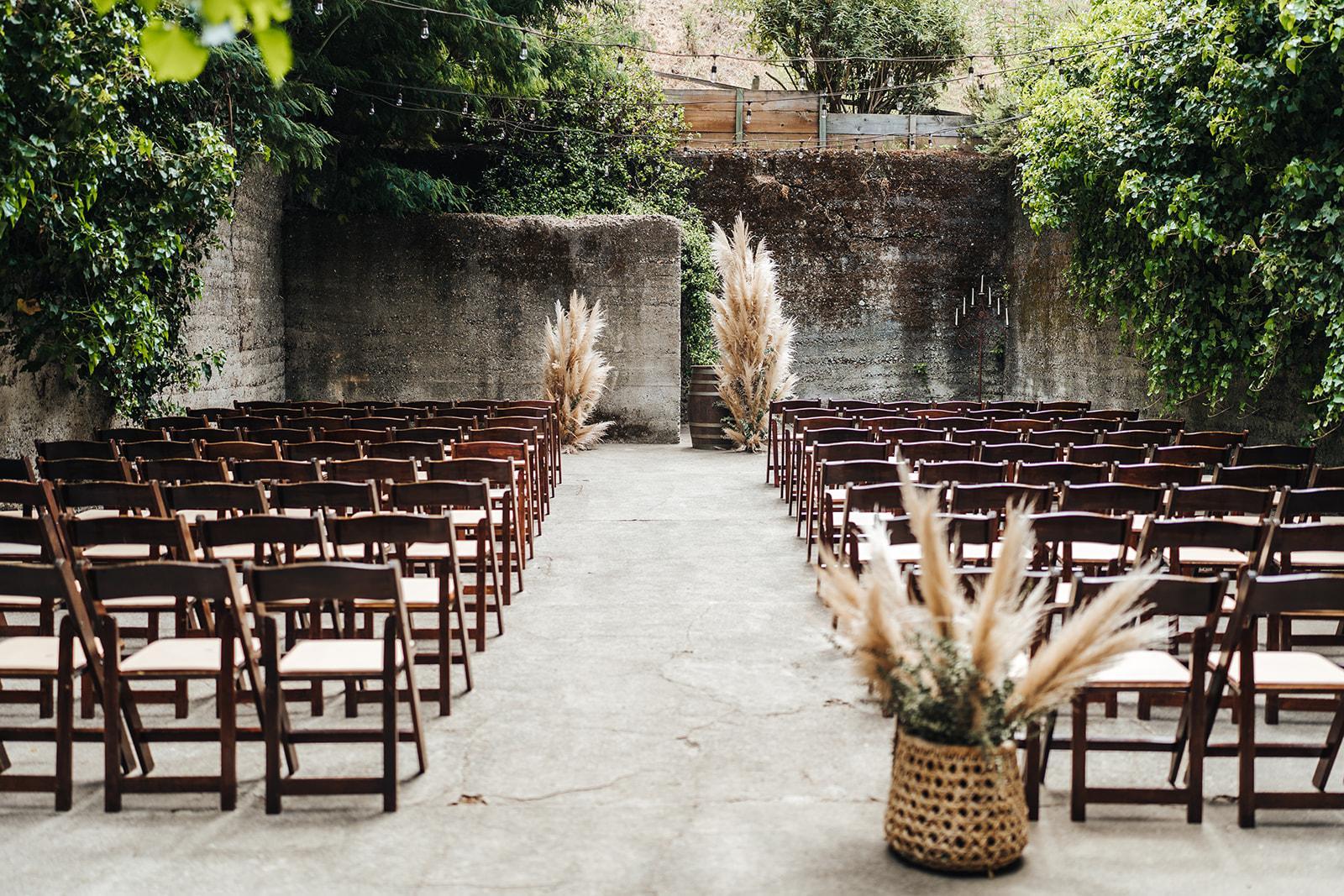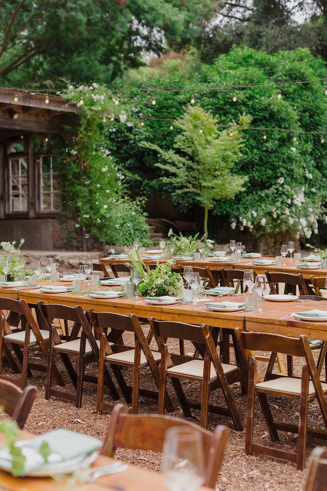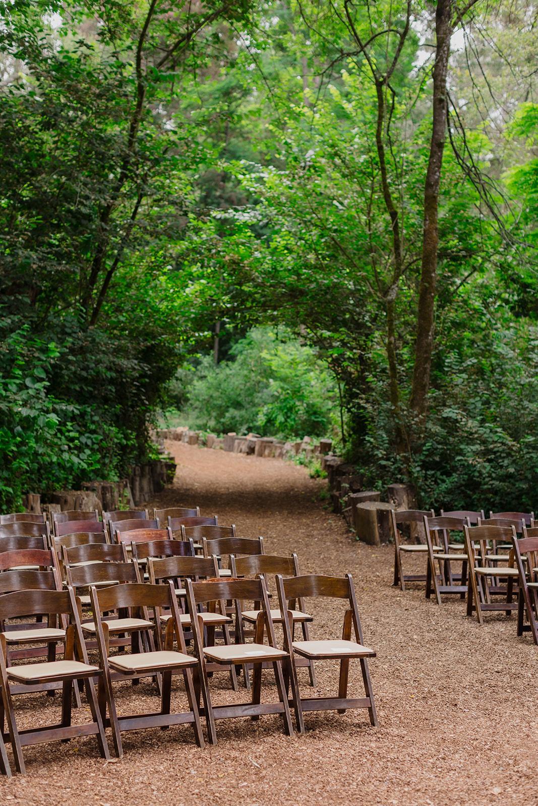 This space is surrounded by green and features a wine barrel fountain and a giant redwood tree. The redwood wood chip path makes for a gorgeous, outdoor aisle for the bride.