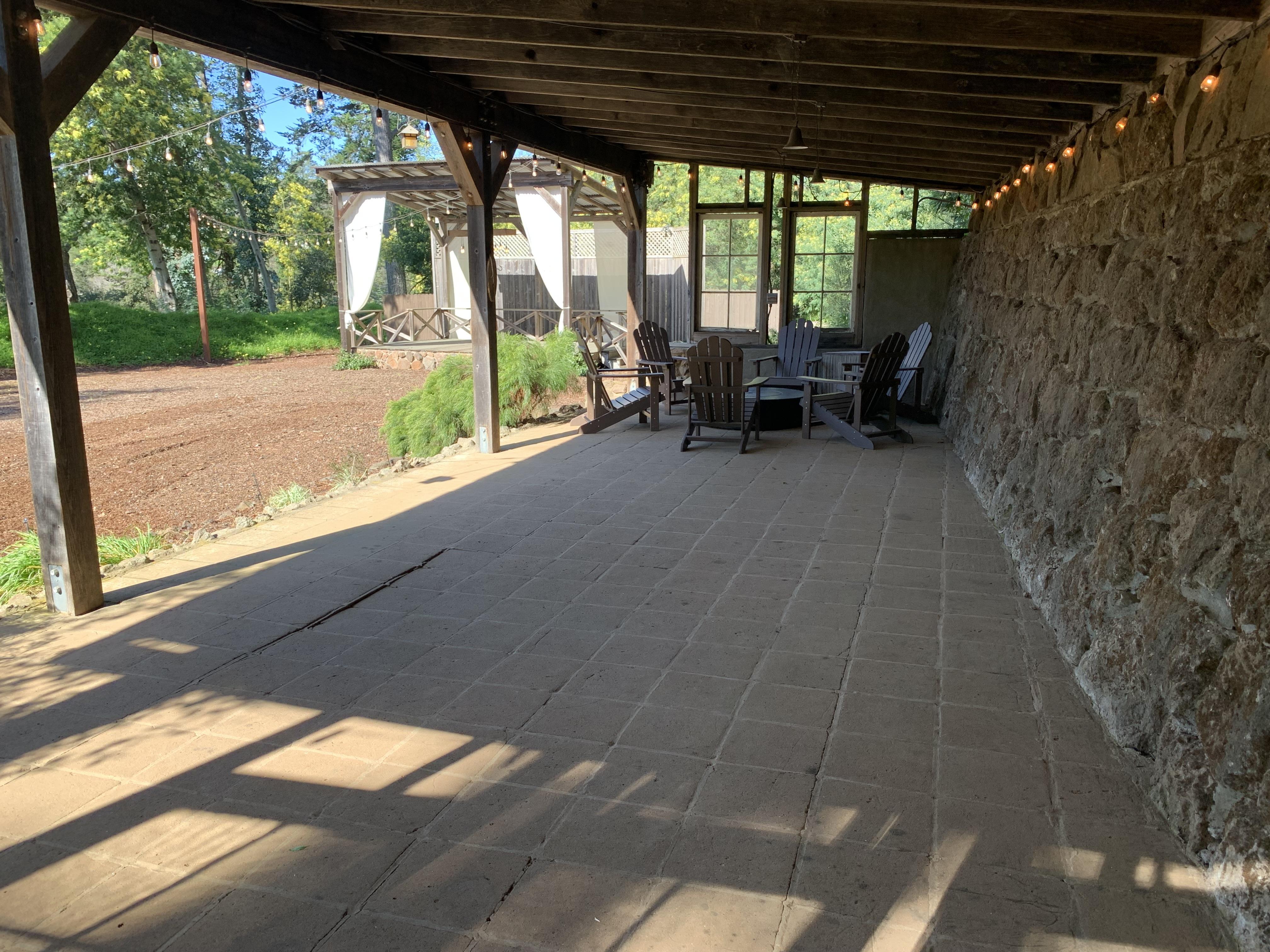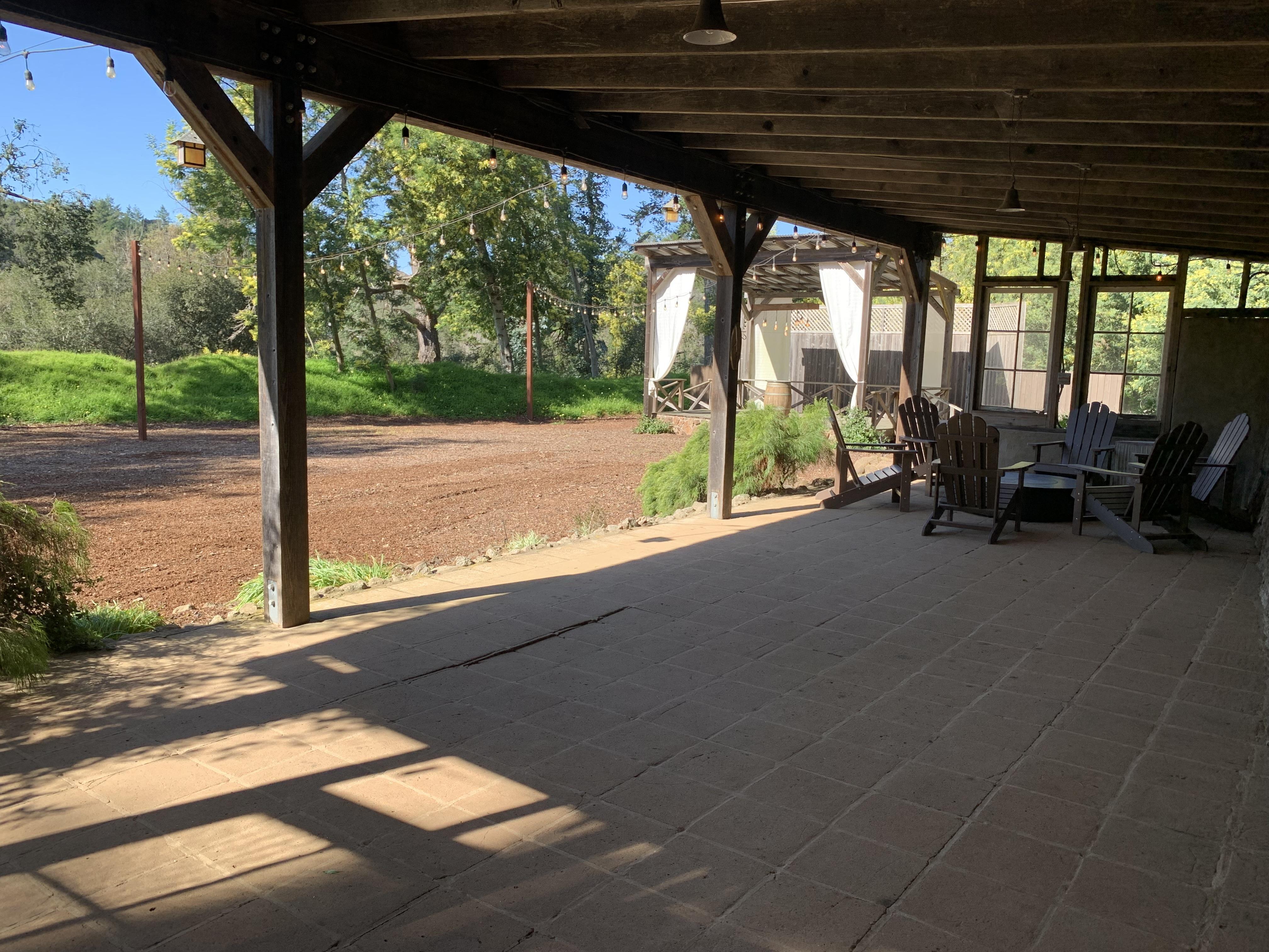 Cafe lighting, fire pit, mosaic bar, wine barrel cocktail tables, Sonos speakers