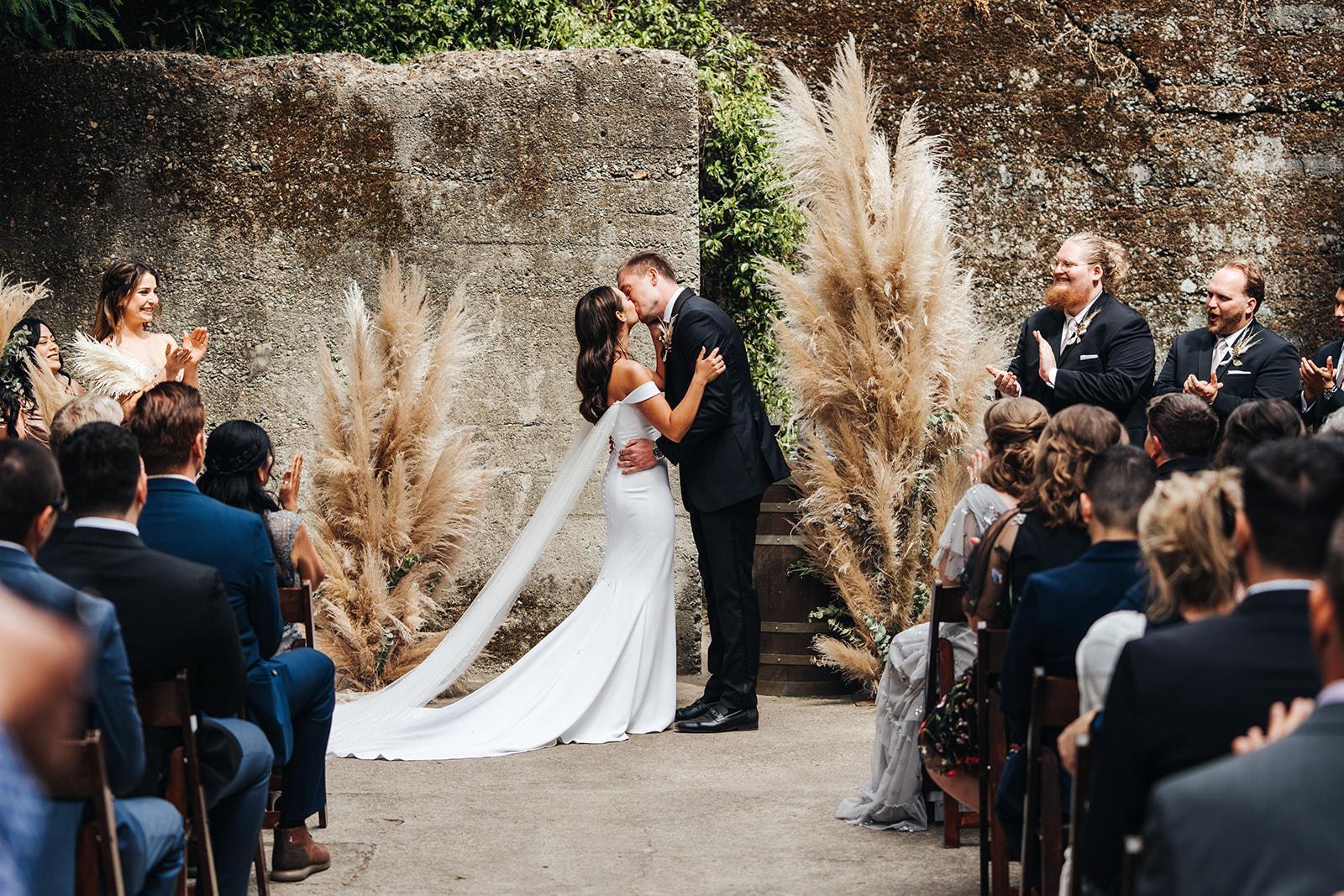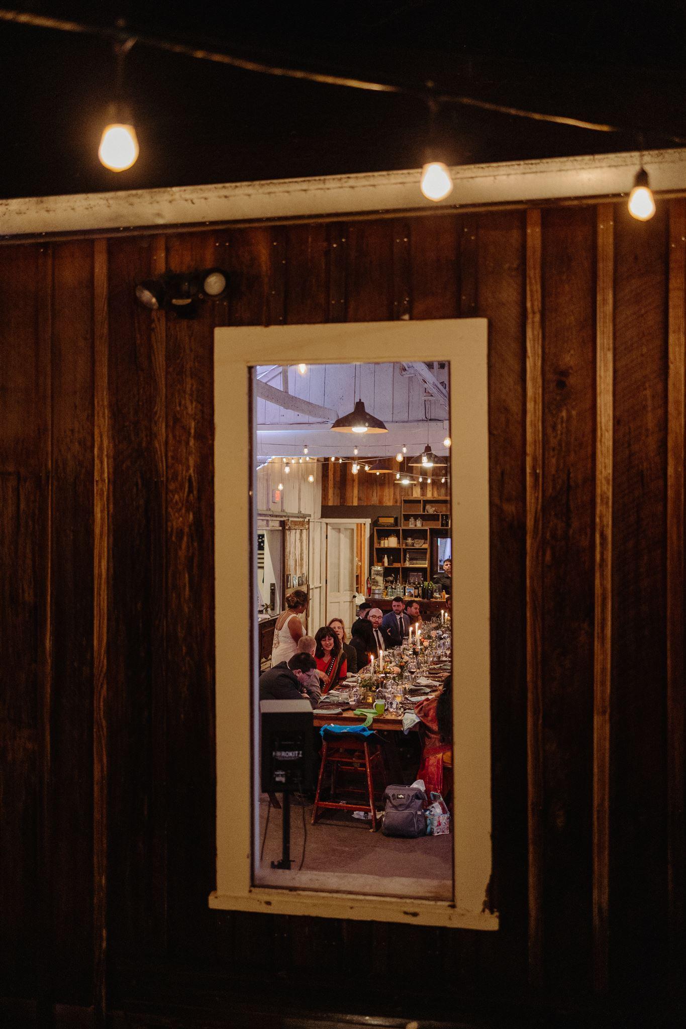 The door comes up after the ceremony and servers greet your guests with passed hors d'oeuvres and cocktails! This space is authentic and features a wood mosaic bar and foraged wood wall.