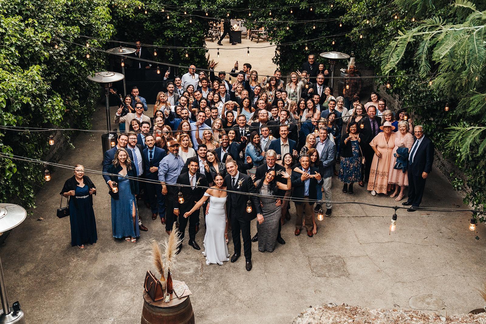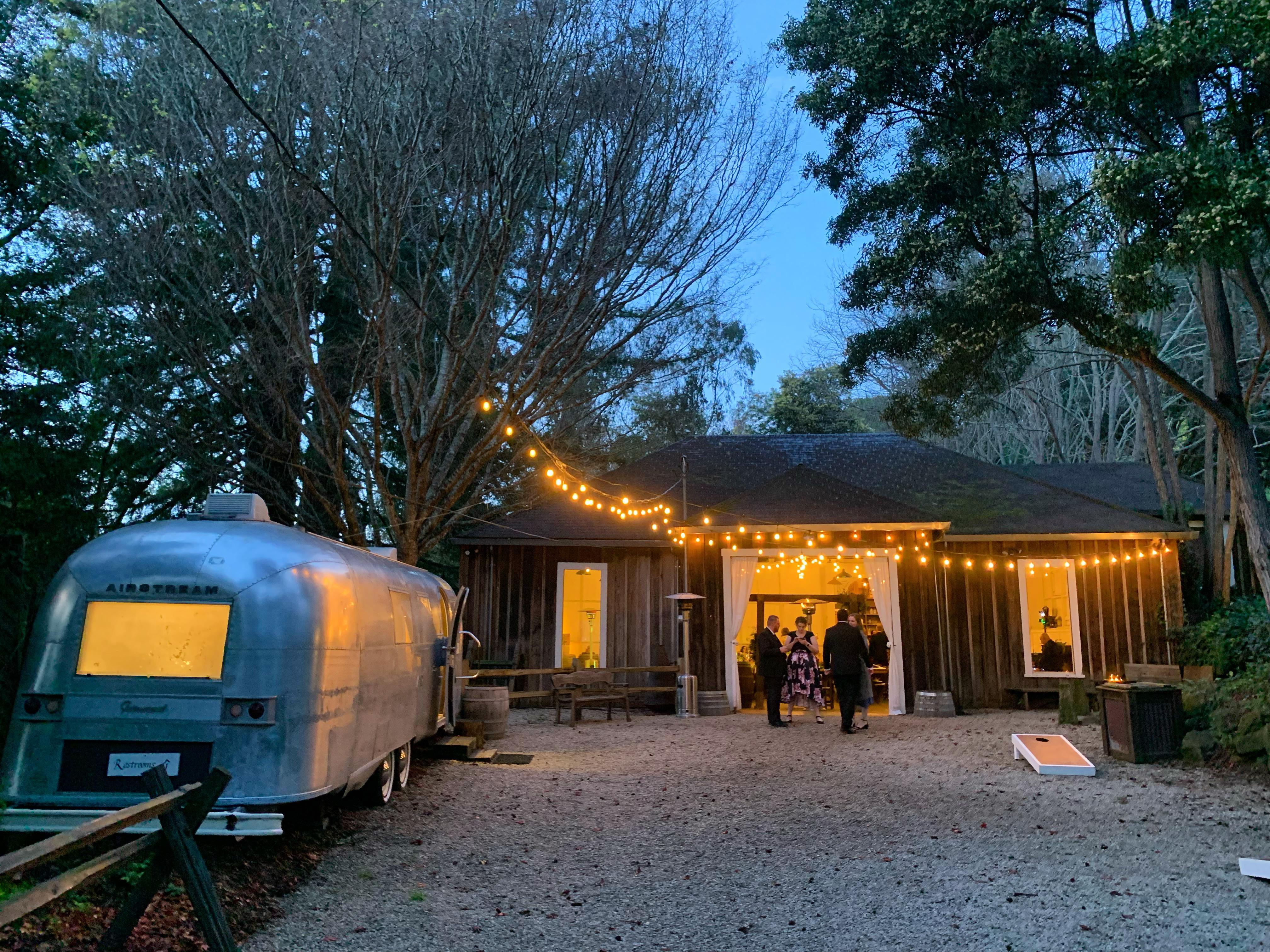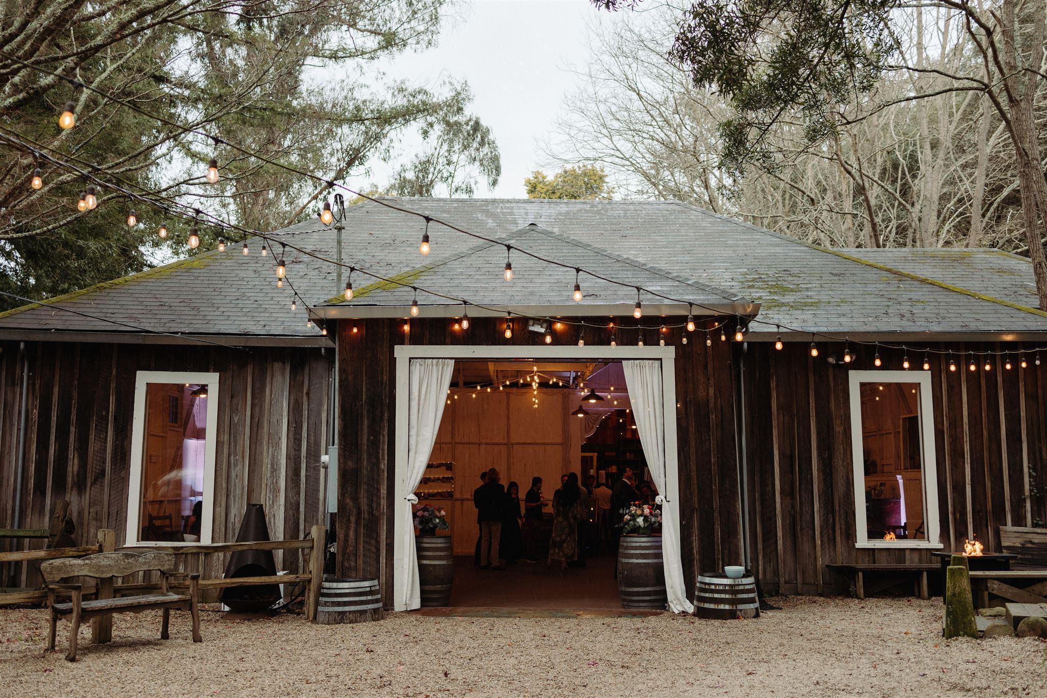 Cafe lighting on dimmers, rustic wood bar, fire pit lounge, wine barrel cocktail tables