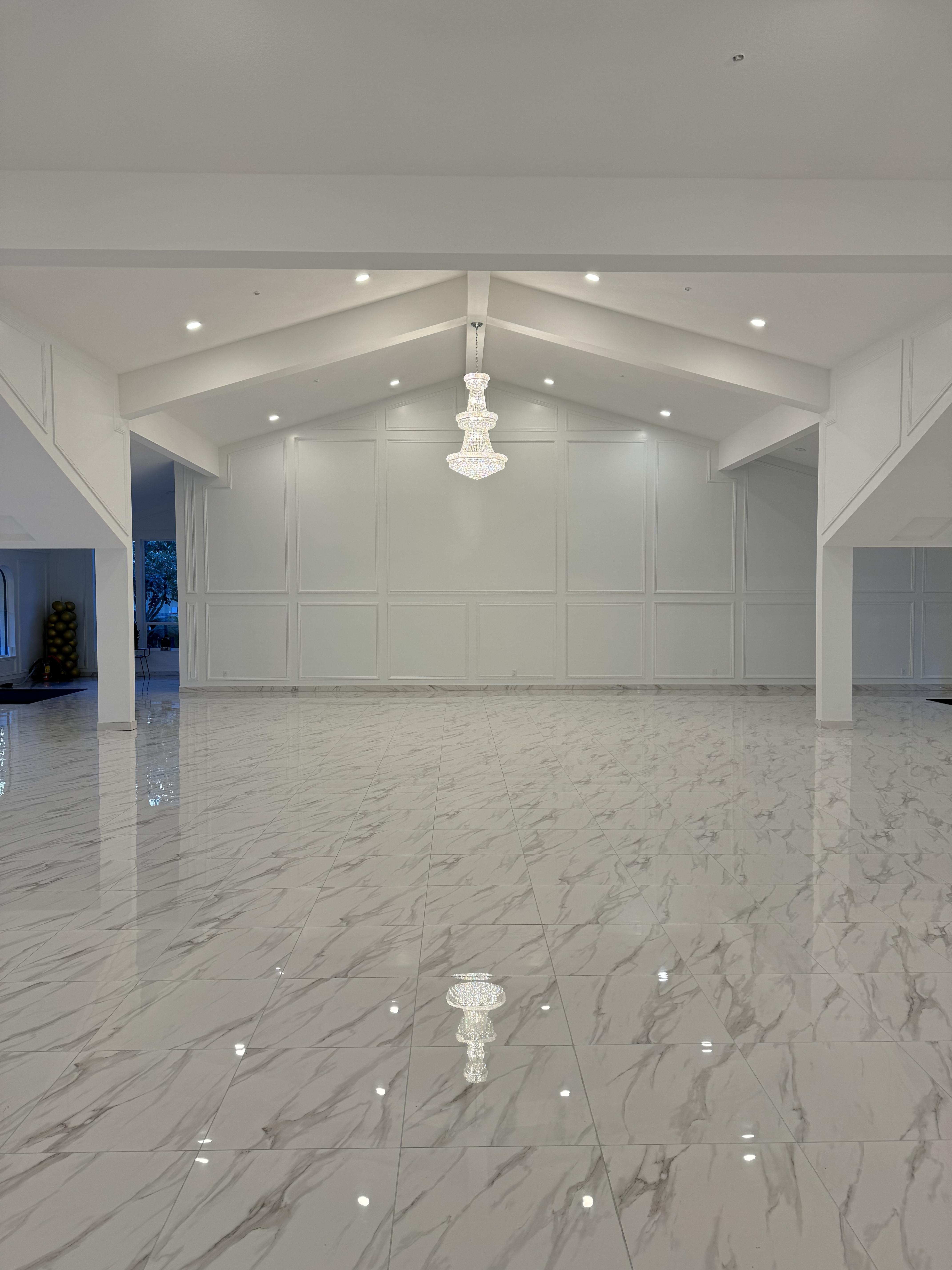 We offer a very luxurious and clean slate space with luxury chandeliers, luxury tile flooring, and paneling walls to ceiling!