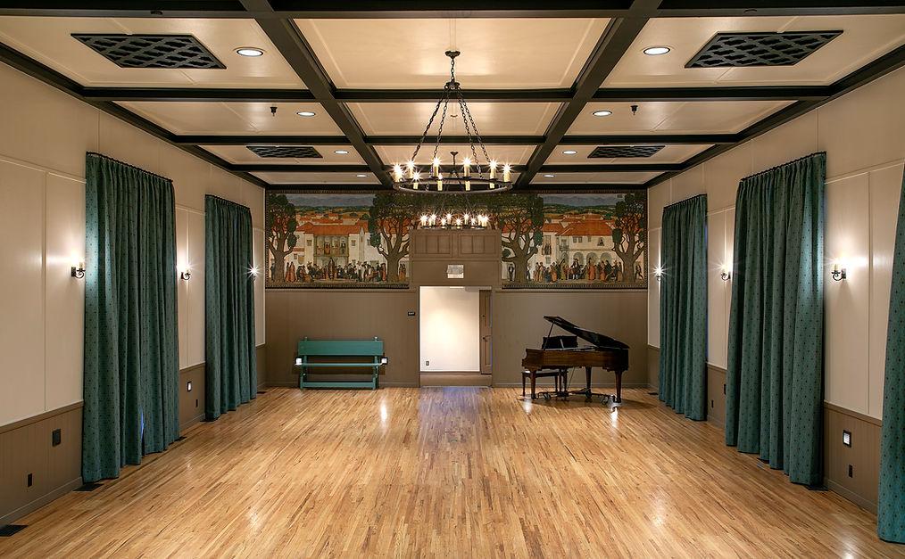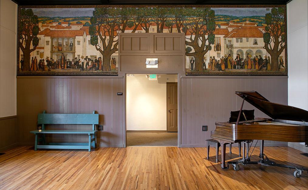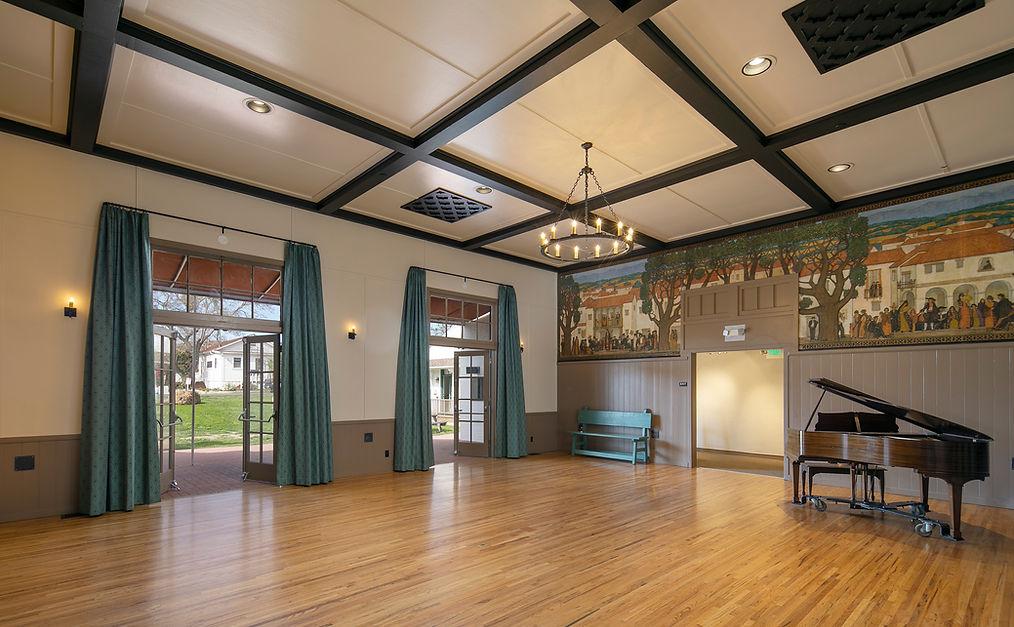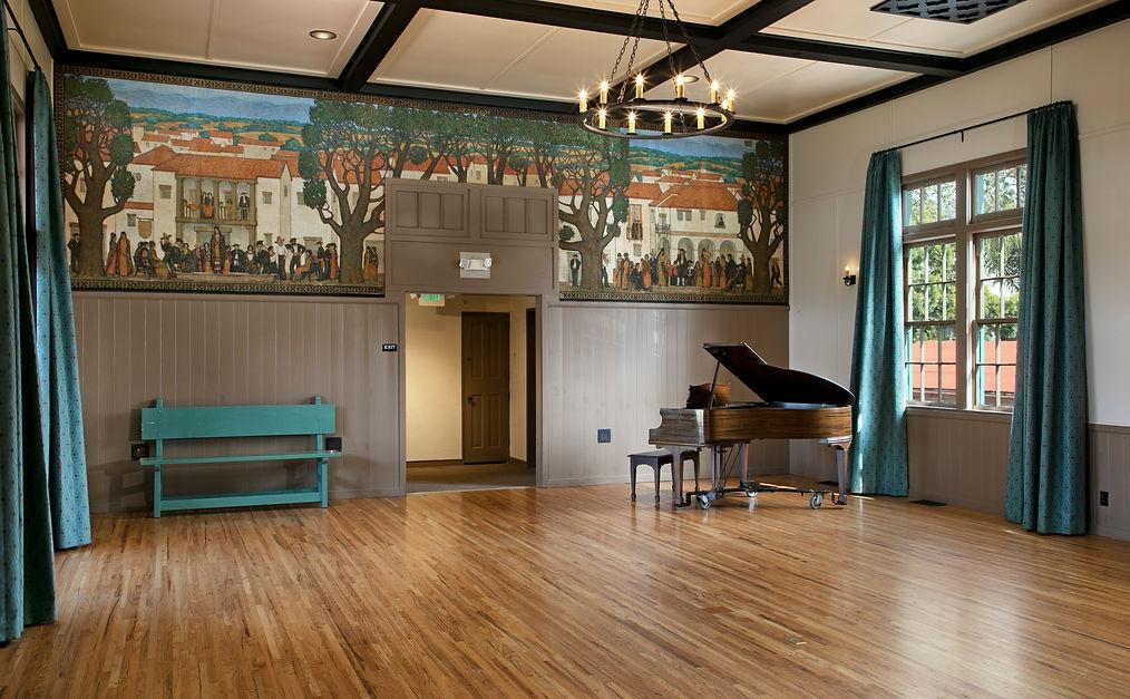 SBTHP recently completed the restoration of this special facility, which has had continuous community use since its construction as the Pueblo Theatre in 1925. The beautiful interior, with its recently restored original oak floors, stage, and a mural by American artist Ross Dickenson, is an ideal location for weddings, lectures, social gatherings, and theatre events. Built for the Santa Barbara School of the Arts, the Alhecama Theatre was originally used for drama, music, and dance classes. Alice Schott purchased the theatre in 1939 when the school struggled due to the Great Depression. She renamed it the Alhecama after her daughters Alice, Helen, Catherine, and Mary Lou. Schott deeded the school property to the City of Santa Barbara School District in 1945 and it was used jointly by the Adult Education program and Santa Barbara Junior College, later renamed Santa Barbara City College, for many years. It was purchased by the State of California in 1982 to become part of El Presidio SHP.