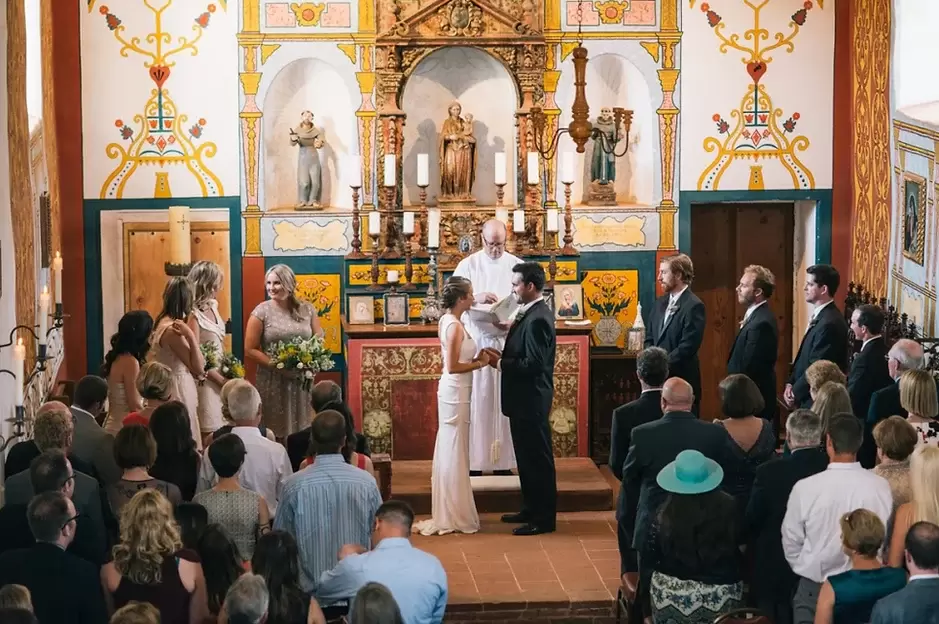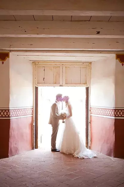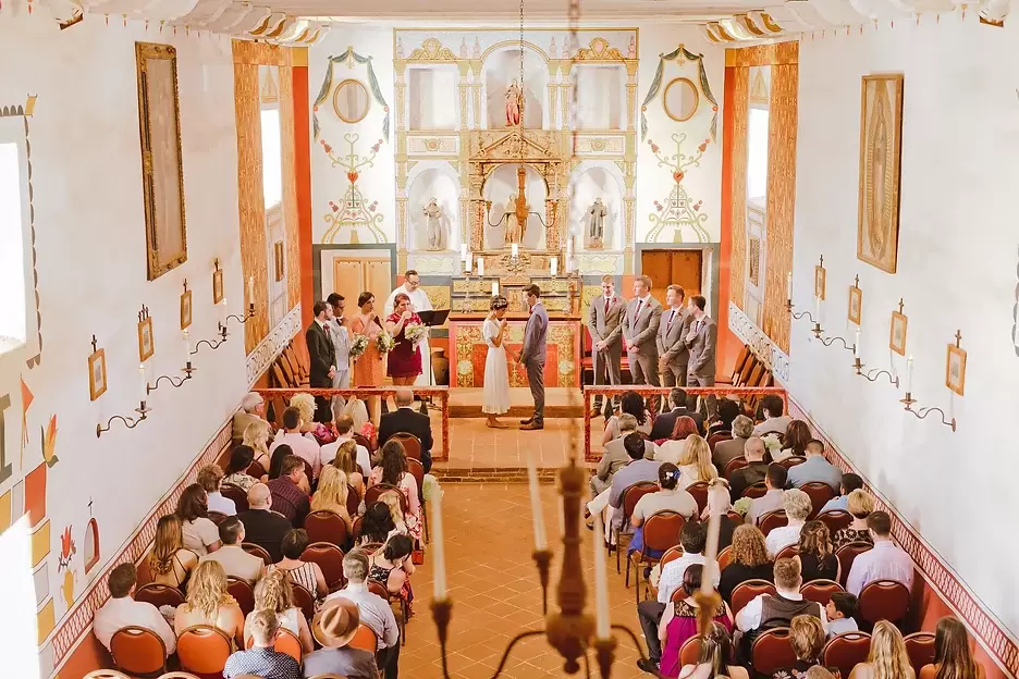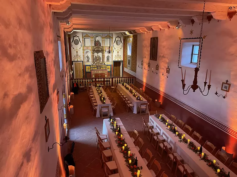 The whitewashed walls are punctuated by paintings and candle sconces, and the altar is dressed with a spectacular reredos (altar piece), altar frontal, and candlesticks. Period santos fill the niches. The interior walls and altar rail are painted to represent marble or tapestry. A small balcony overhanging the interior front of the building adds charm and utility and can be used to house vendors such as musicians or photographers. The acoustics are ideal for any genre of music, overall making this the perfect place for all of life’s special celebrations and events.