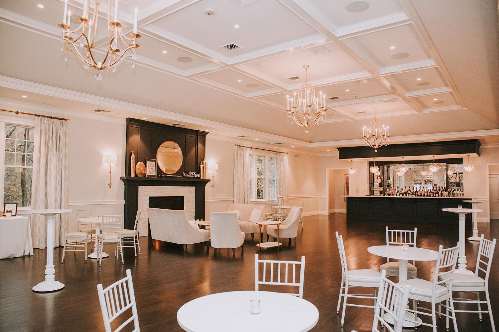 This newly constructed, separate cocktail space boasts a cozy fireplace, gold chandeliers, and a quartz bar top juxtaposed by a variety of rich textures and stunning millwork. It's the perfect location for your guests to enjoy some libations and delicious hors d'ouevres during cocktail hour, keeping the main ballroom under wraps until you're ready to make your grand entrance for the reception.