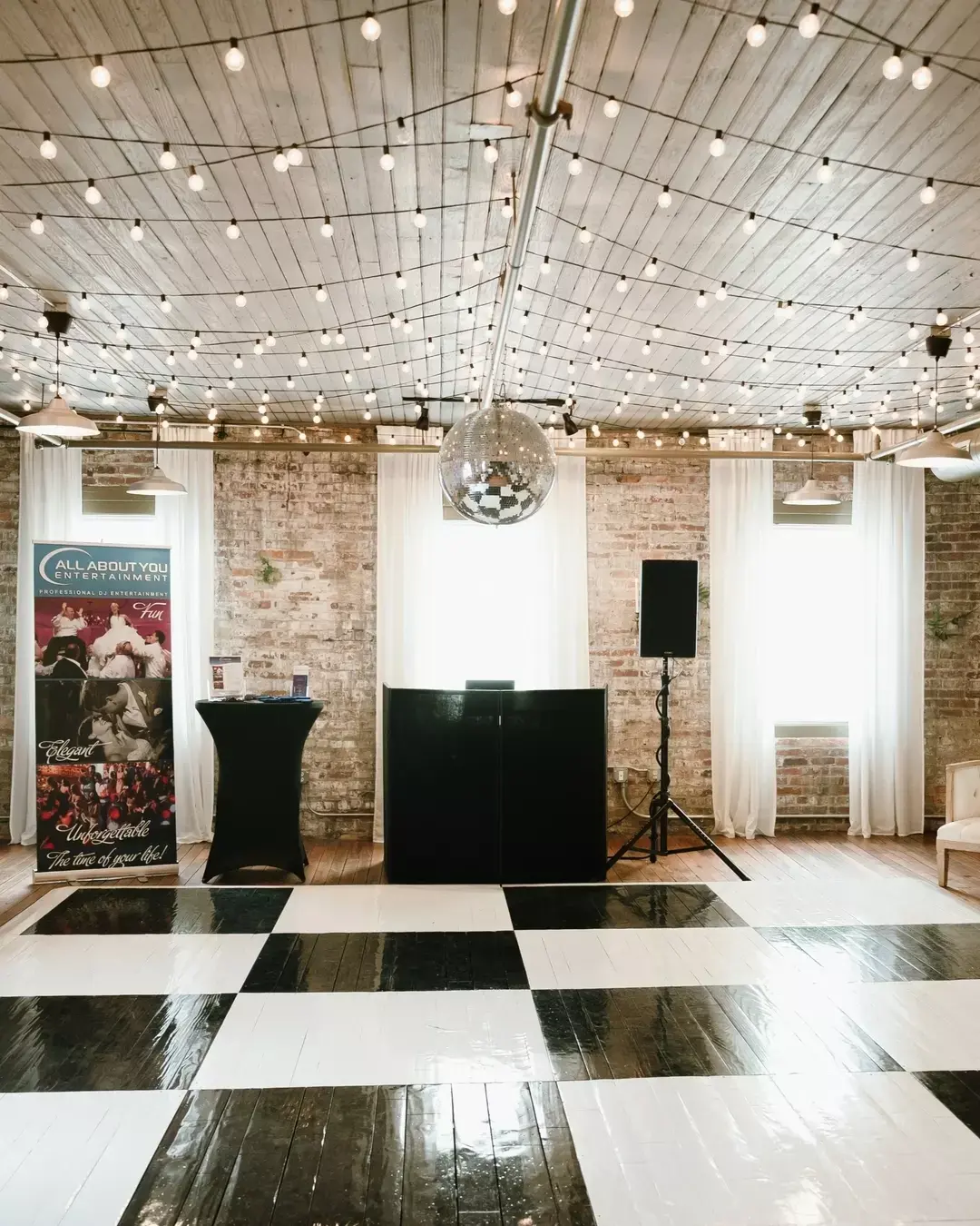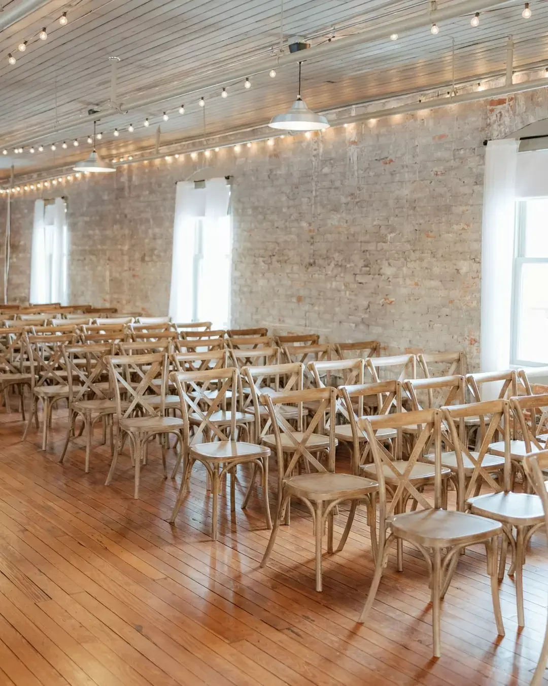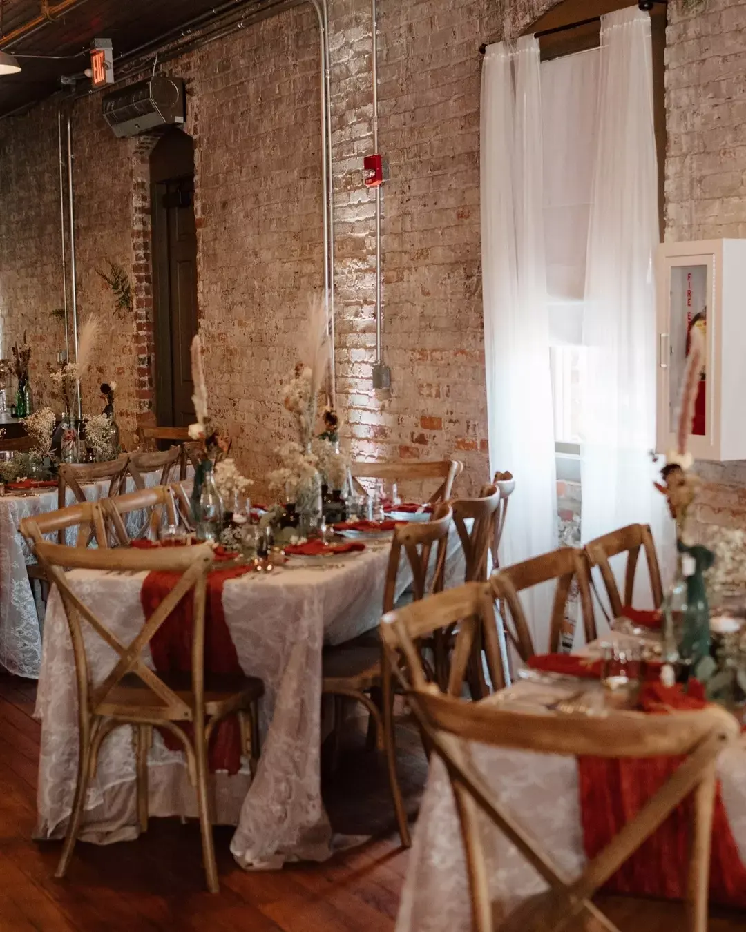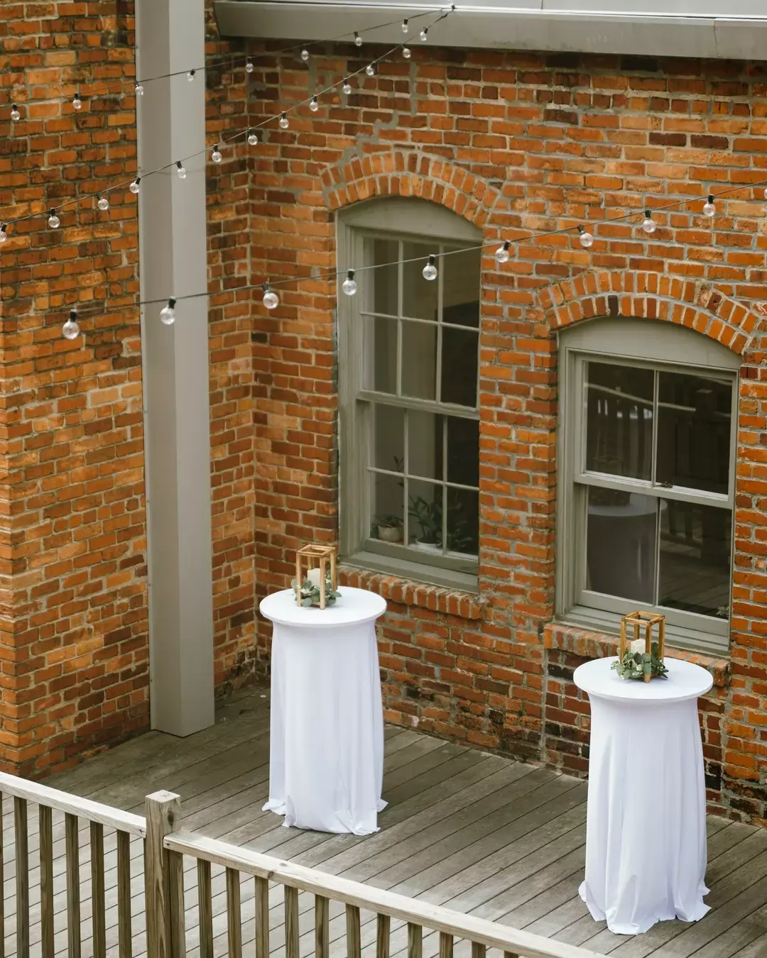 Savannah Bottle Works is a spacious, 9,000 sq. ft. venue with a capacity for 200 people, offering a large, open floor plan that can be customized for both your ceremony and reception. The primary space features high ceilings crisscrossed with string lighting, large industrial windows draped with sheer white curtains, and a mix of exposed brick and painted white walls. This combination allows the space to feel bright and airy for a sun-drenched ceremony or romantic and intimate for a reception. The main area showcases a stunning blend of rustic and elegant styles. Whether you choose to highlight the industrial brick for a dramatic setting or the smooth white walls for a classic look, the original hardwood floors anchor the space. Flexible layouts can easily transition from a seated ceremony to a lively reception with a checkered dance floor and bistro-style seating. A small outdoor deck is available for high-top cocktail tables or a breath of fresh air during your event.
