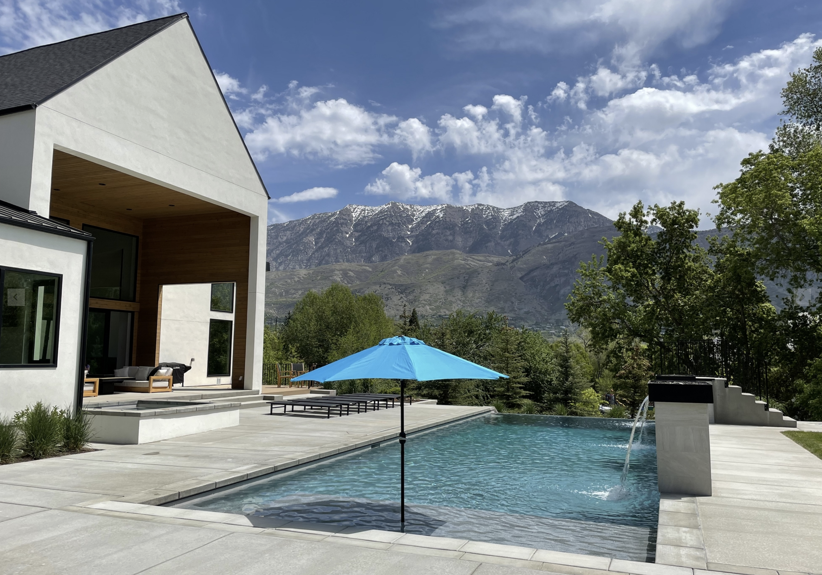 This space features a breathtaking backdrop of majestic mountains, a beautiful covered patio and a 50x18ft infinity edge pool. Not to mention, the pools amazing features, 3 waterfalls and 2 fireplaces on top of the falls.