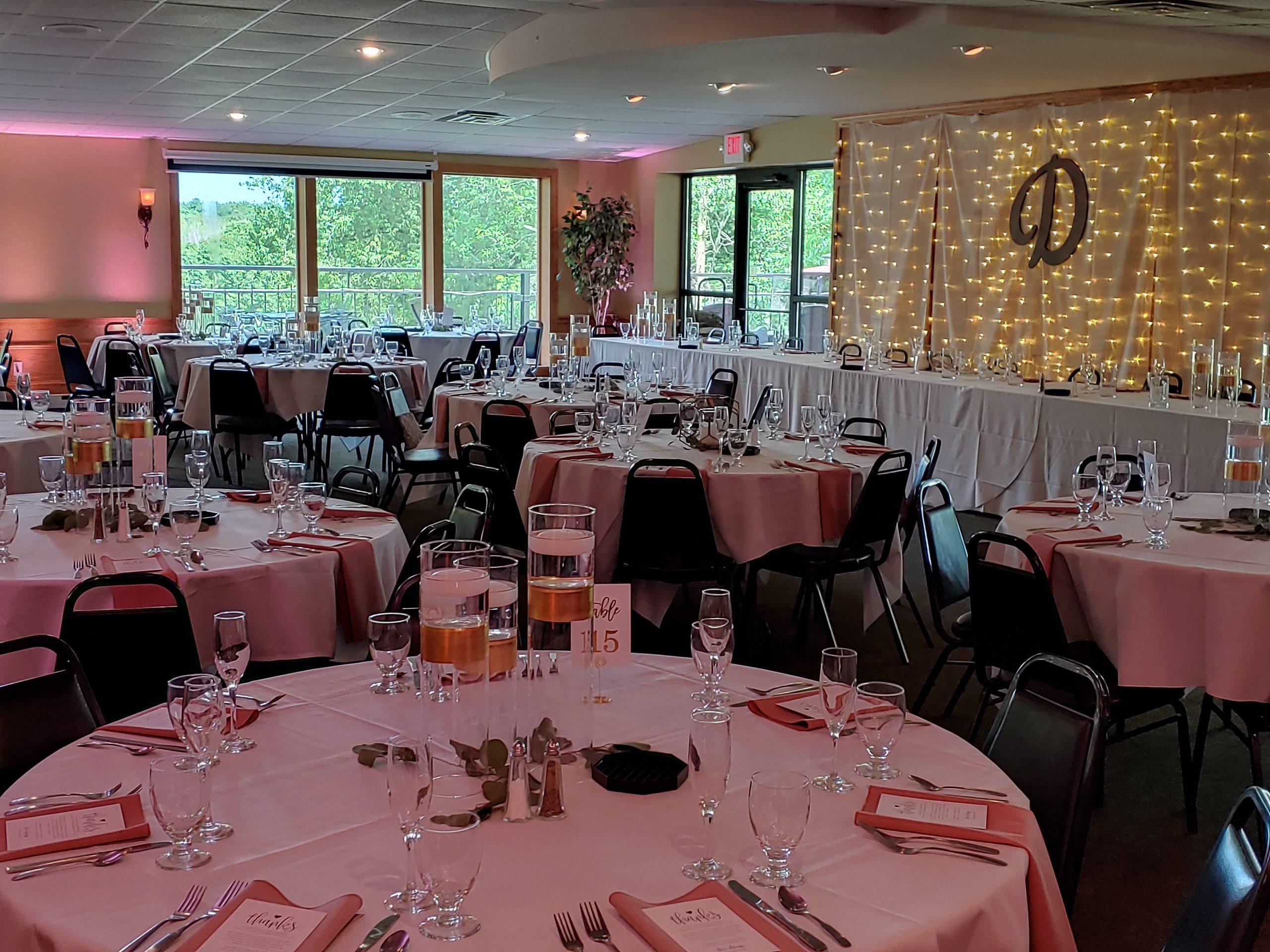 Scenic View is the perfect place to host your wedding or special event! The natural décor and stunning views offer a versatile space for events ranging from a small get together to a formal gala. The private space accommodates up to 250 people. The room features a large full service bar, stone fireplace, panoramic views of the golf course, spacious dance floor, large covered patio with inviting lounge furniture and fire-pit, and a second deck off the bar. Host your ceremony on our 1st tee box and let the golf course create a beautiful backdrop! Our dedicated staff will work directly with you to make your event perfect. Contact us to see how we can make your dream event a reality!
