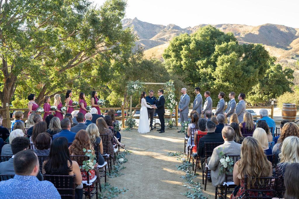With multiple spaces for couples to use for an extensive outdoor celebration. Here couples can exchange vows under a decorated arbor with the surrounding mountain views as their backdrop. The Ranch has a stylish get-ready room. Its interior has been renovated and restyled, creating a space that is light, airy, imbued with a mid-century desert chic. The surrounding area offers a bounty of settings ideal for a dramatic wedding or event including the extensive oak groves which envelop the property.
